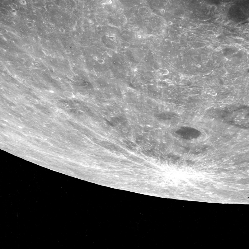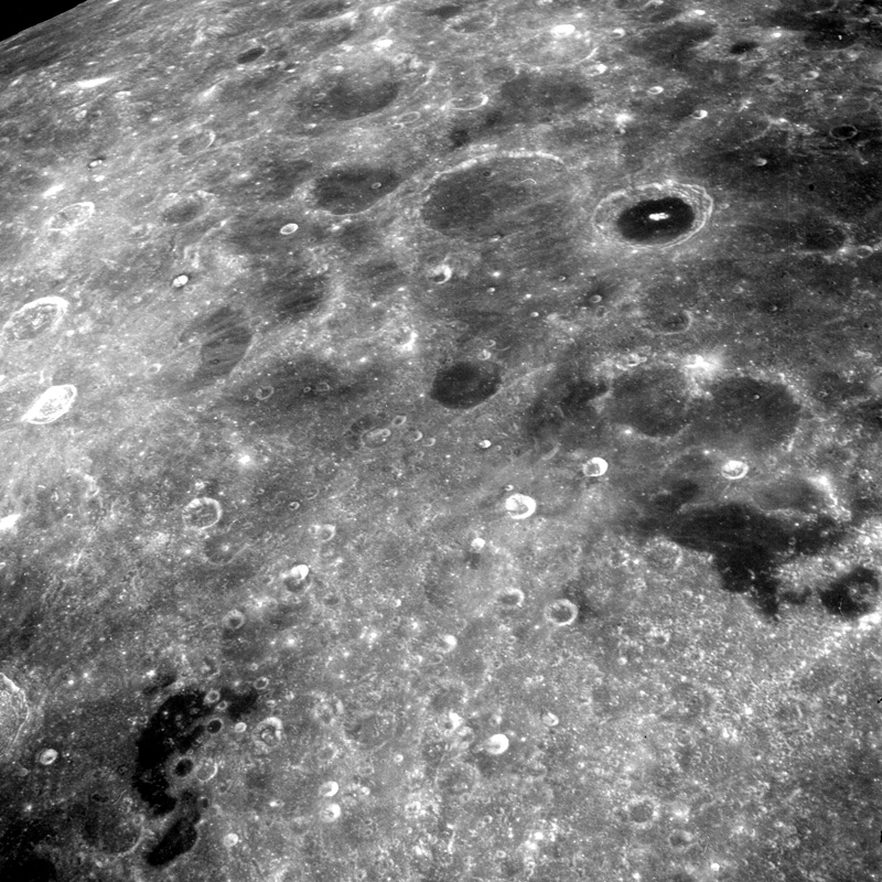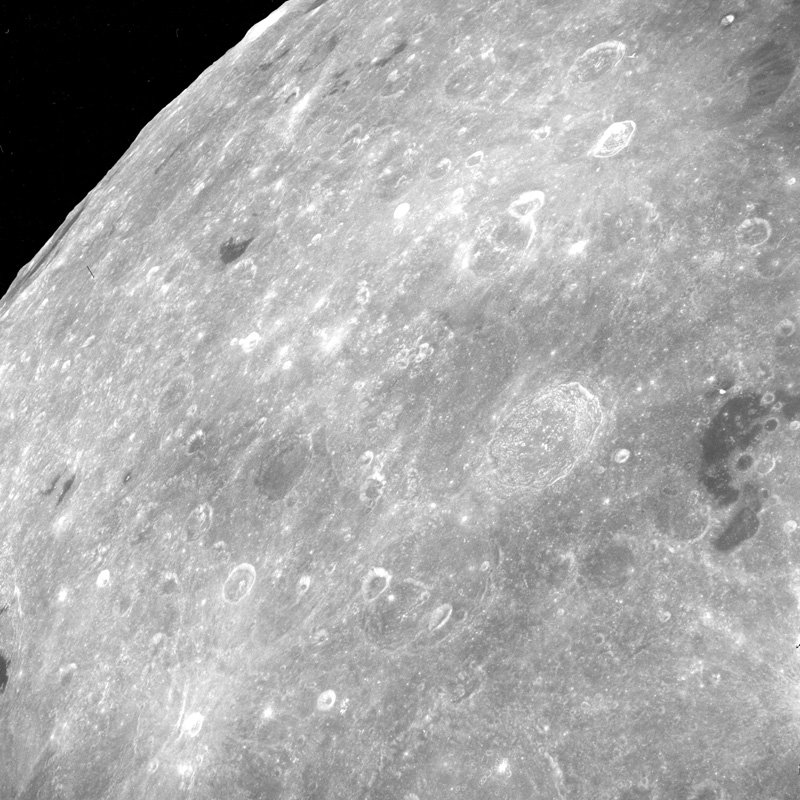AS08-12-2136 237 kB or 1,968 kB Southeastern rim of Langemak. This is around the start of Borman's 180° roll maneuver. Image credit: Image Science and Analysis Laboratory, NASA-Johnson Space Center. |