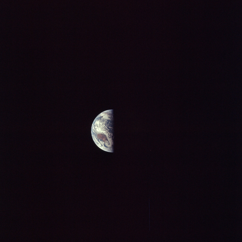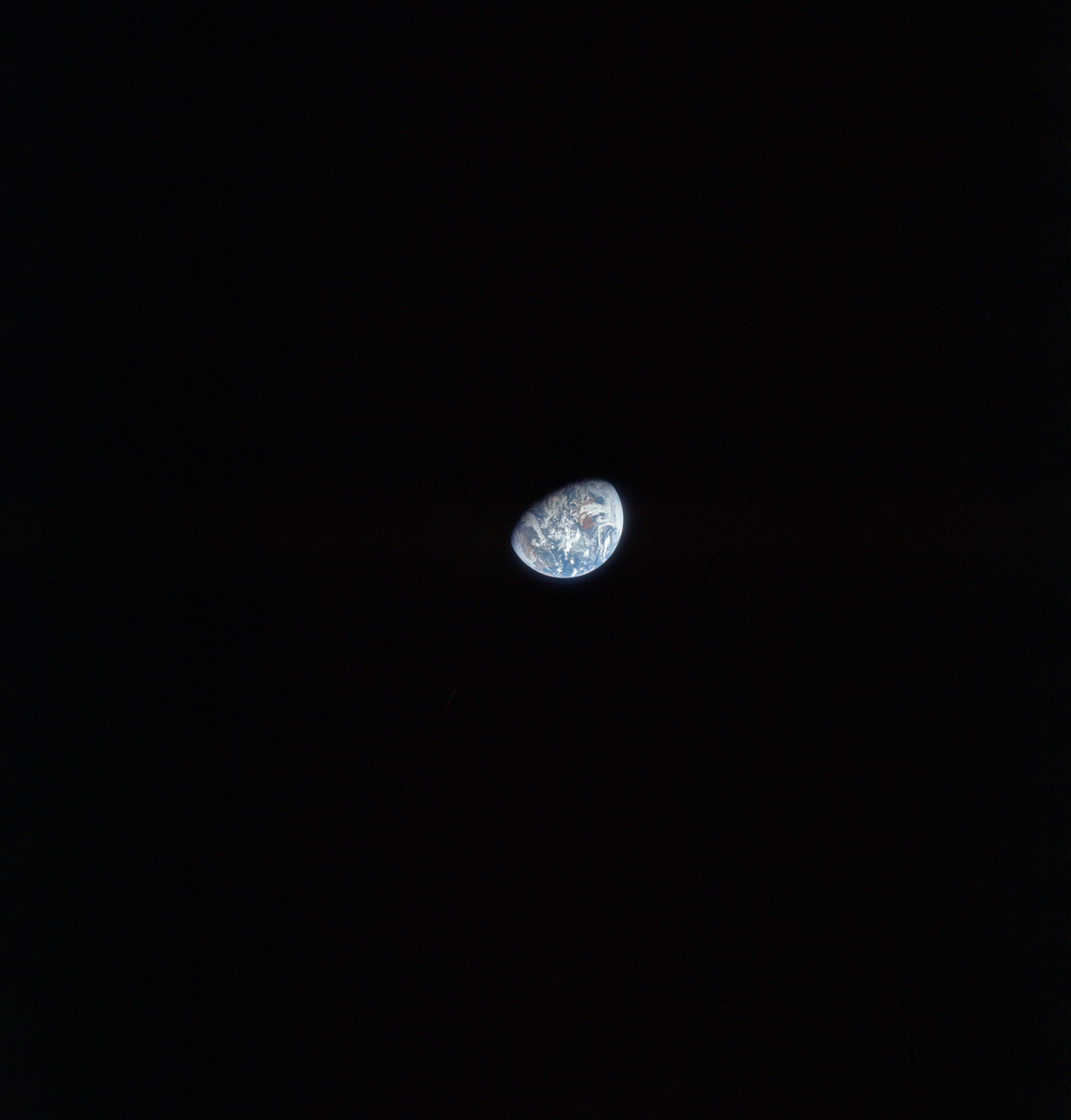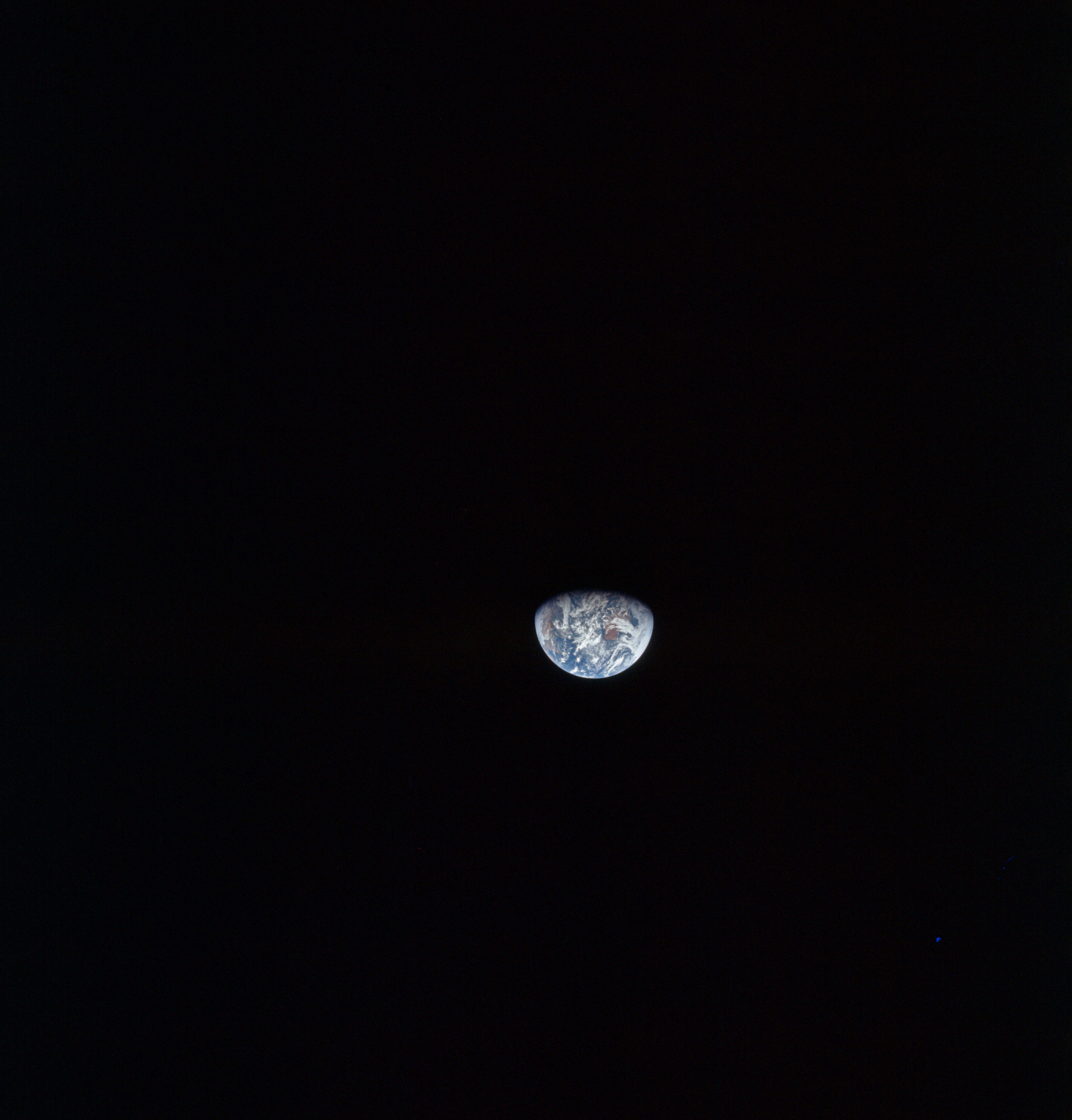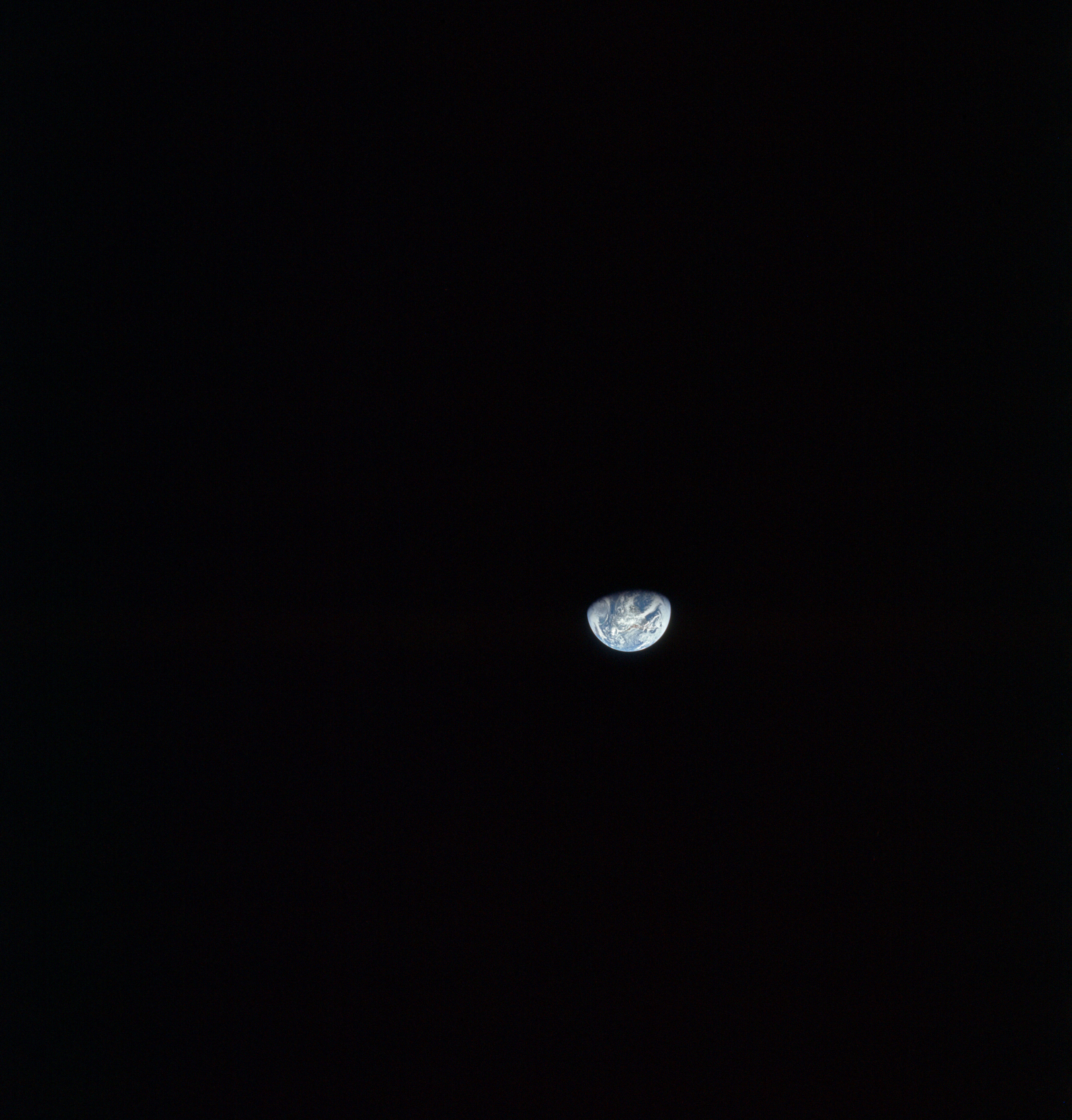 AS08-16-2593 173 kB or 9.79 MB The first whole Earth image taken by a human, likely Bill Anders. Close study suggests that this image was taken at 004:36:00 at a distance of about 27,000 km. South is approximately to the right and the image favours South America. Central America and Florida is towards the bottom of the image with the west coast of Africa at top left. Image credit: Image Science and Analysis Laboratory, NASA-Johnson Space Center. |