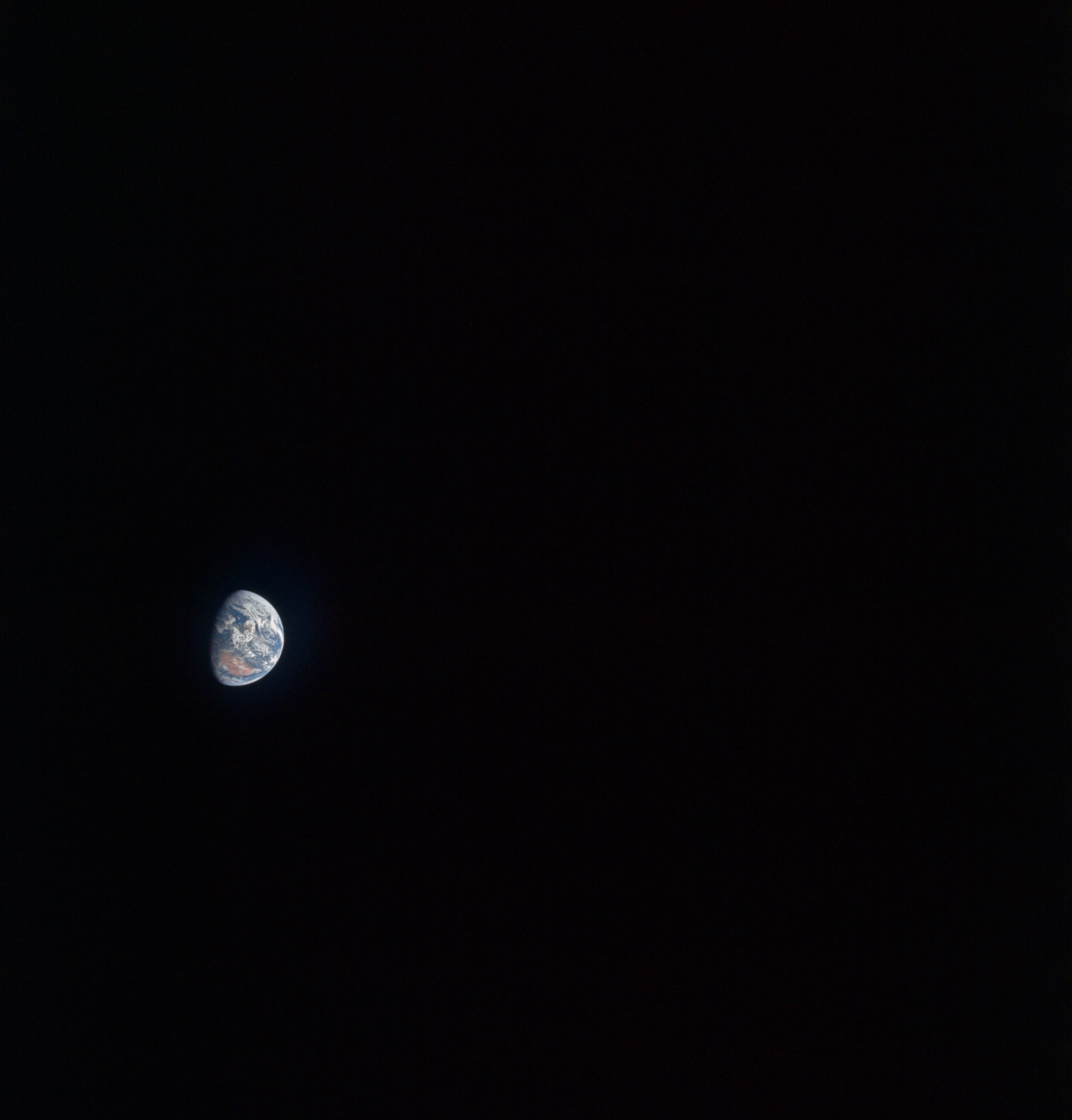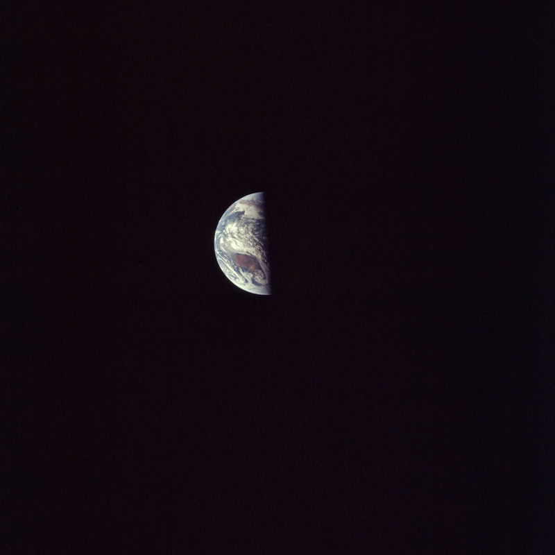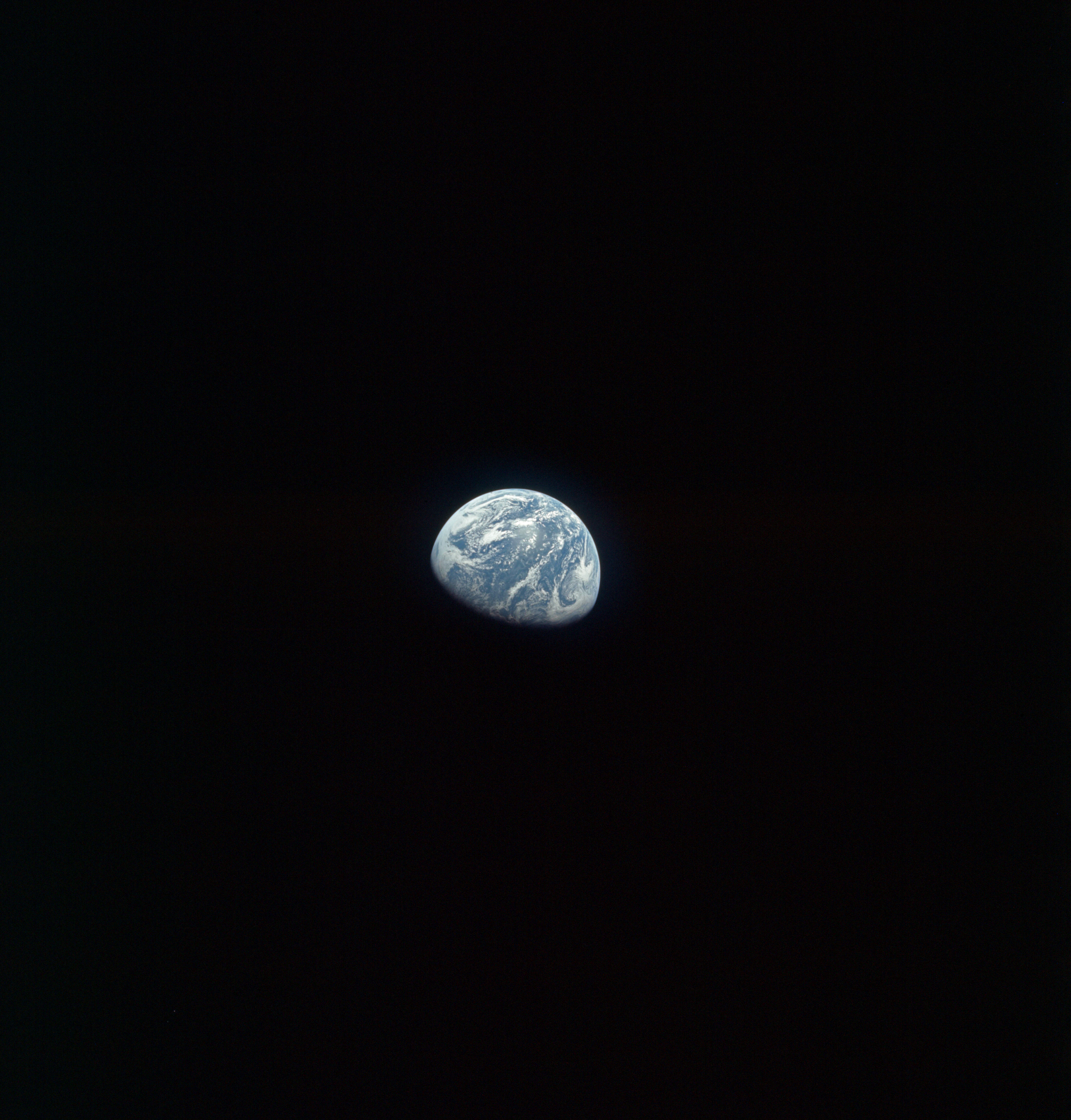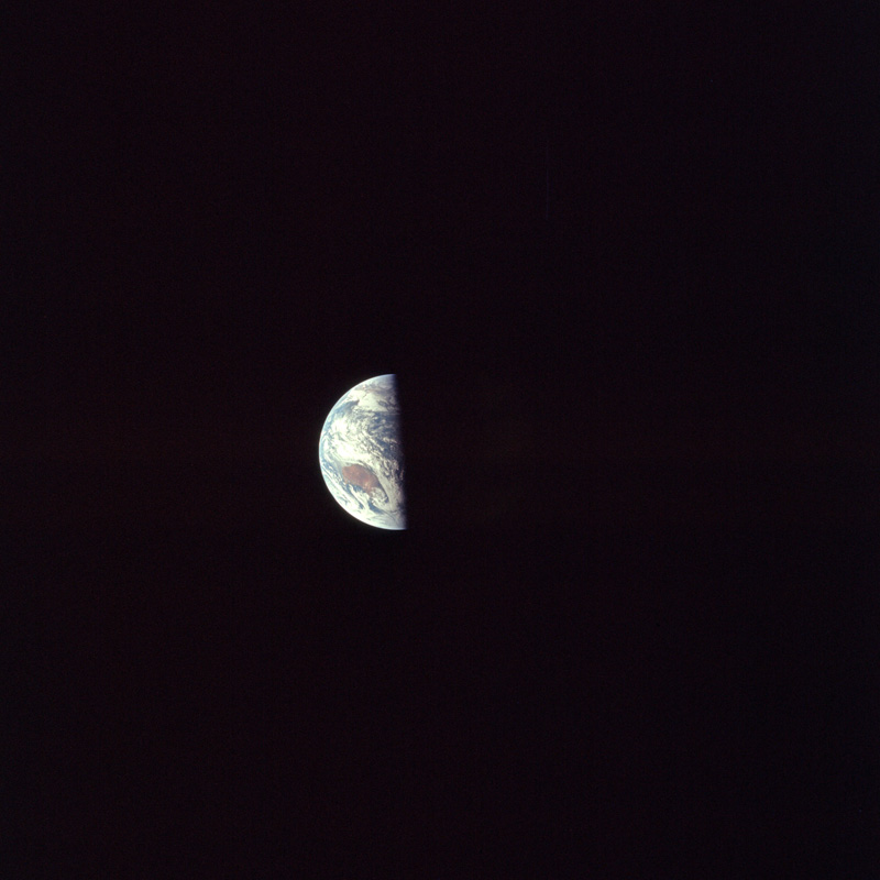 AS08-16-2593 173 kB or 9.79 MB The first whole Earth image taken by a human, likely Bill Anders. Close study suggests that this image was taken at 004:36:00 at a distance of about 27,000 km. South is approximately to the right and the image favours South America. Central America and Florida is towards the bottom of the image with the west coast of Africa at top left. Image credit: Image Science and Analysis Laboratory, NASA-Johnson Space Center. |