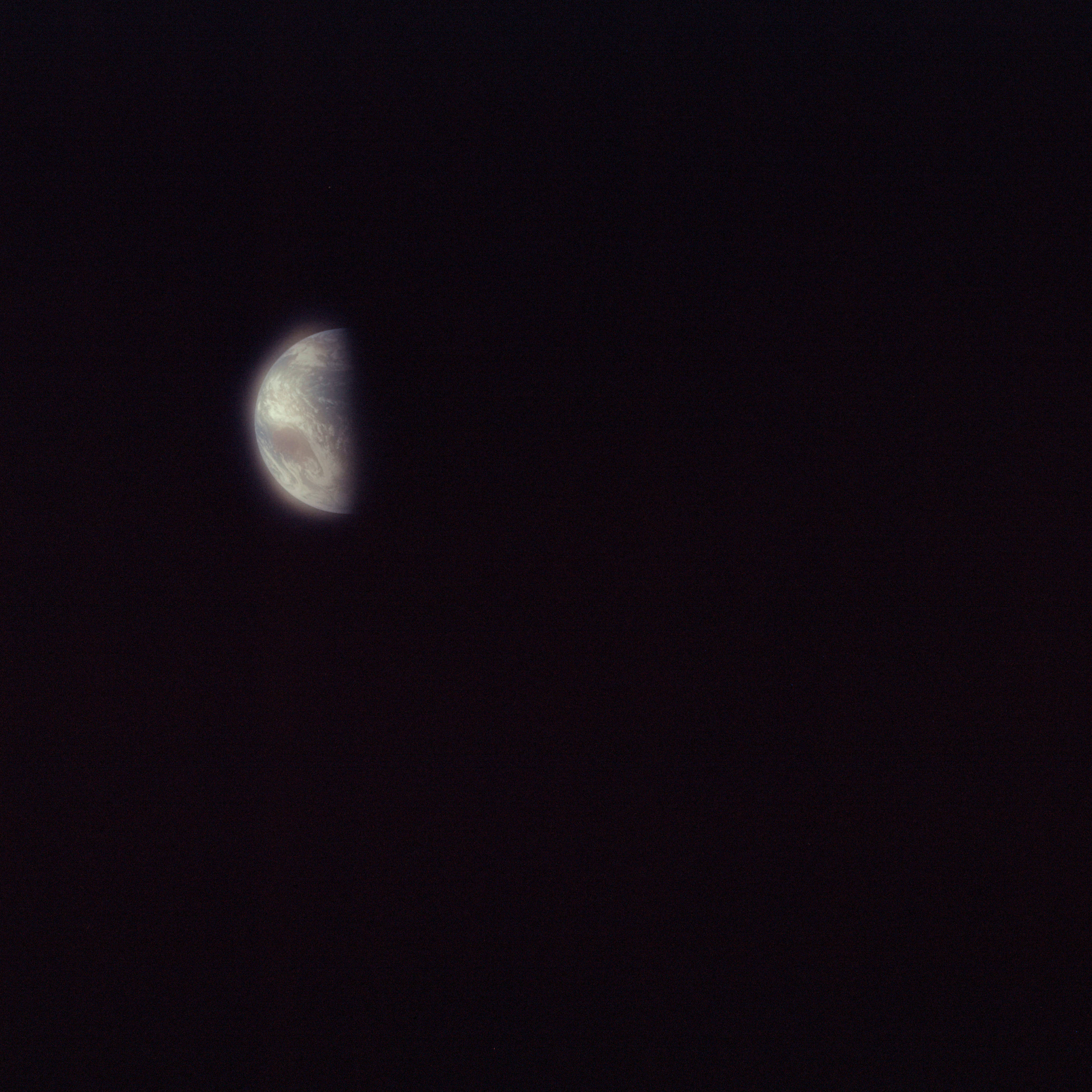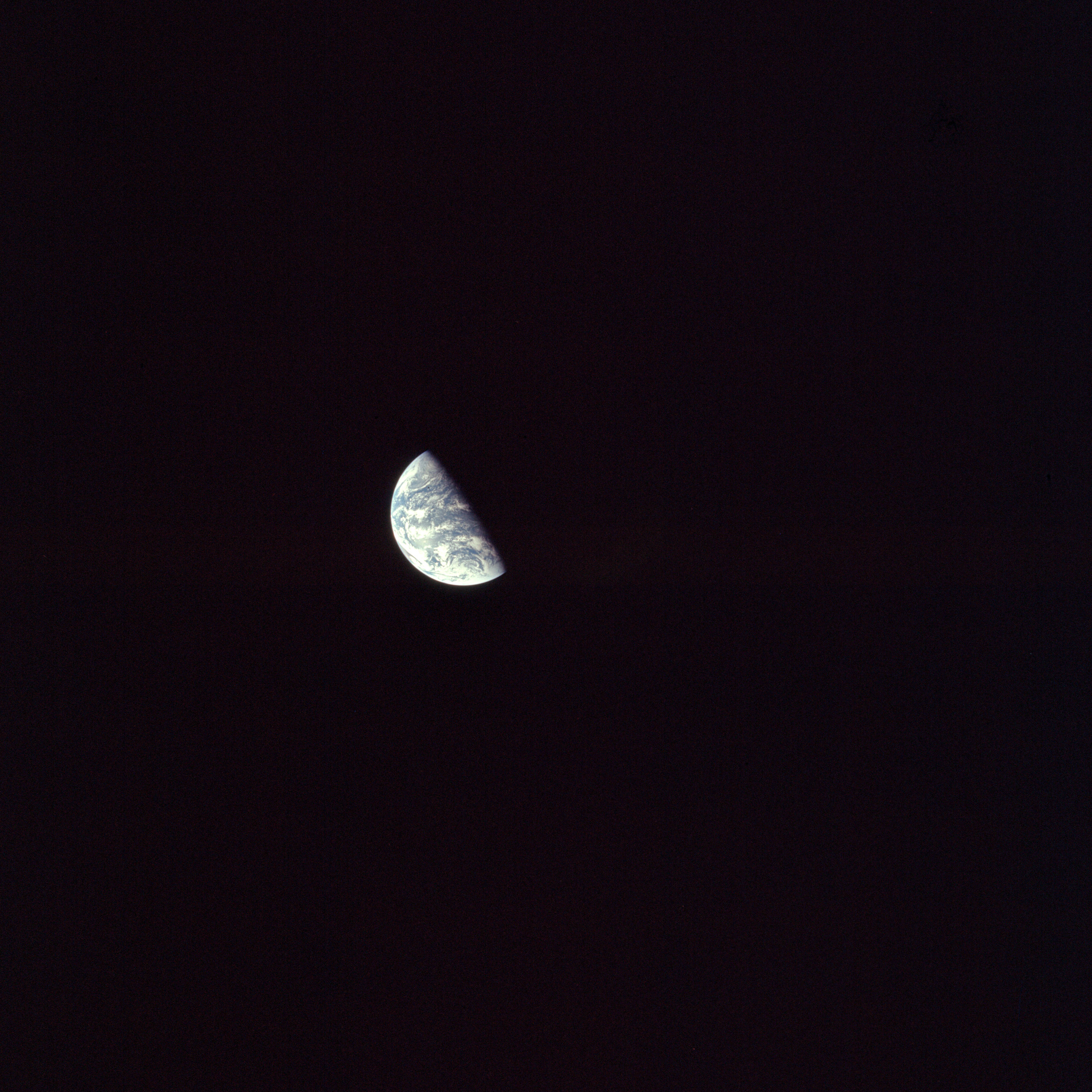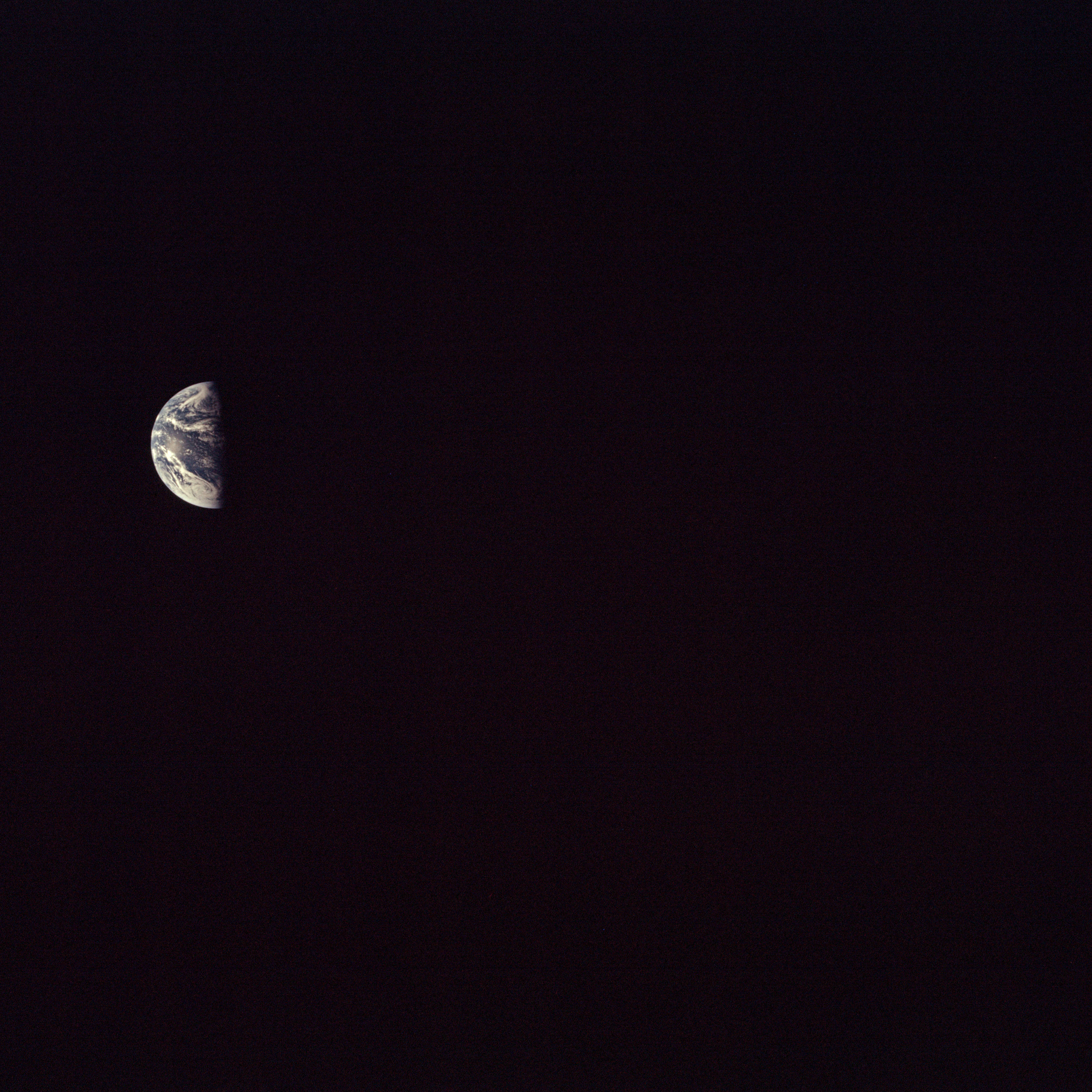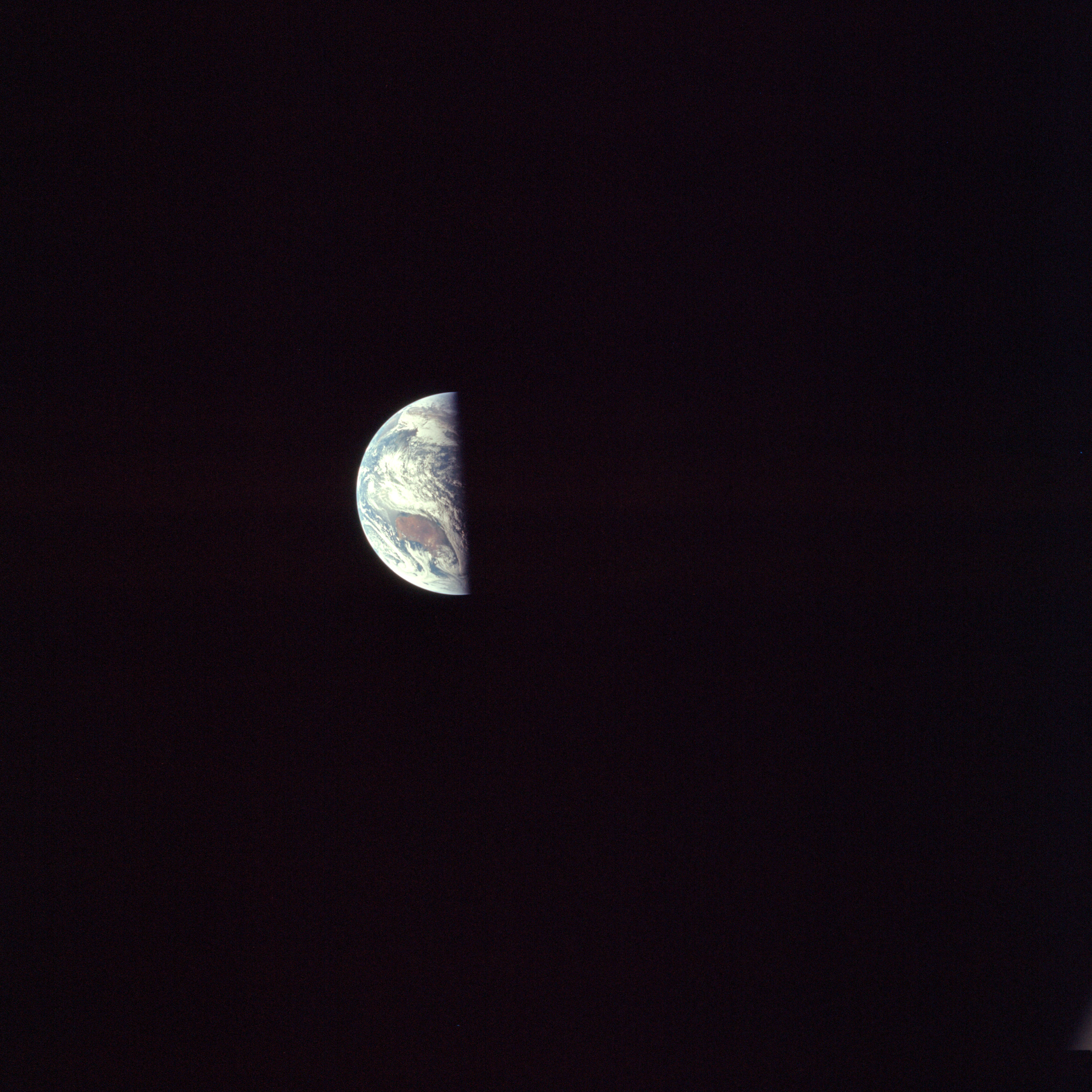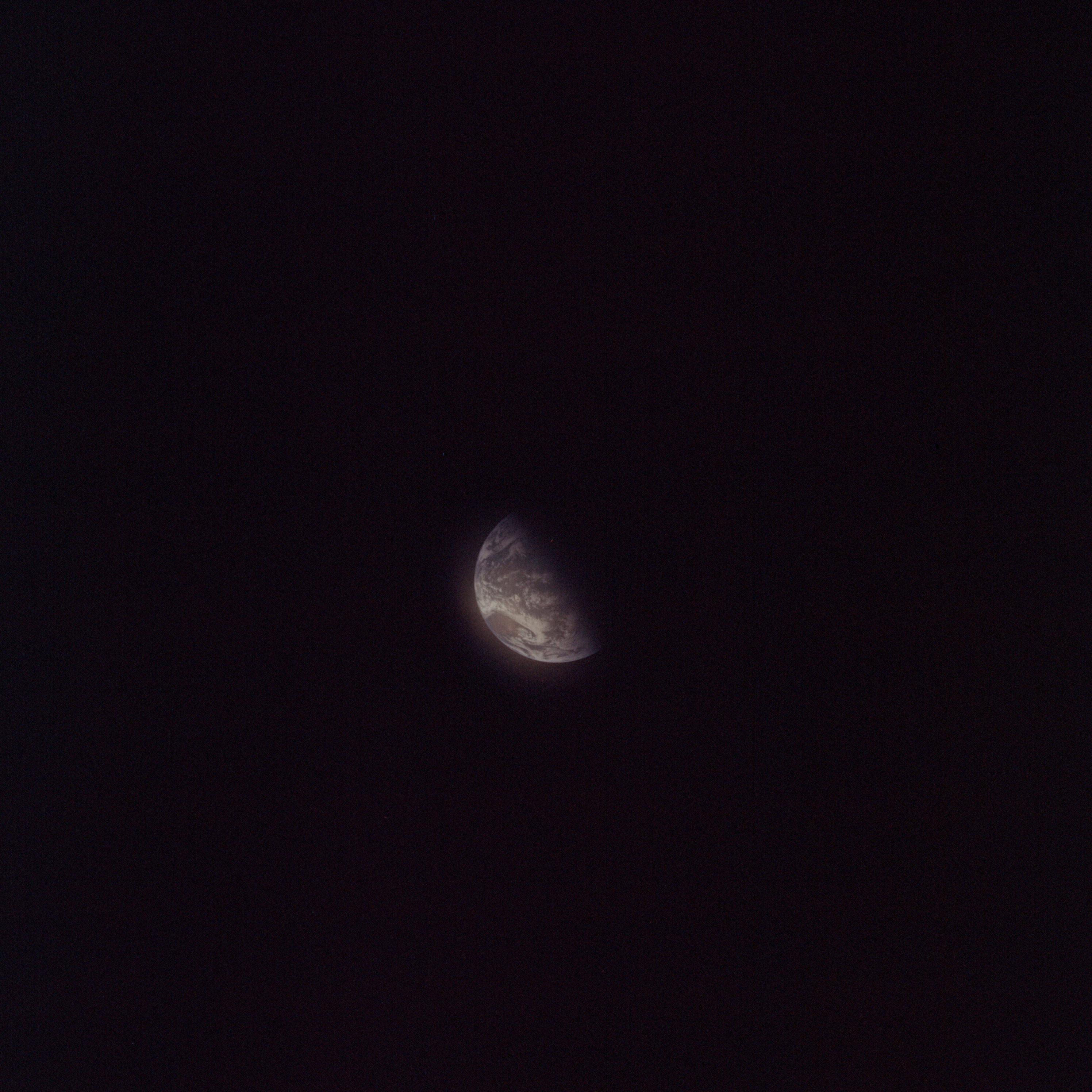 AS08-16-2597 38 kB or 331 kB Earth, at a calculated altitude of 102,500 km (based on photo analysis). No land is visible and it is suspected that the photo shows the Pacific Ocean. Image credit: Image Science and Analysis Laboratory, NASA-Johnson Space Center. |