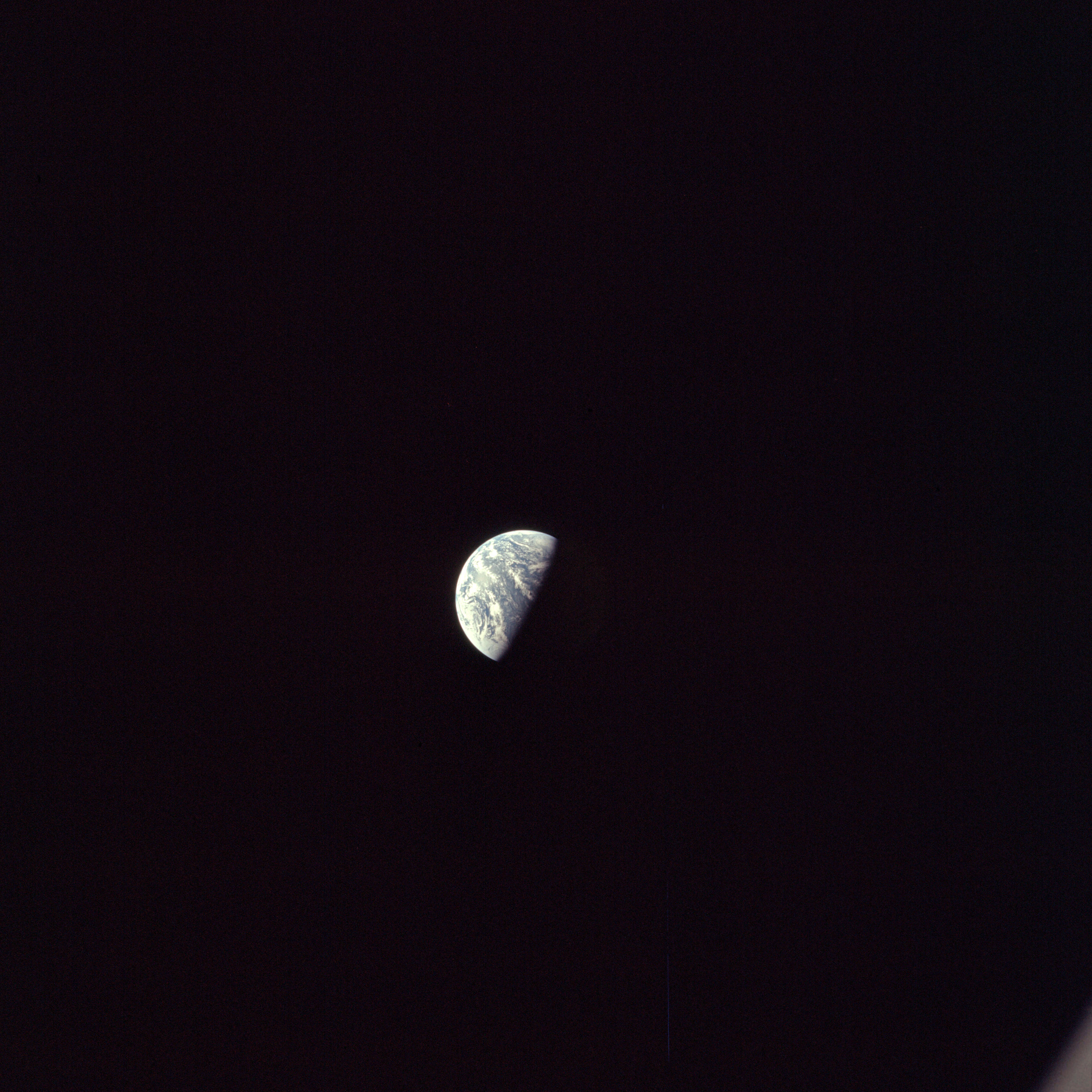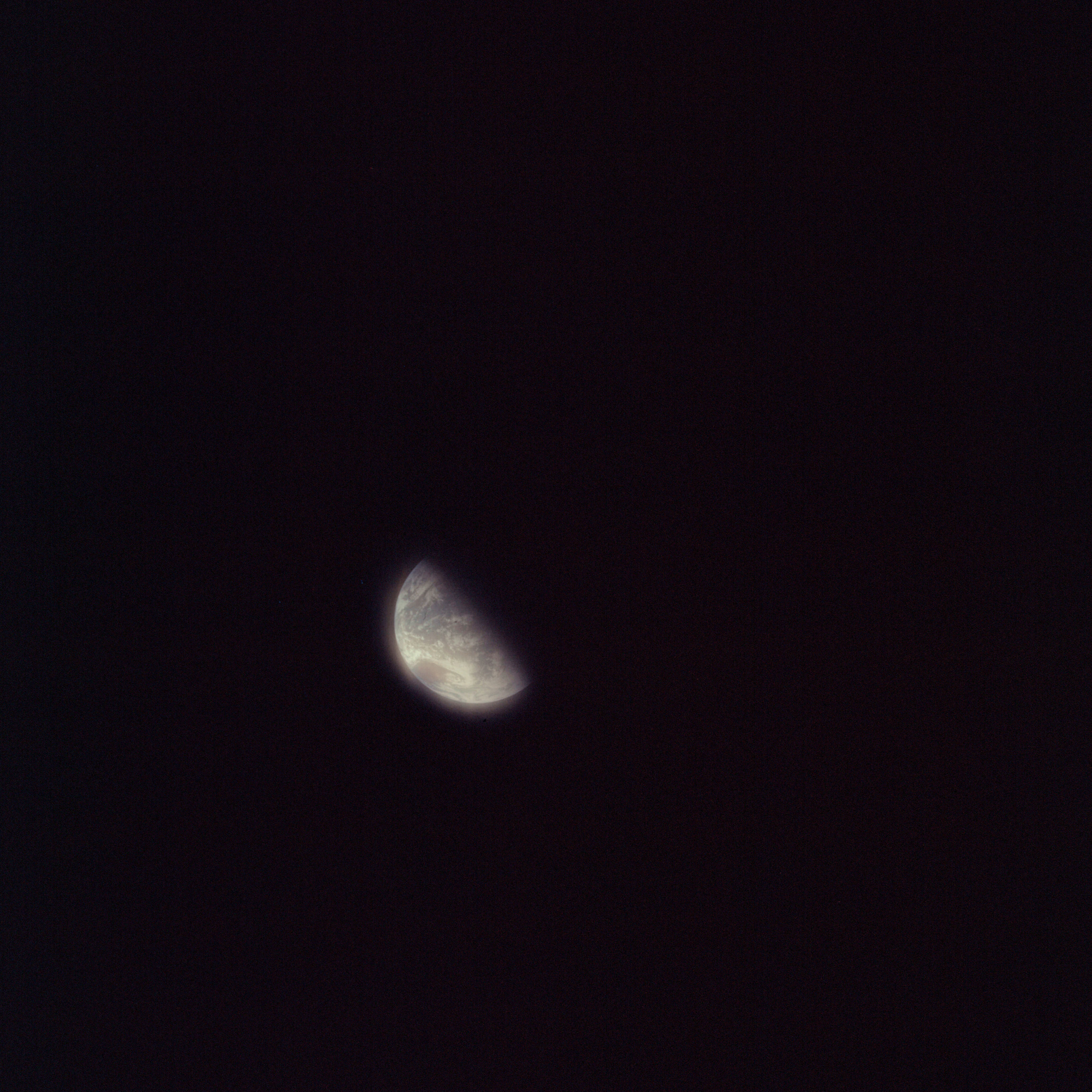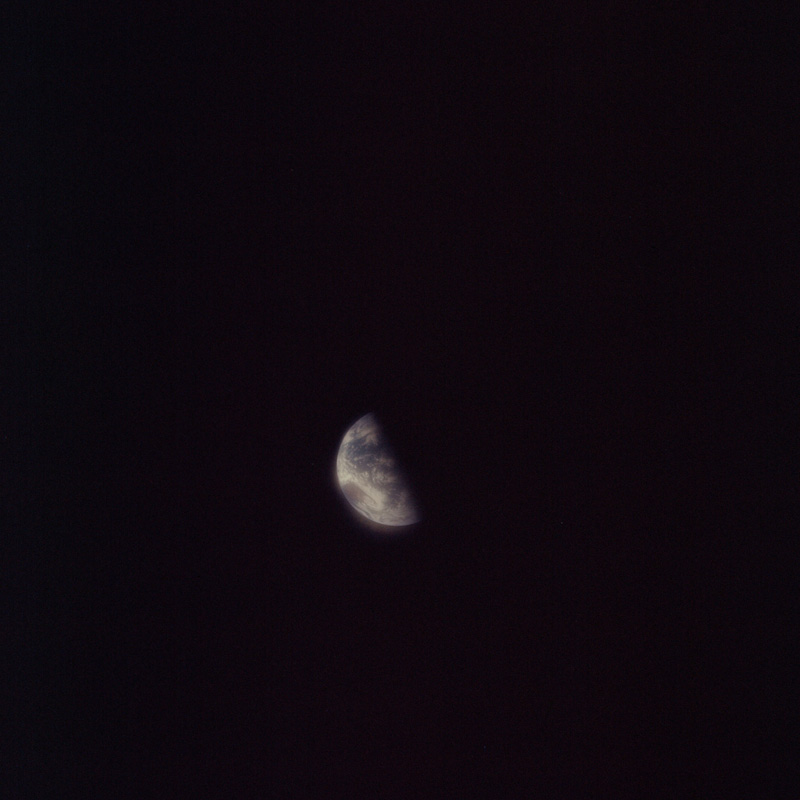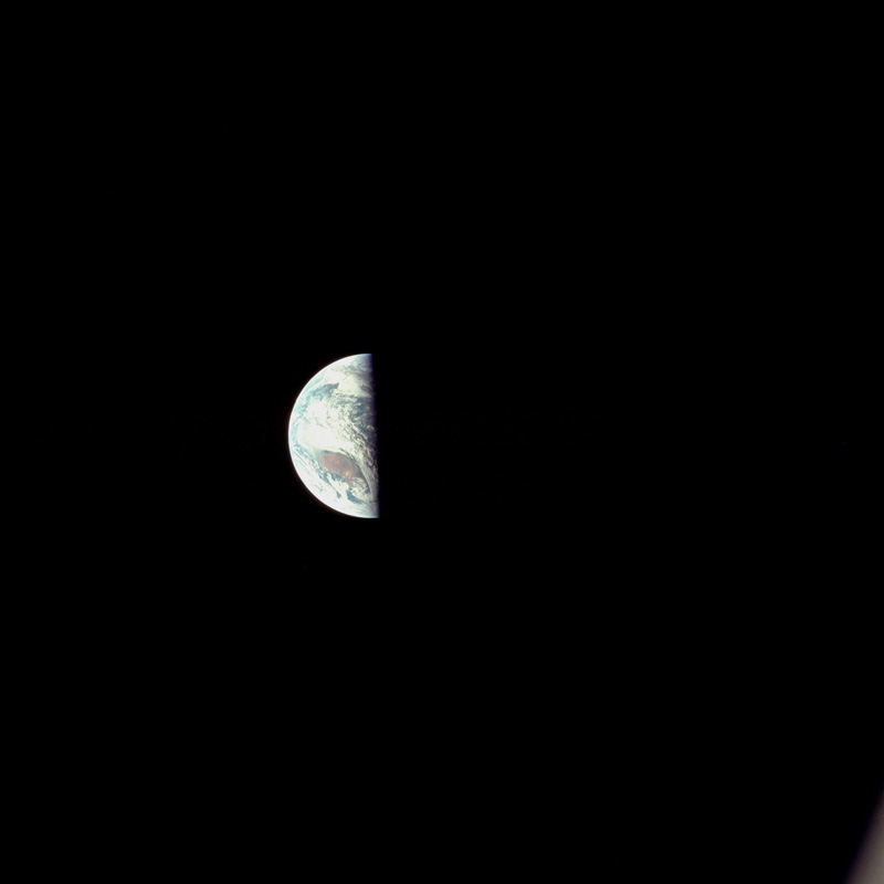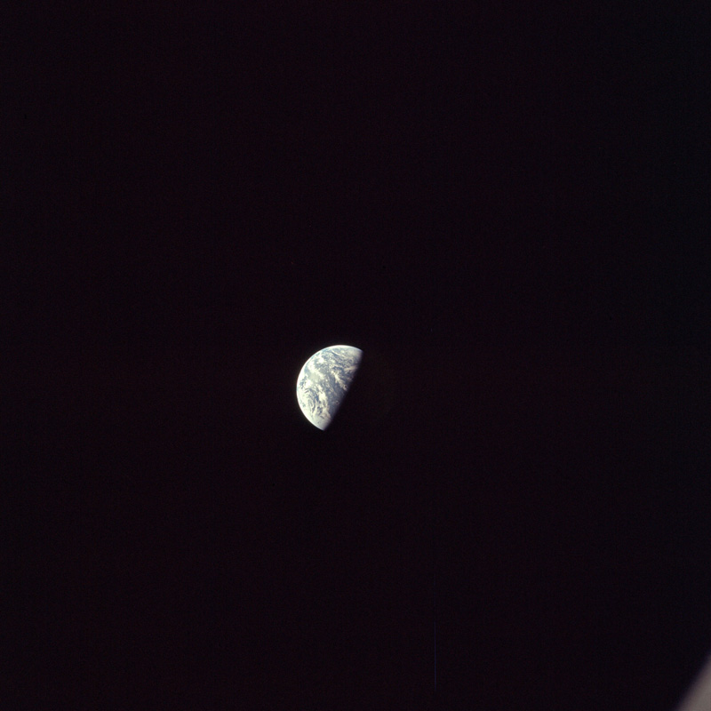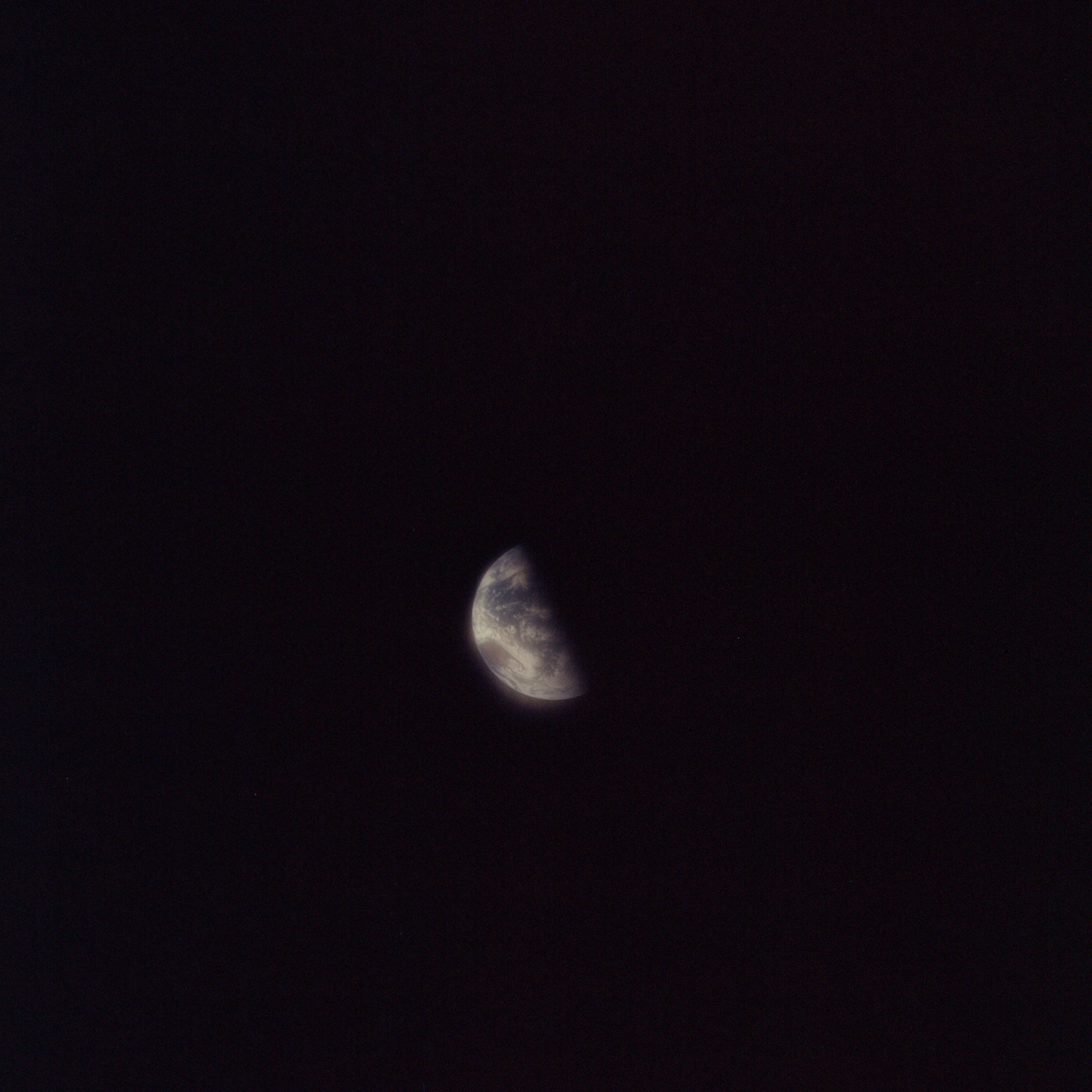 AS08-16-2597 38 kB or 331 kB Earth, at a calculated altitude of 102,500 km (based on photo analysis). No land is visible and it is suspected that the photo shows the Pacific Ocean. Image credit: Image Science and Analysis Laboratory, NASA-Johnson Space Center. |