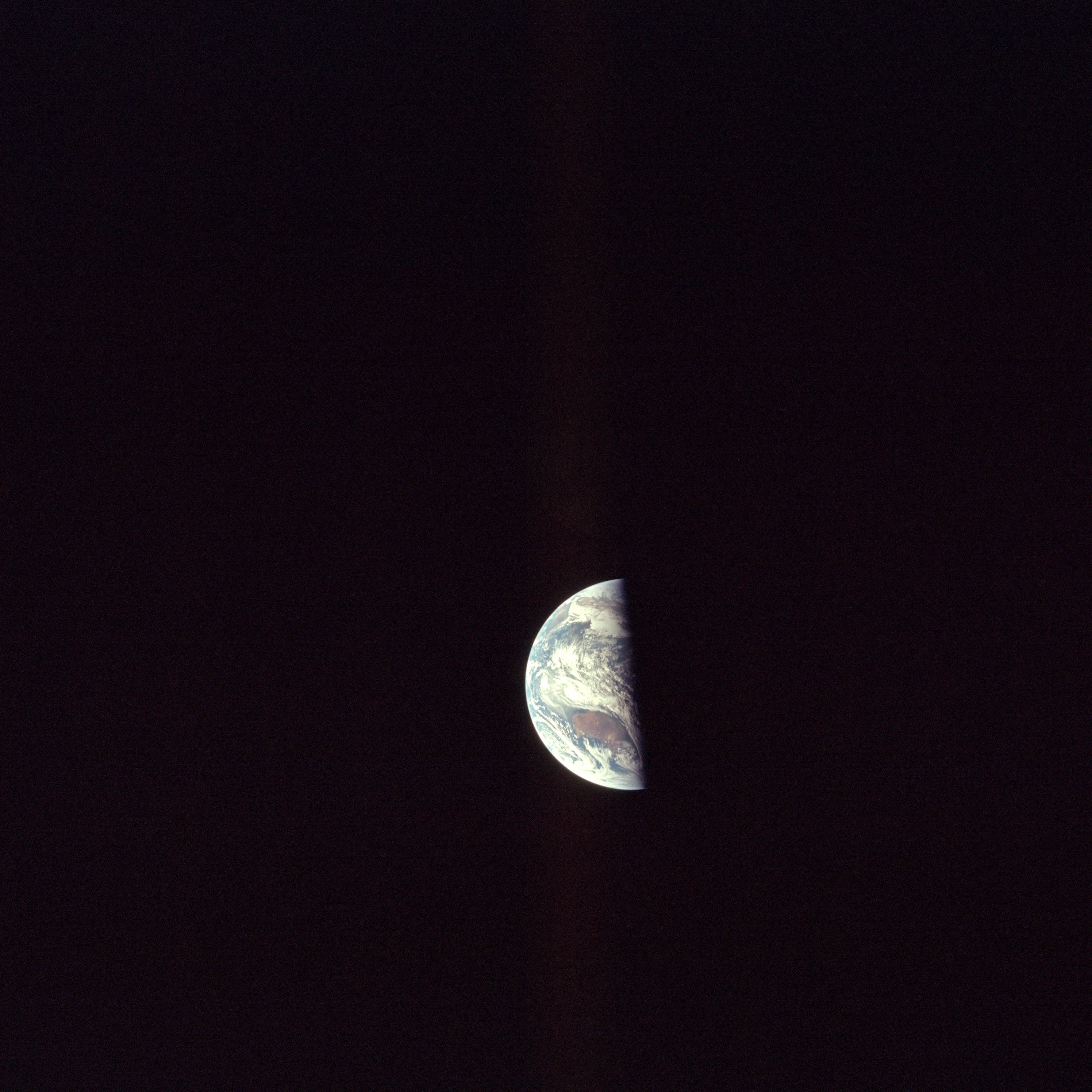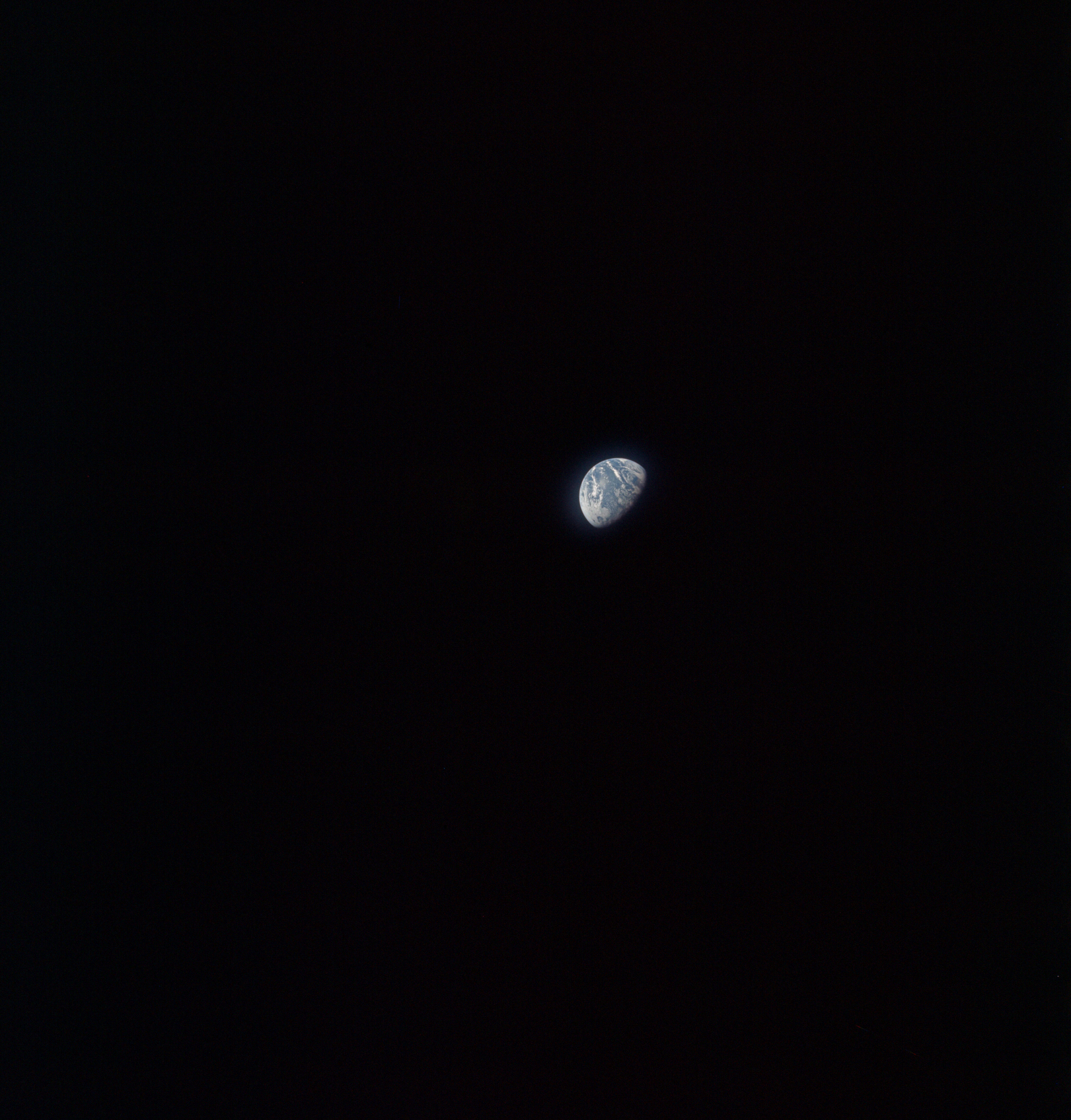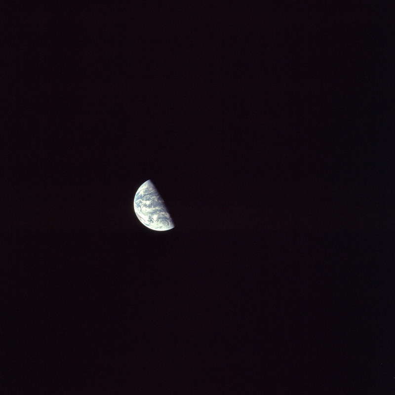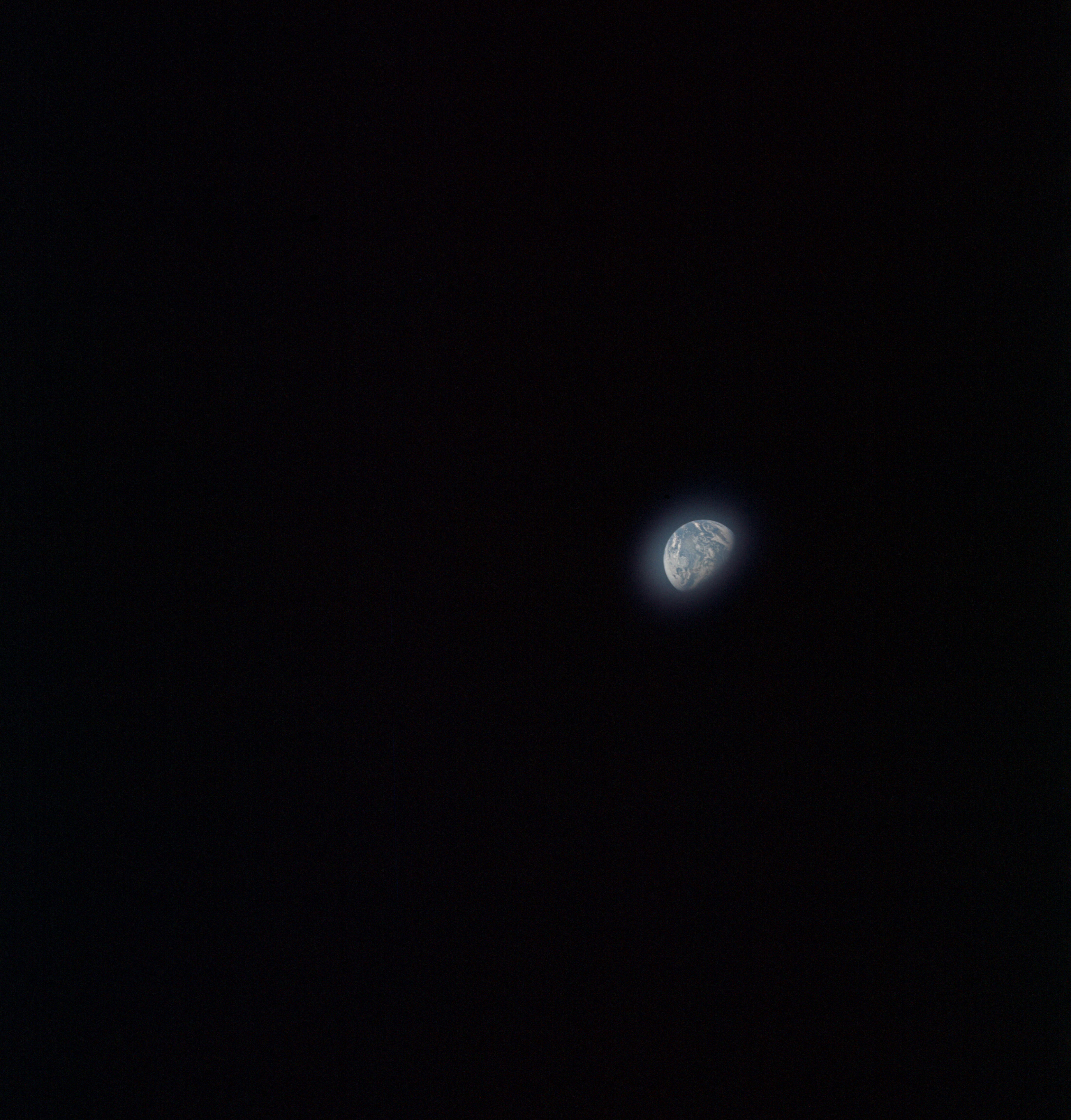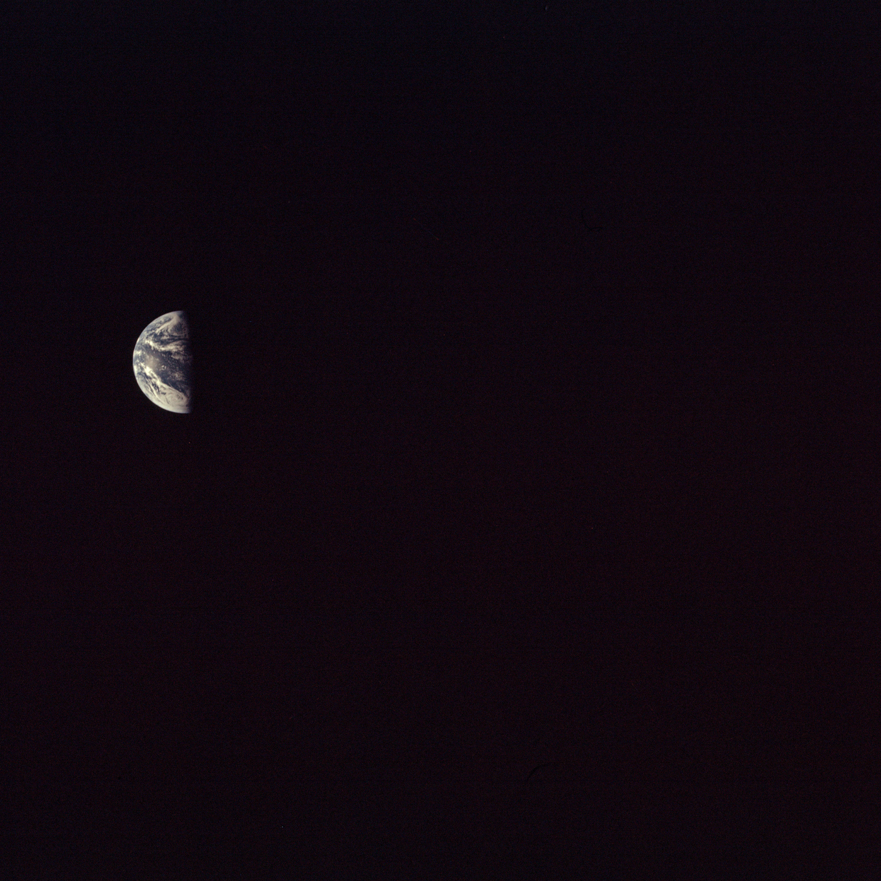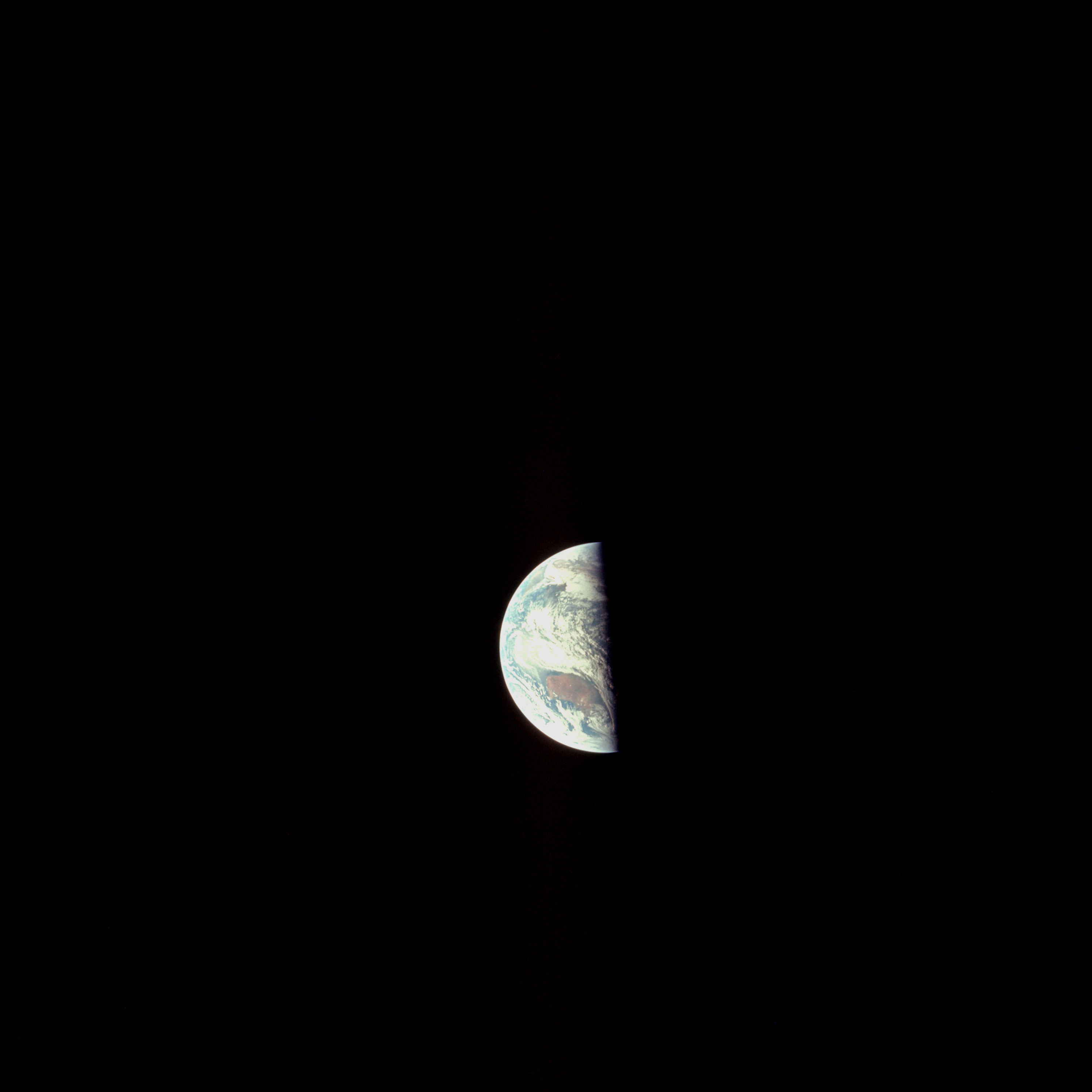 AS08-16-2597 38 kB or 331 kB Earth, at a calculated altitude of 102,500 km (based on photo analysis). No land is visible and it is suspected that the photo shows the Pacific Ocean. Image credit: Image Science and Analysis Laboratory, NASA-Johnson Space Center. |