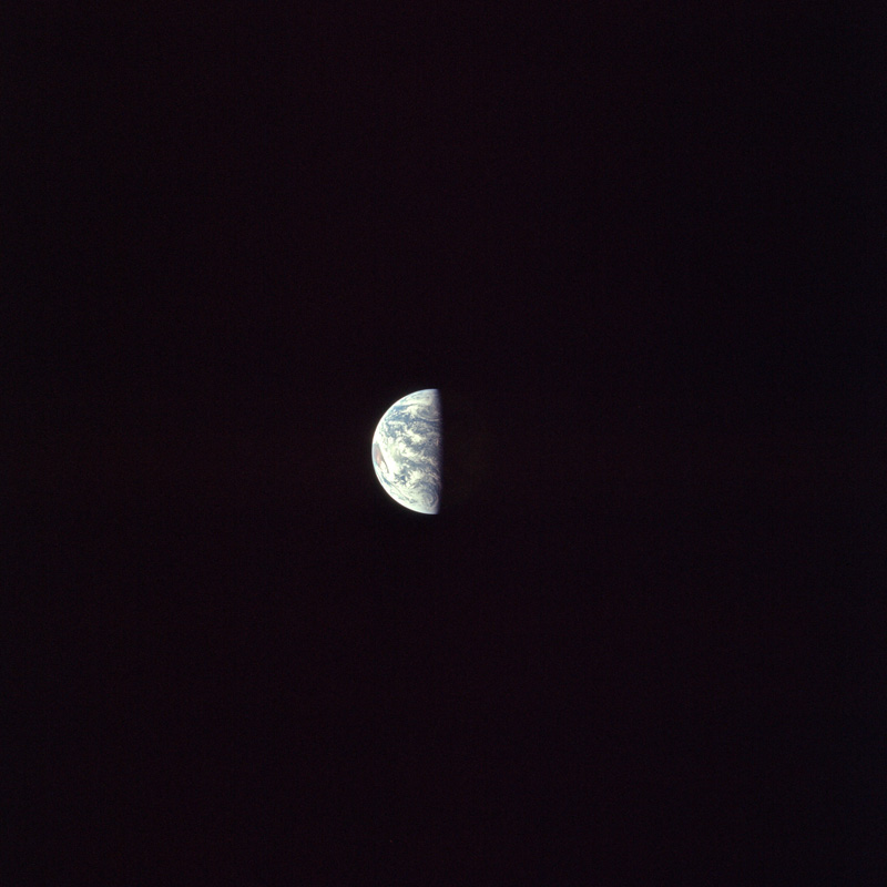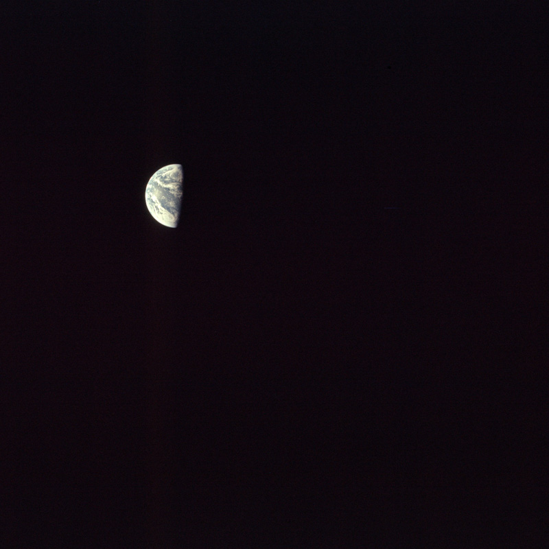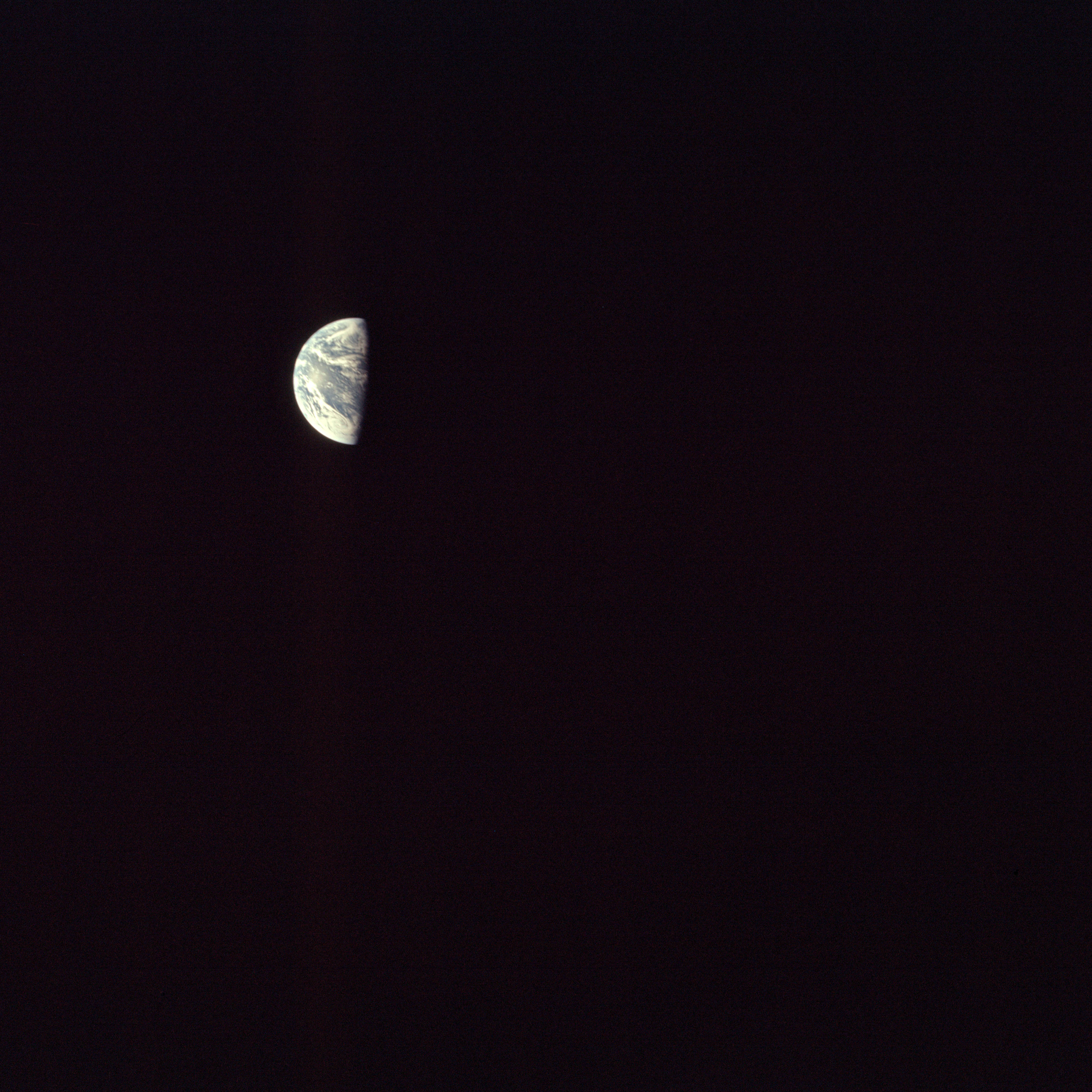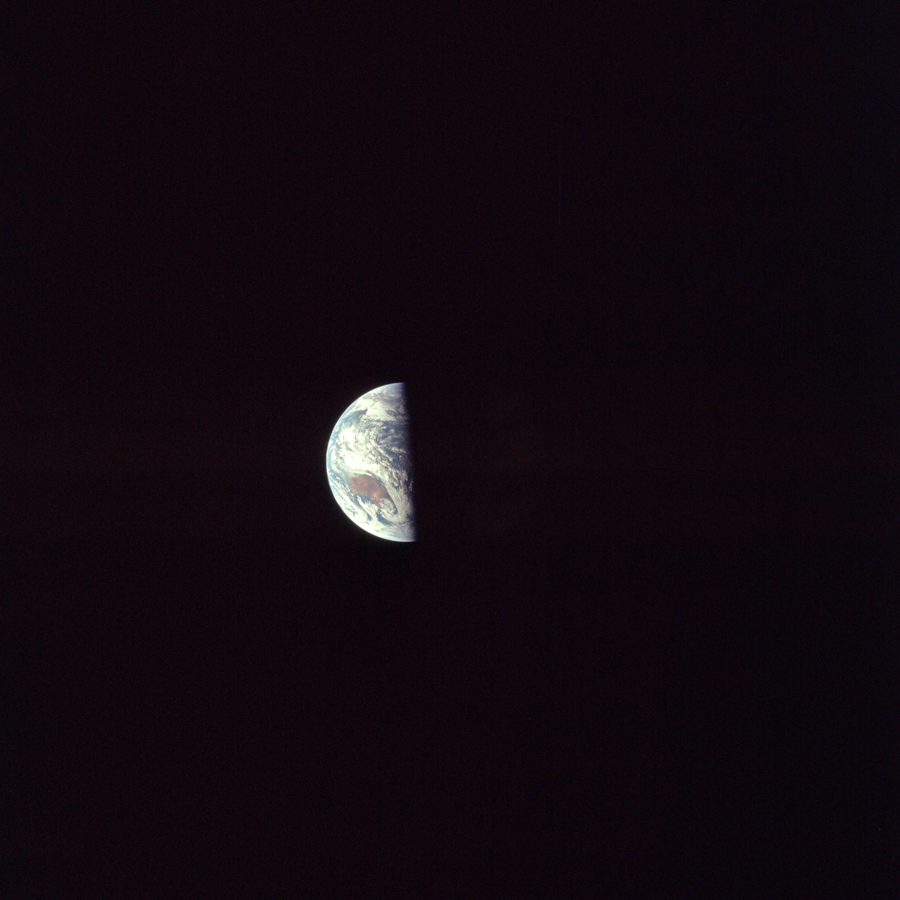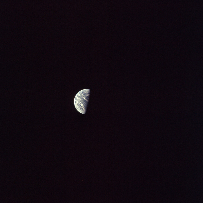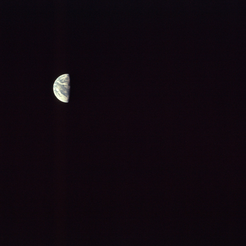 AS08-16-2597 38 kB or 331 kB Earth, at a calculated altitude of 102,500 km (based on photo analysis). No land is visible and it is suspected that the photo shows the Pacific Ocean. Image credit: Image Science and Analysis Laboratory, NASA-Johnson Space Center. |