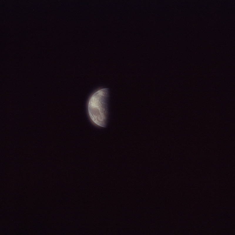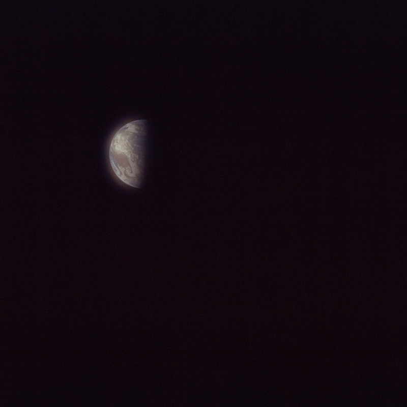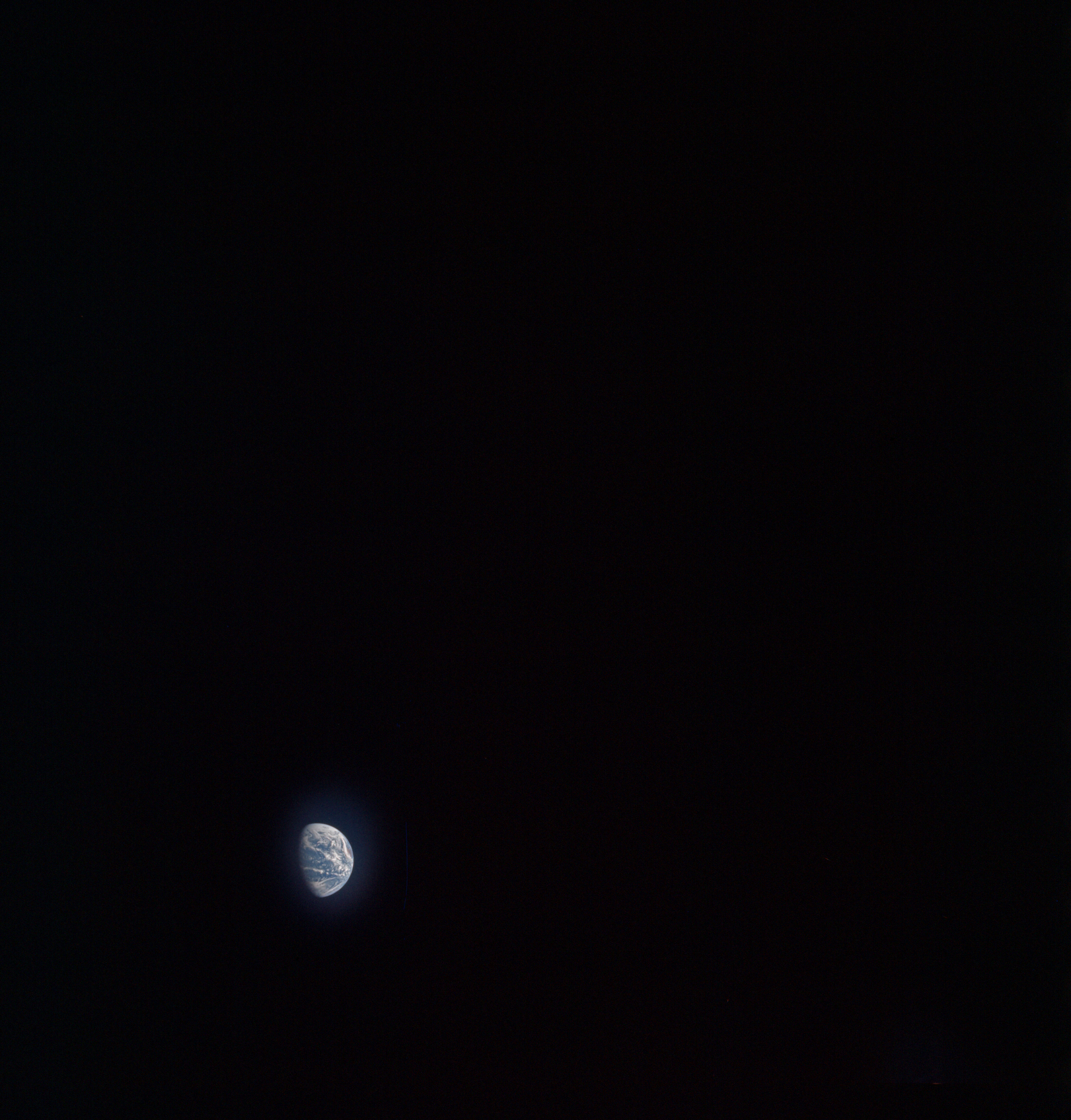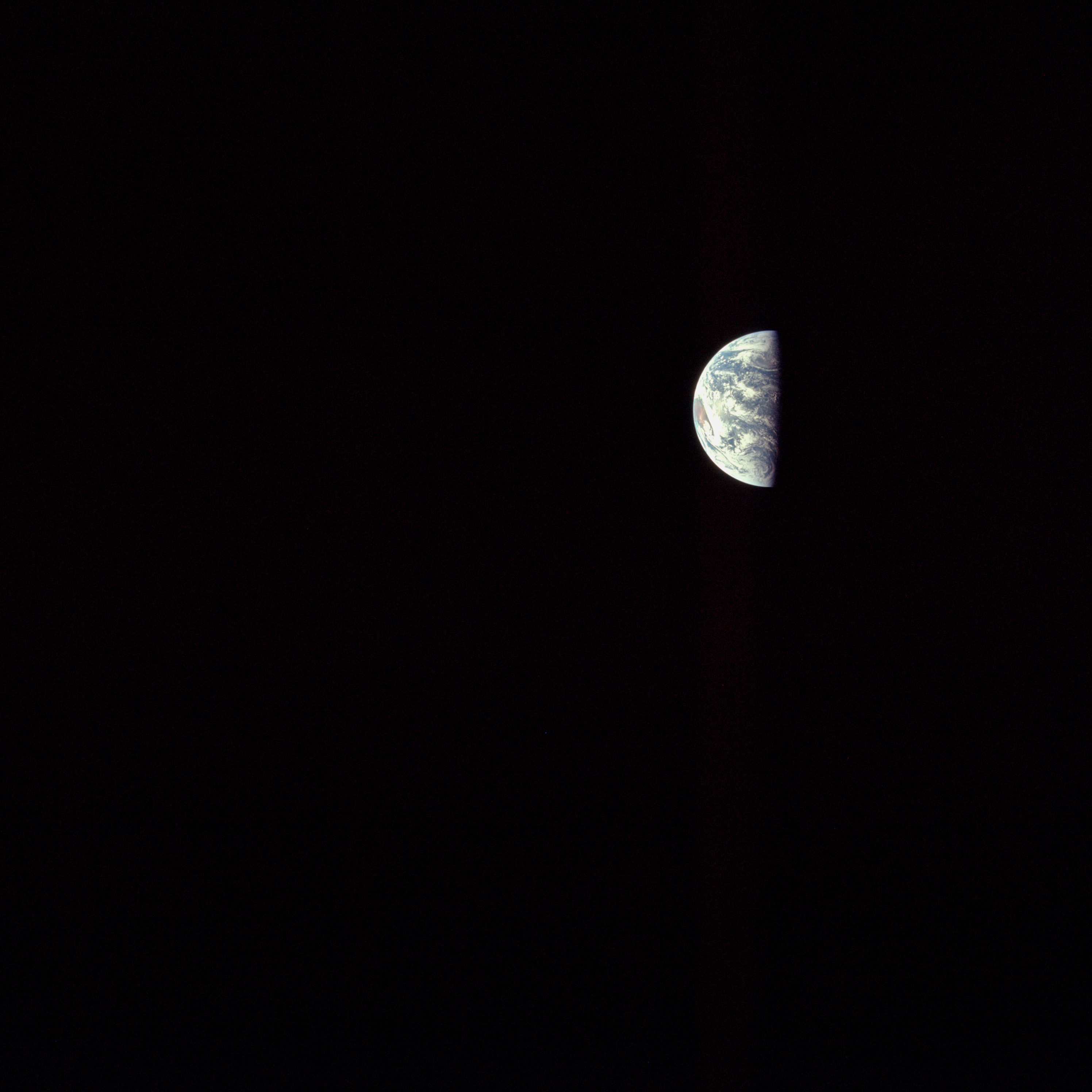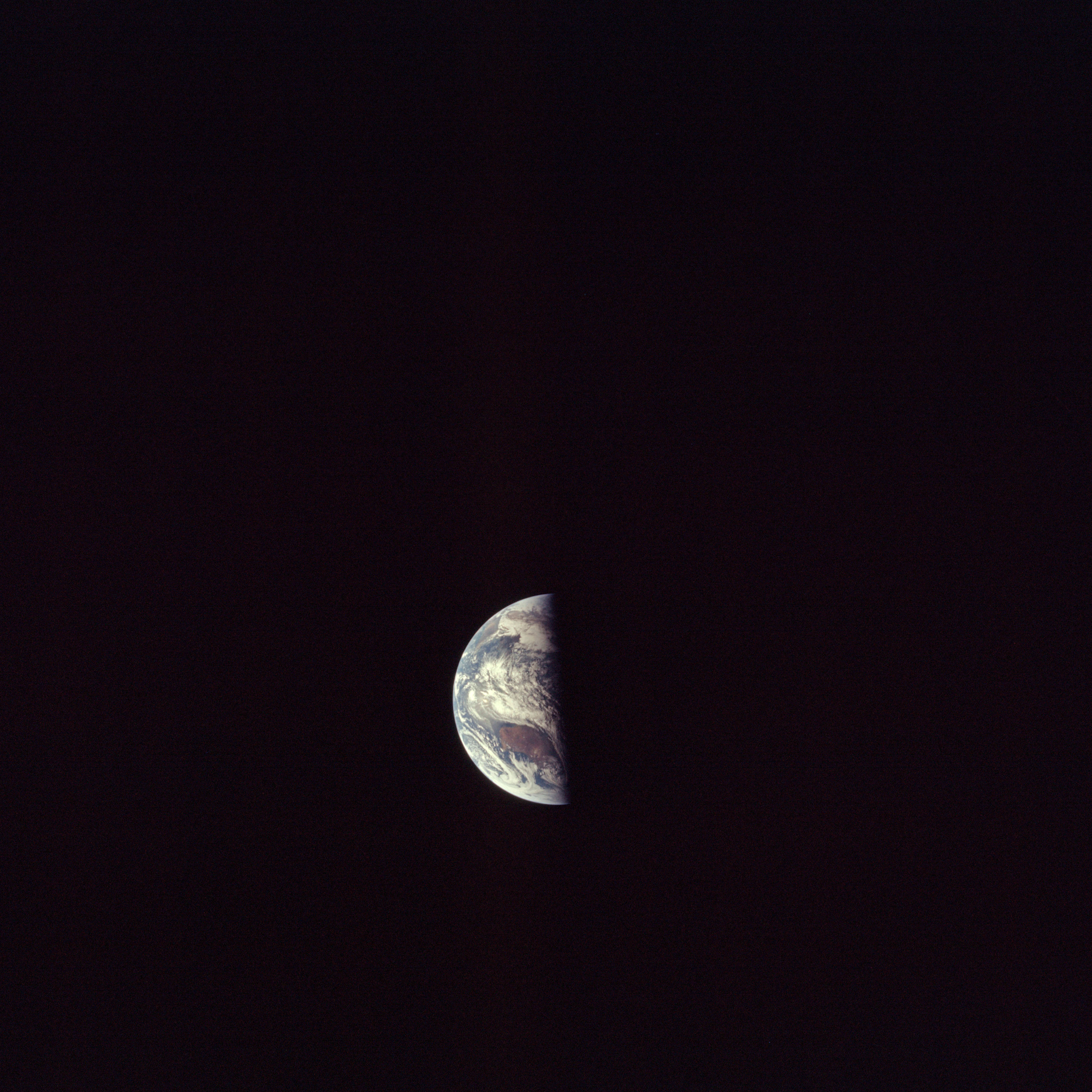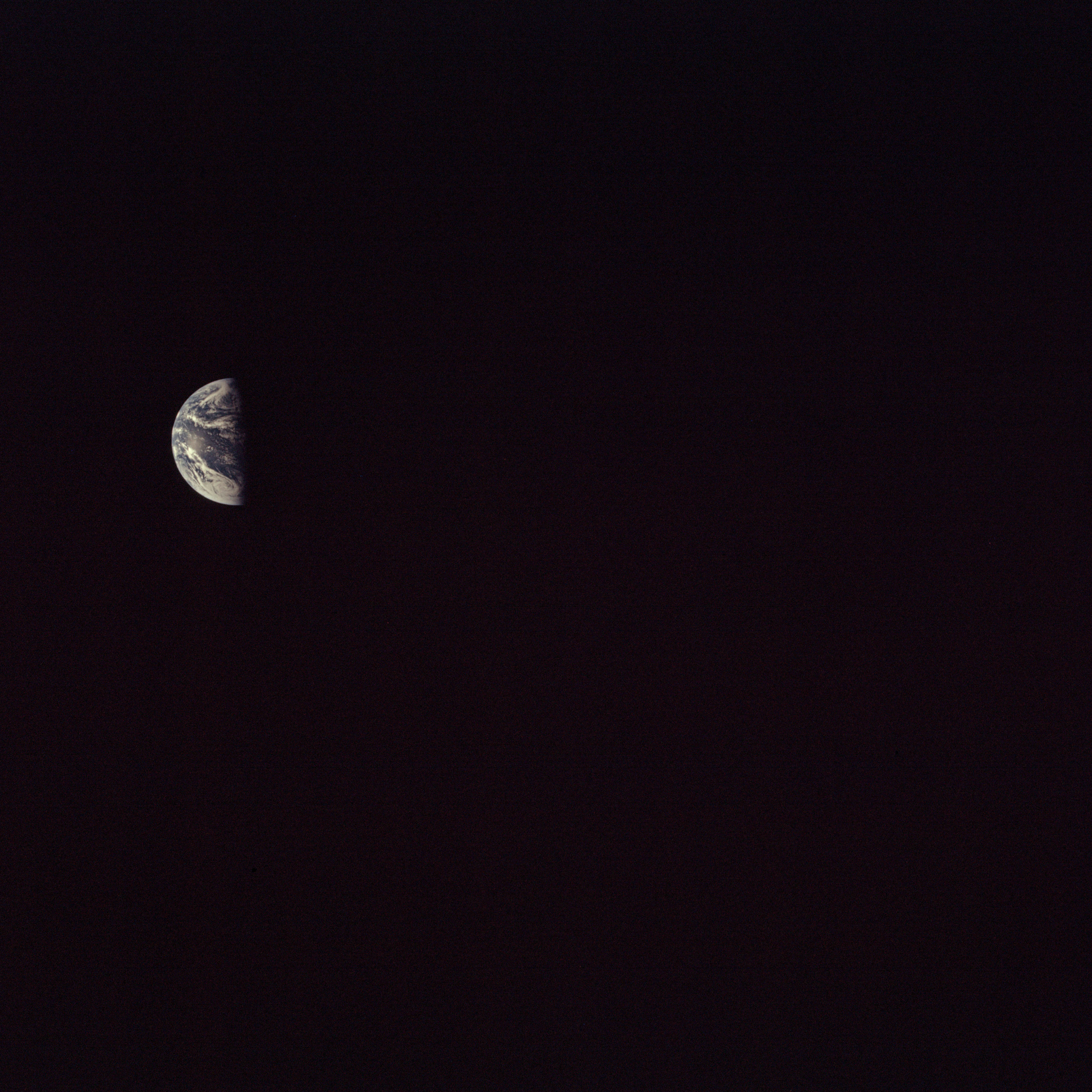 AS08-16-2597 38 kB or 331 kB Earth, at a calculated altitude of 102,500 km (based on photo analysis). No land is visible and it is suspected that the photo shows the Pacific Ocean. Image credit: Image Science and Analysis Laboratory, NASA-Johnson Space Center. |