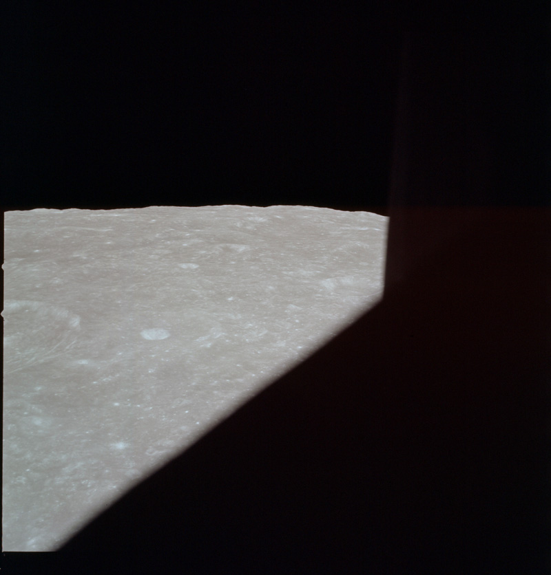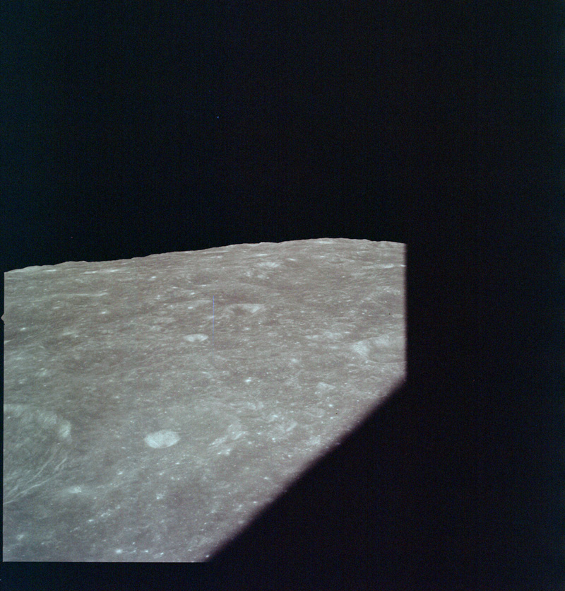 AS08-16-2594 102 kB or 10.6 MB Attempt by Frank Borman to image both the S-IVB (cut off on the extreme right) and Earth. Likely taken at 004:55:12. Image credit: Image Science and Analysis Laboratory, NASA-Johnson Space Center. |