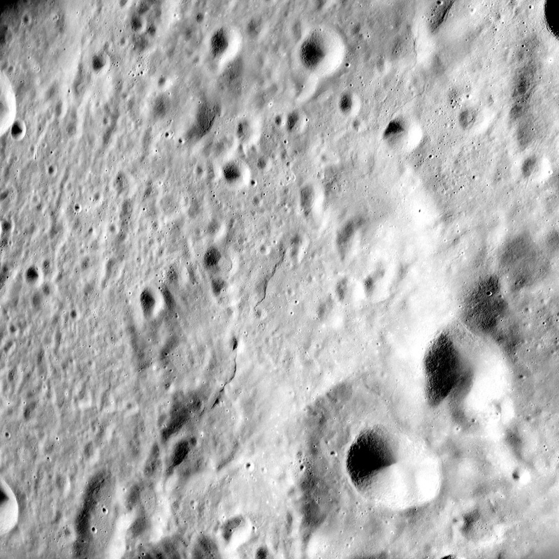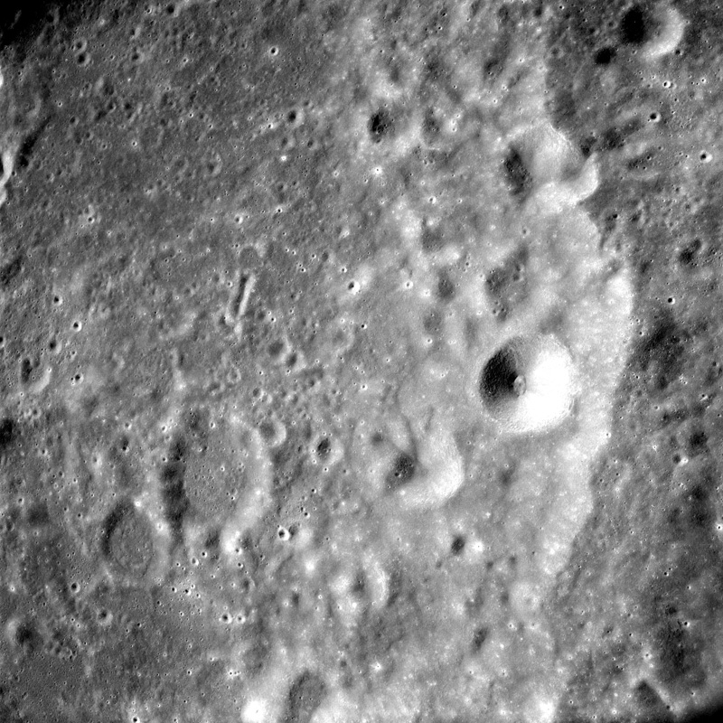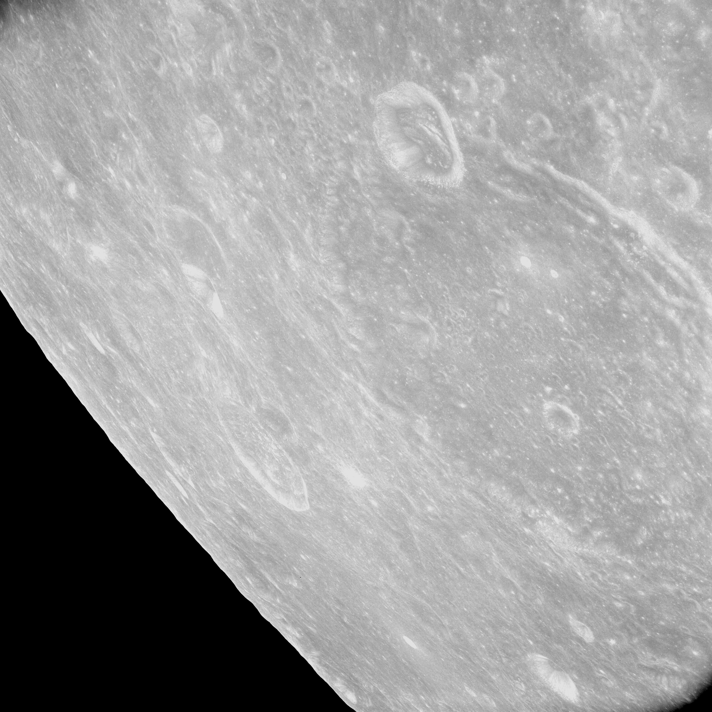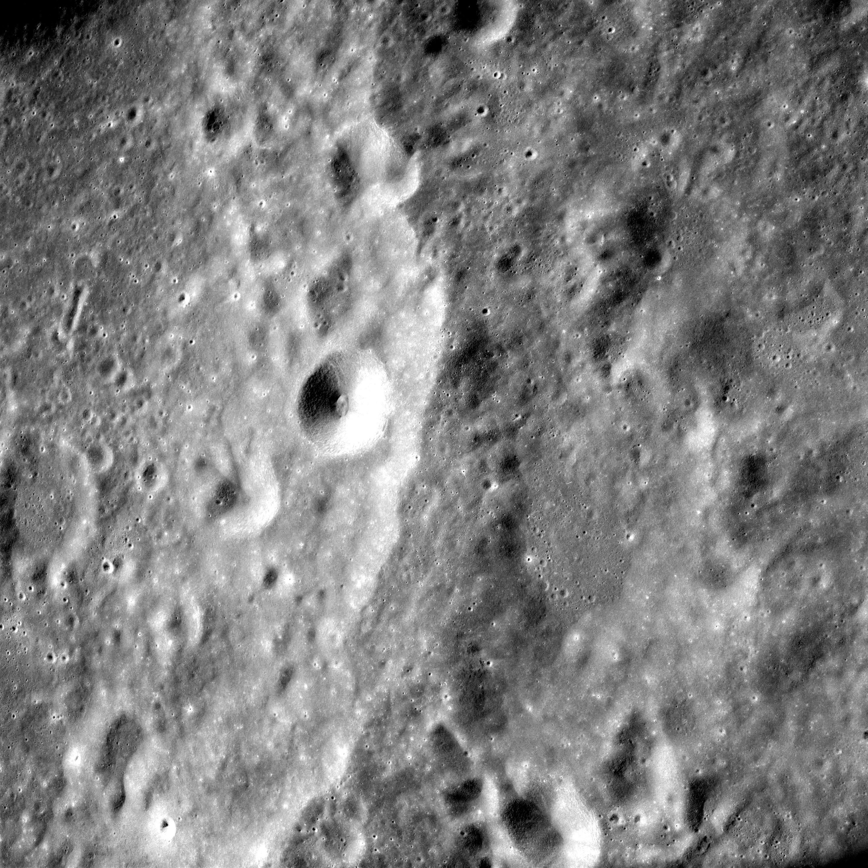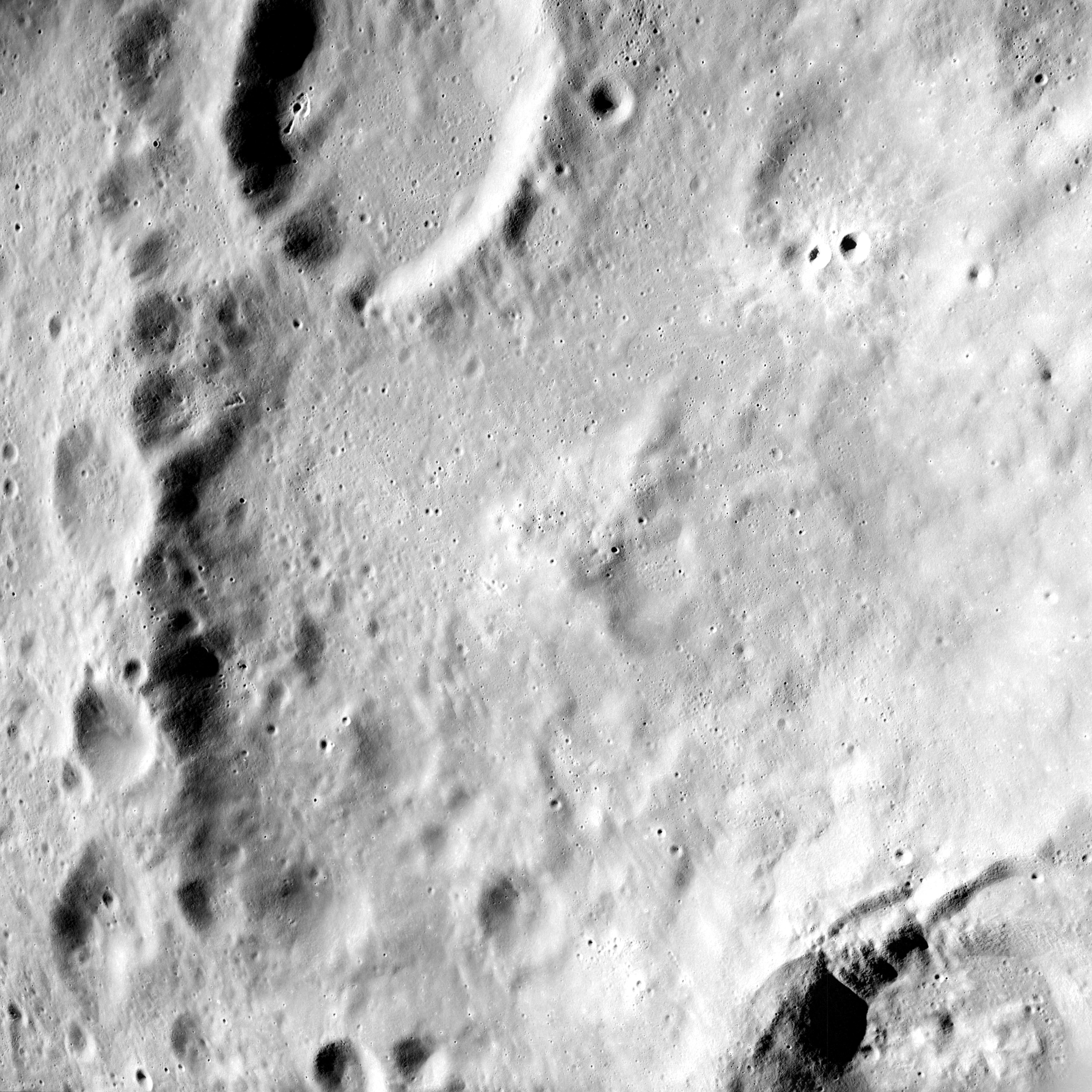 AS08-17-2677 311 kB or 2,275 kB Unnamed elongated crater southeast of far-side crater Icarus. Cut off at top right is Icarus E. Image credit: Image Science and Analysis Laboratory, NASA-Johnson Space Center. |
