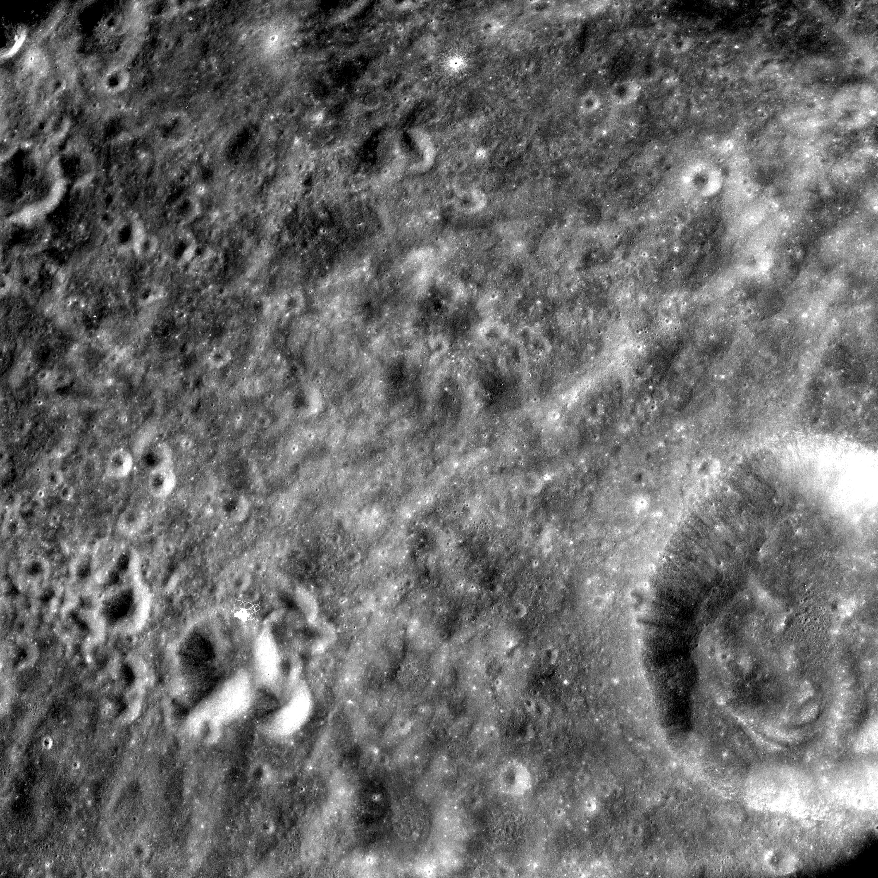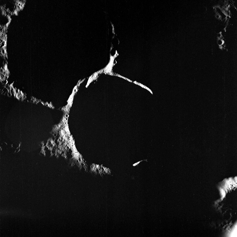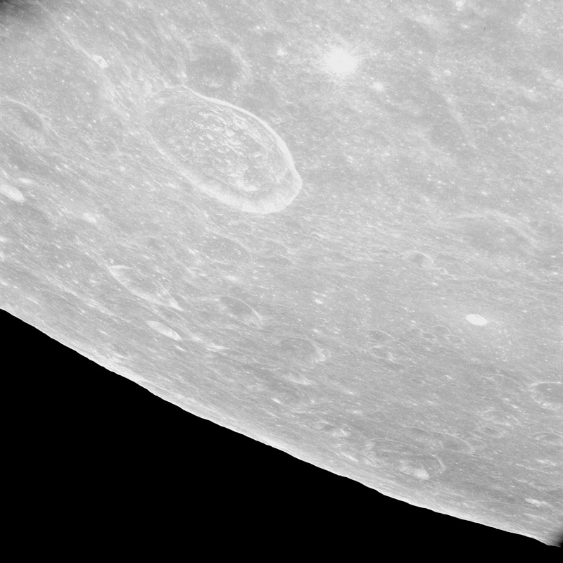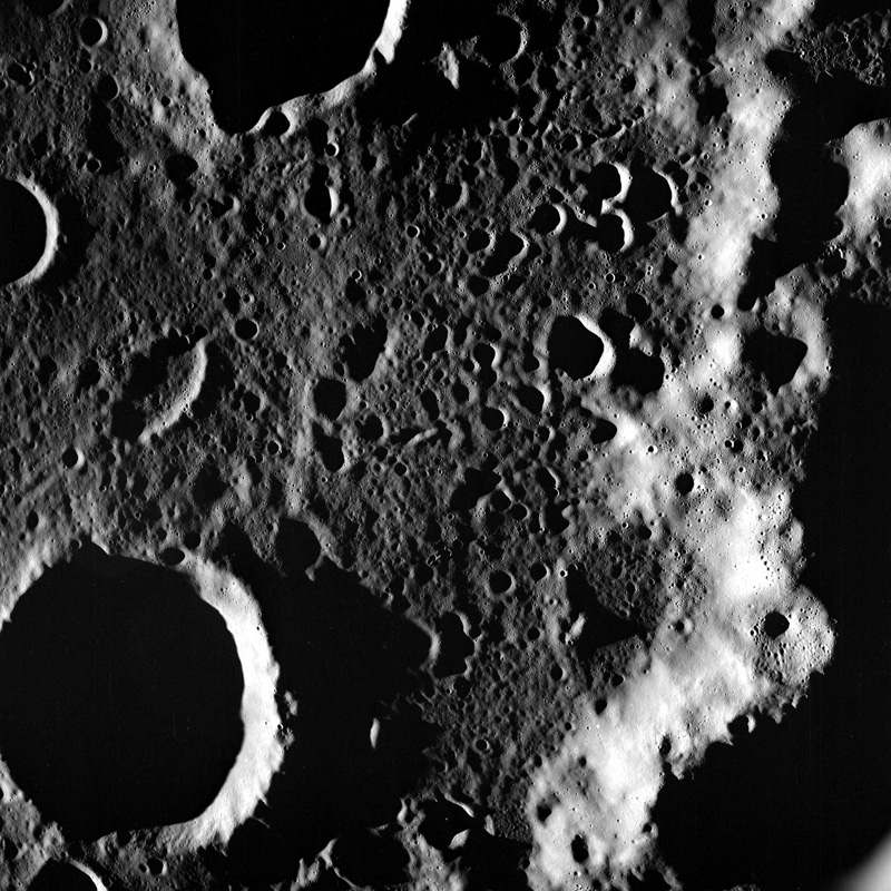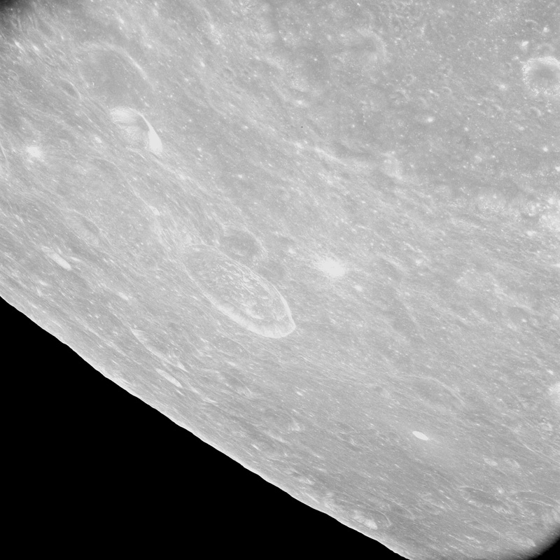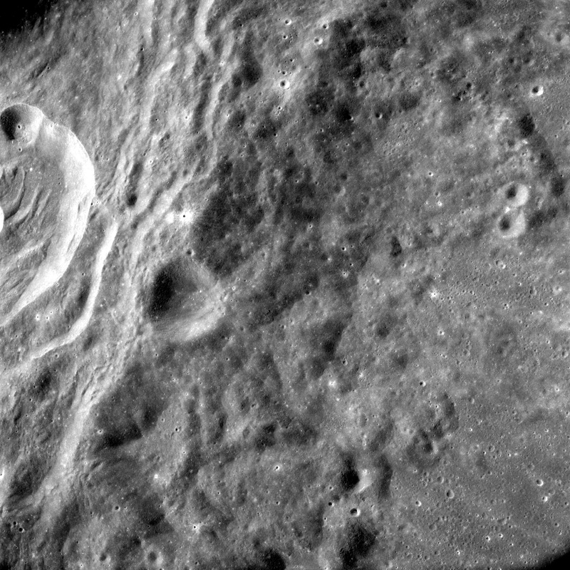AS08-17-2677 311 kB or 2,275 kB Unnamed elongated crater southeast of far-side crater Icarus. Cut off at top right is Icarus E. Image credit: Image Science and Analysis Laboratory, NASA-Johnson Space Center. |