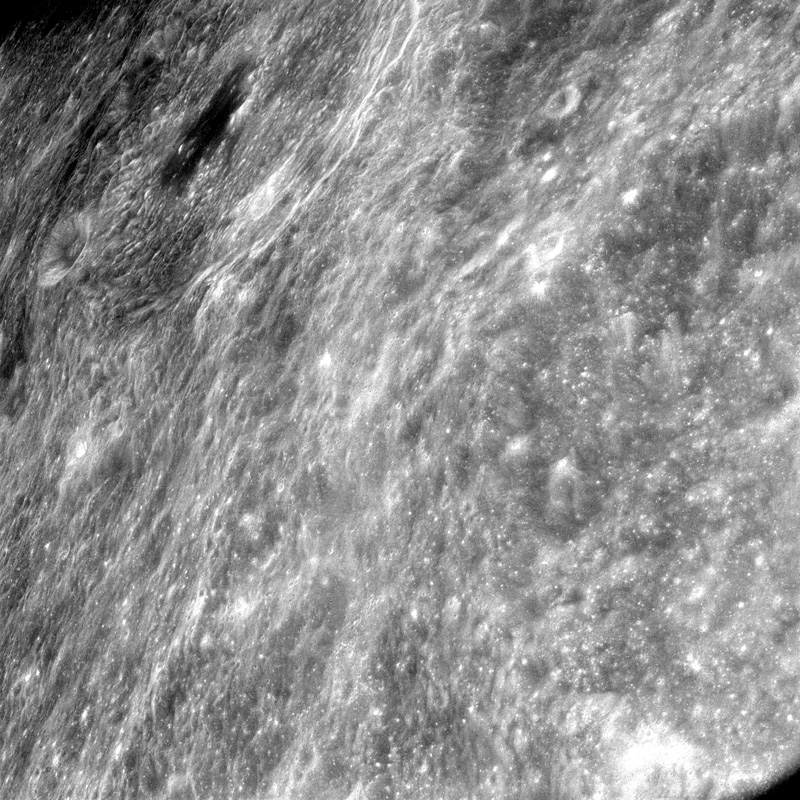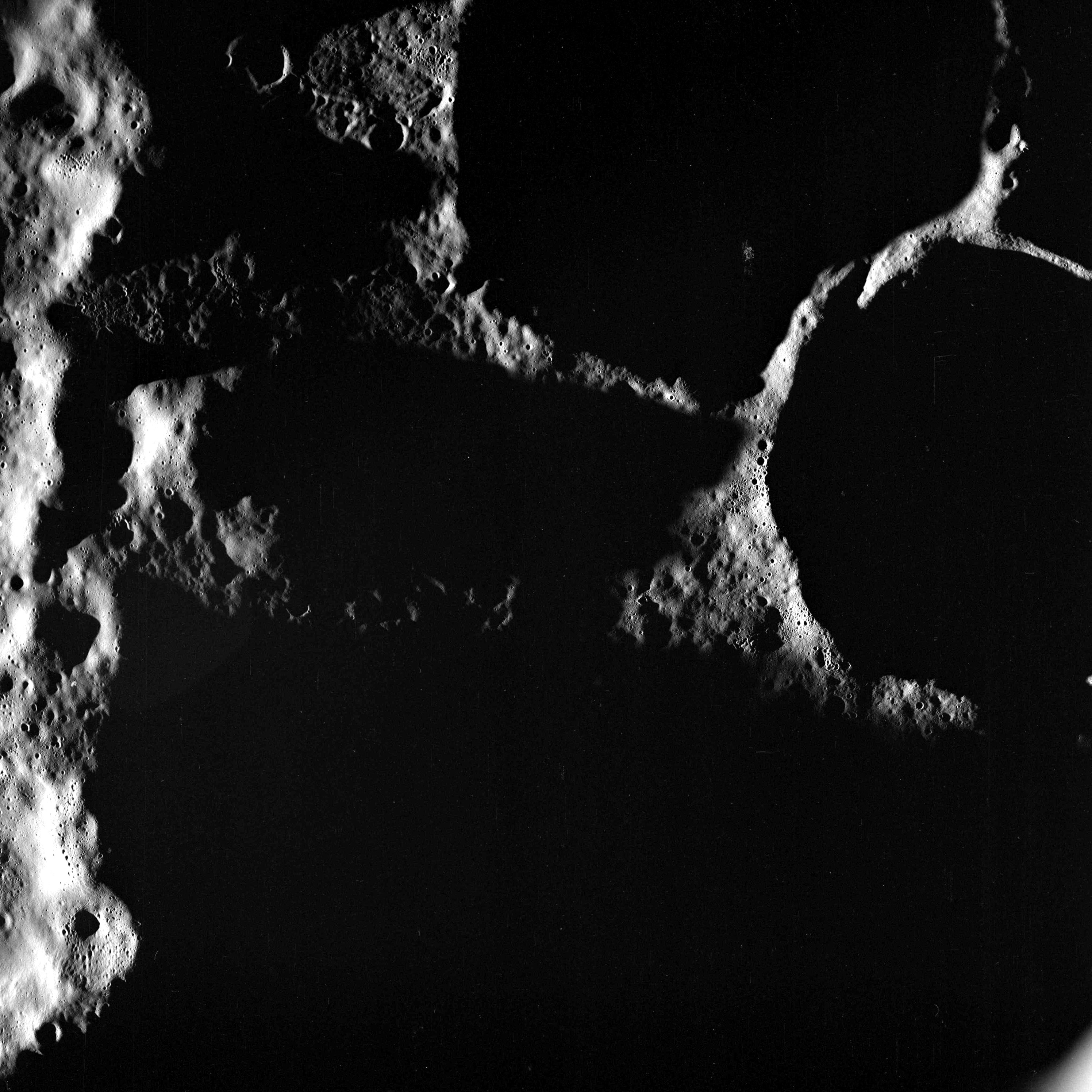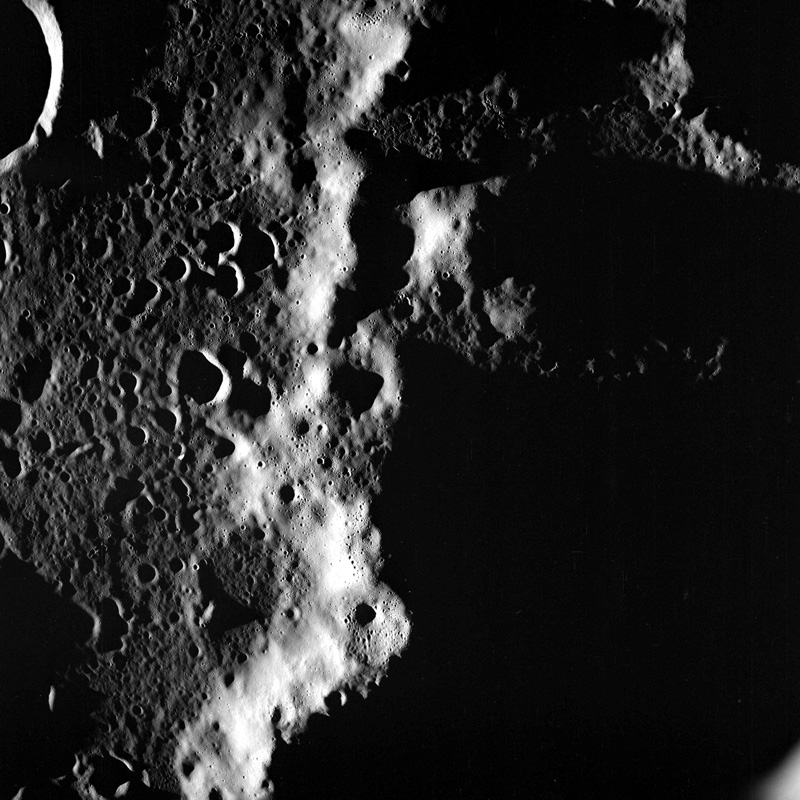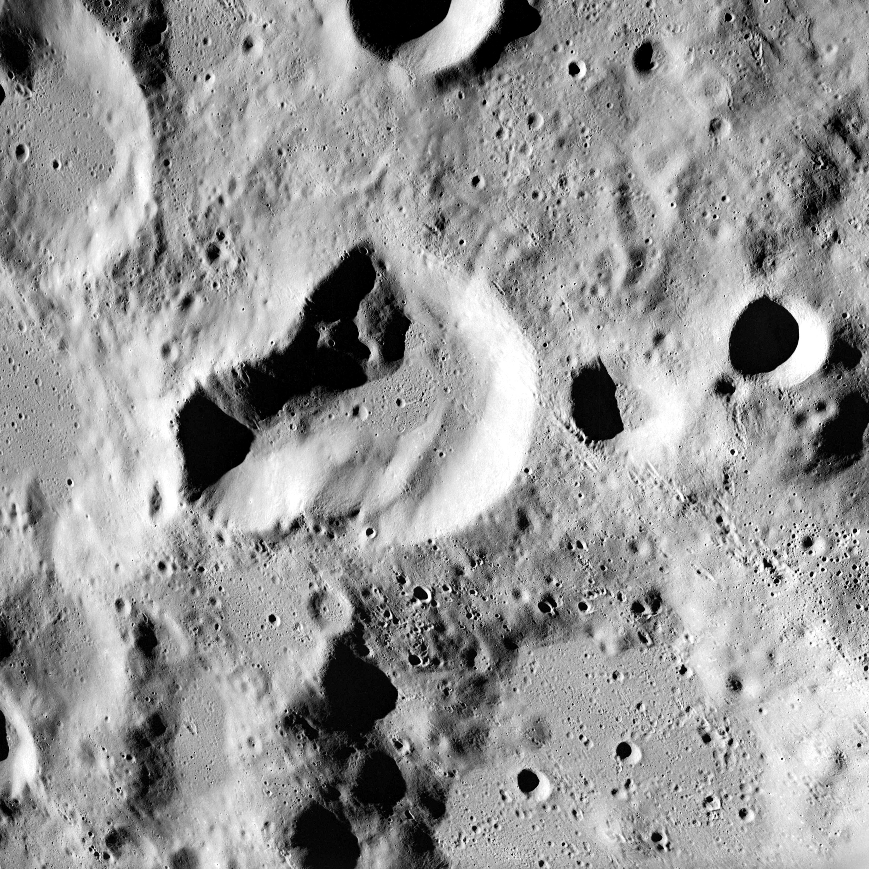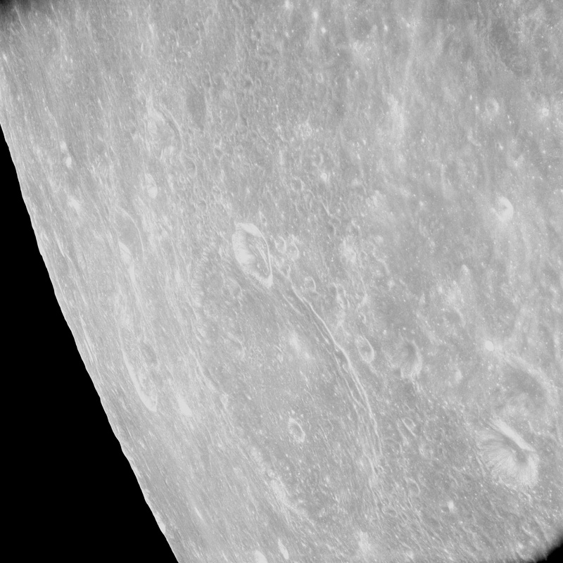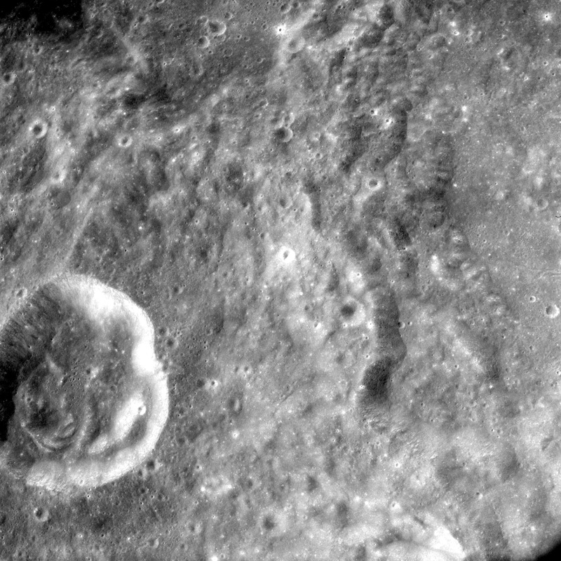 AS08-17-2677 311 kB or 2,275 kB Unnamed elongated crater southeast of far-side crater Icarus. Cut off at top right is Icarus E. Image credit: Image Science and Analysis Laboratory, NASA-Johnson Space Center. |