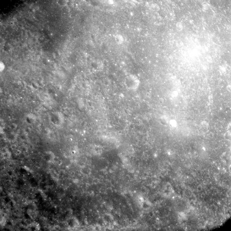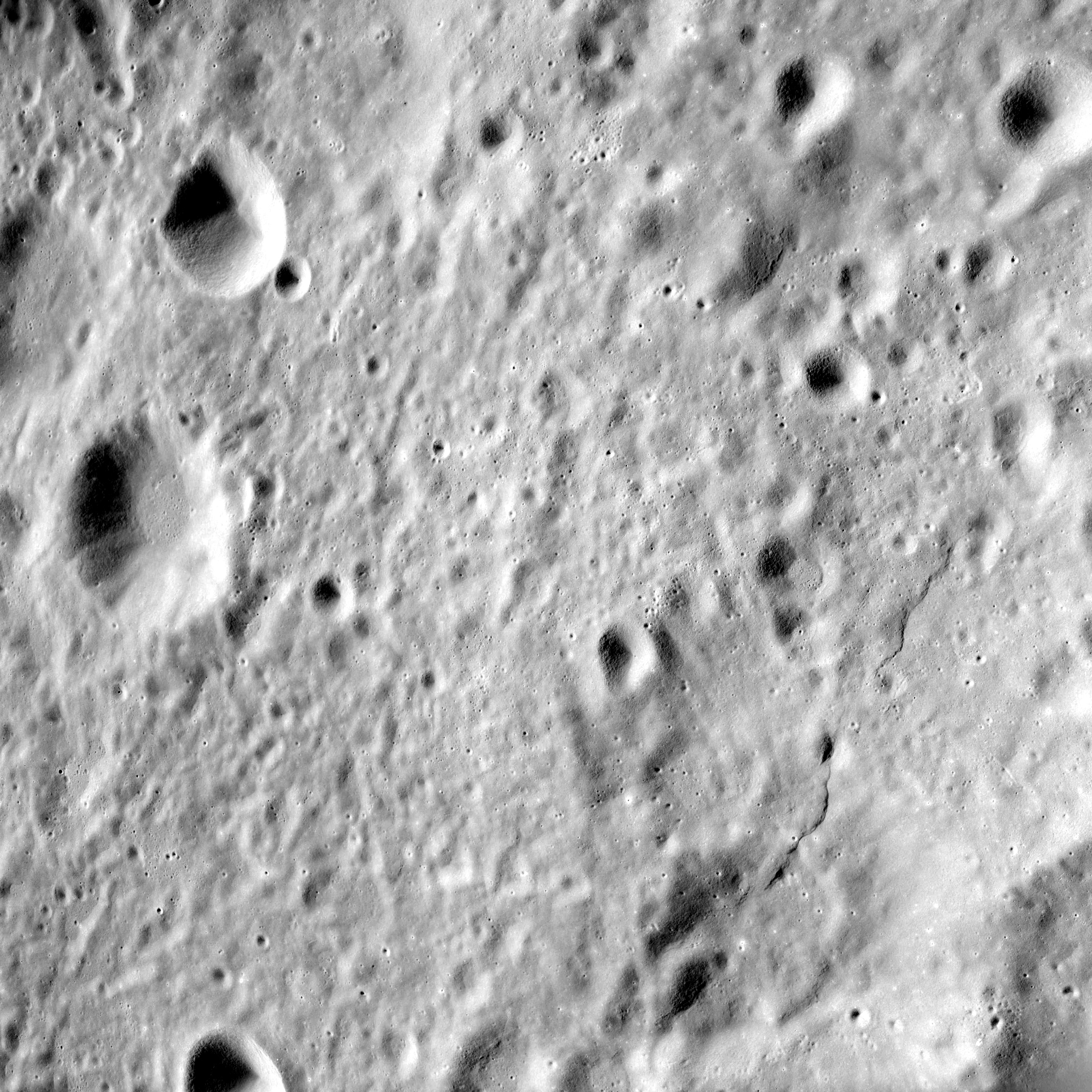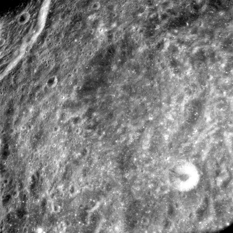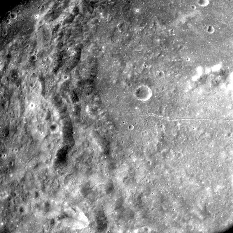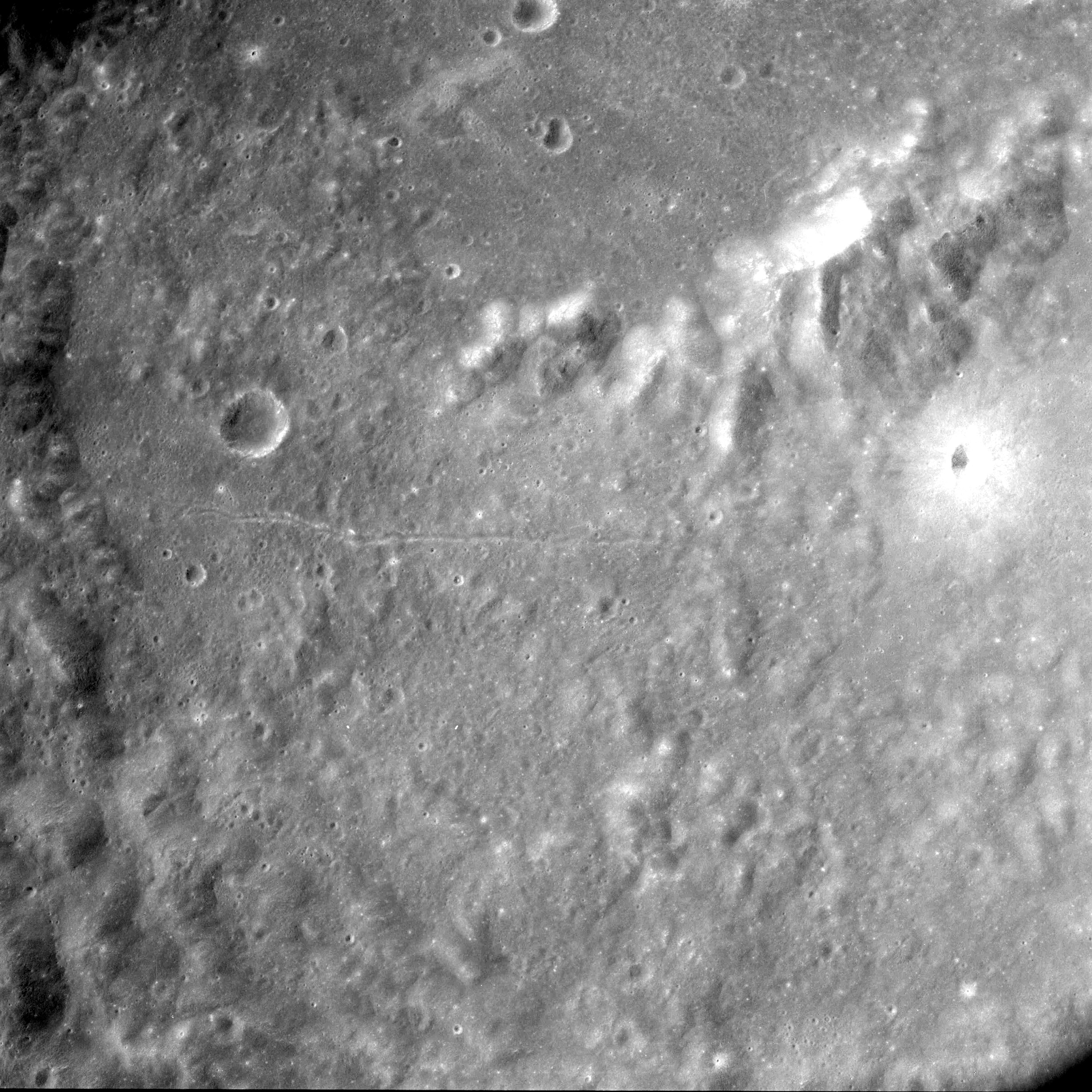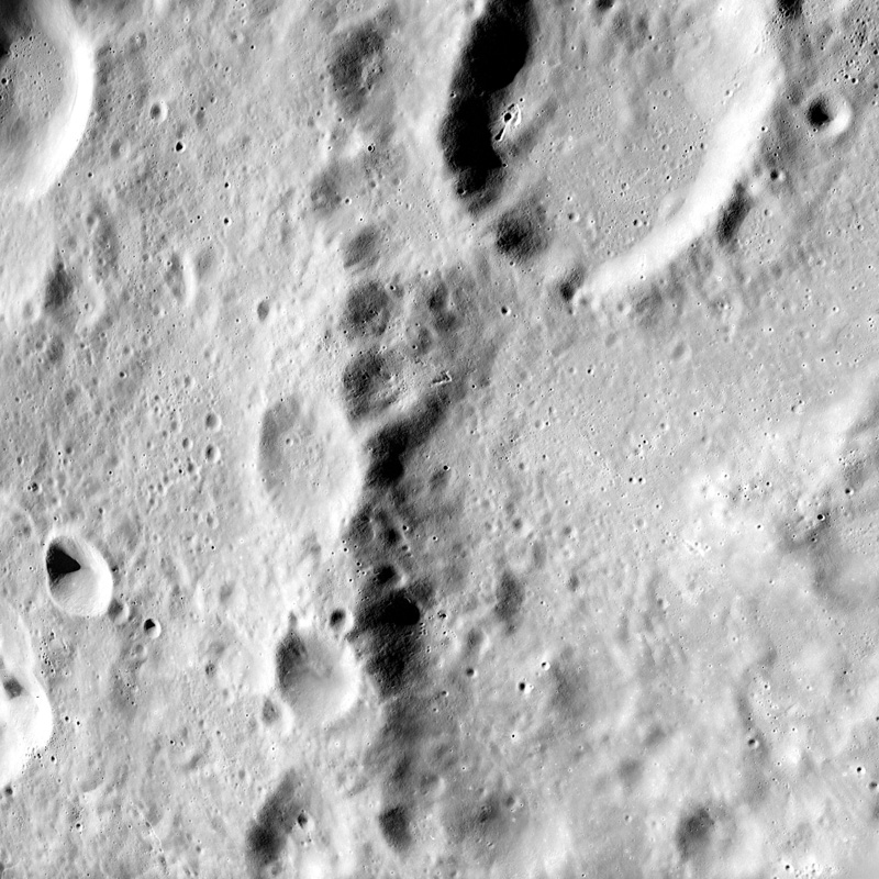 AS08-17-2677 311 kB or 2,275 kB Unnamed elongated crater southeast of far-side crater Icarus. Cut off at top right is Icarus E. Image credit: Image Science and Analysis Laboratory, NASA-Johnson Space Center. |