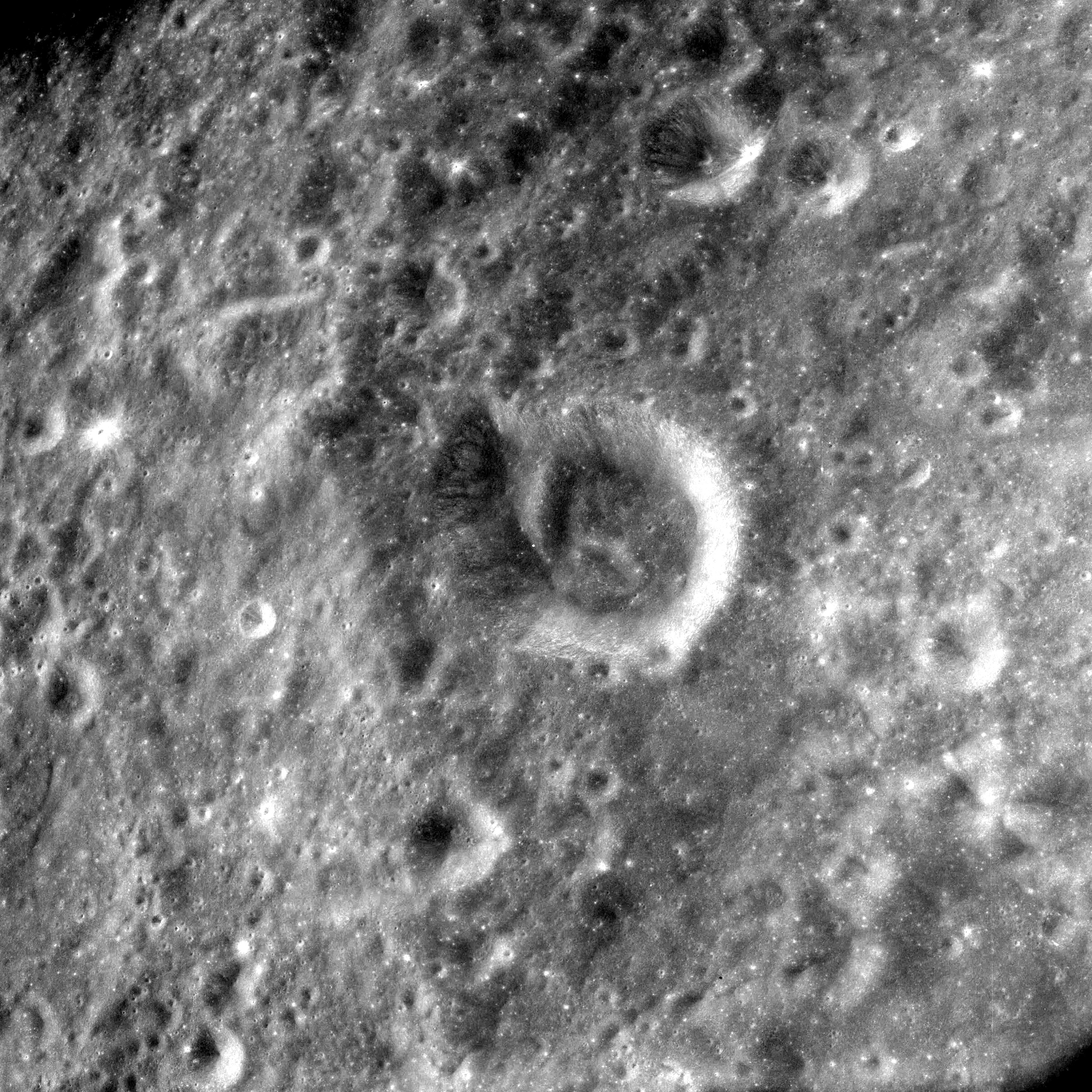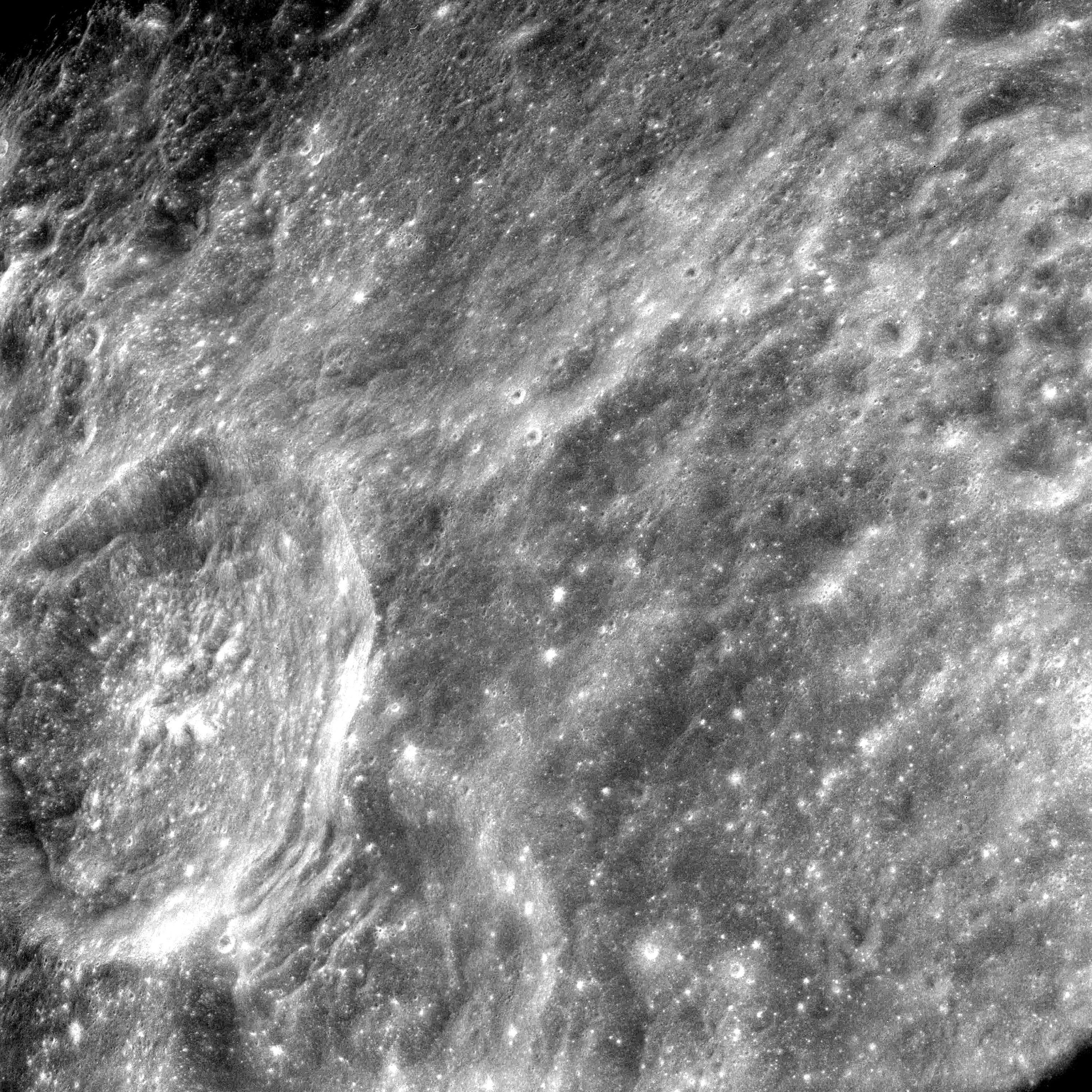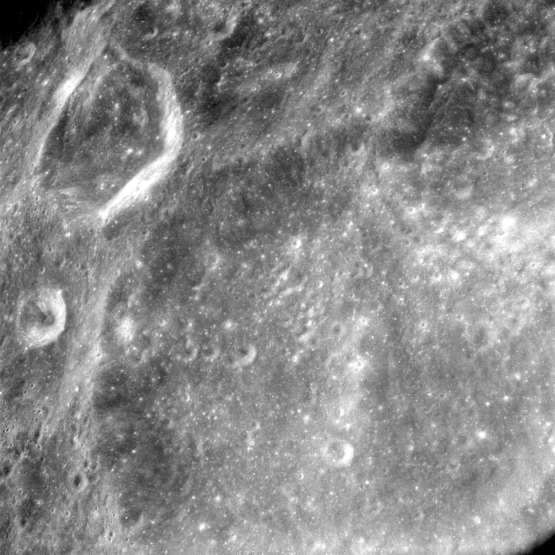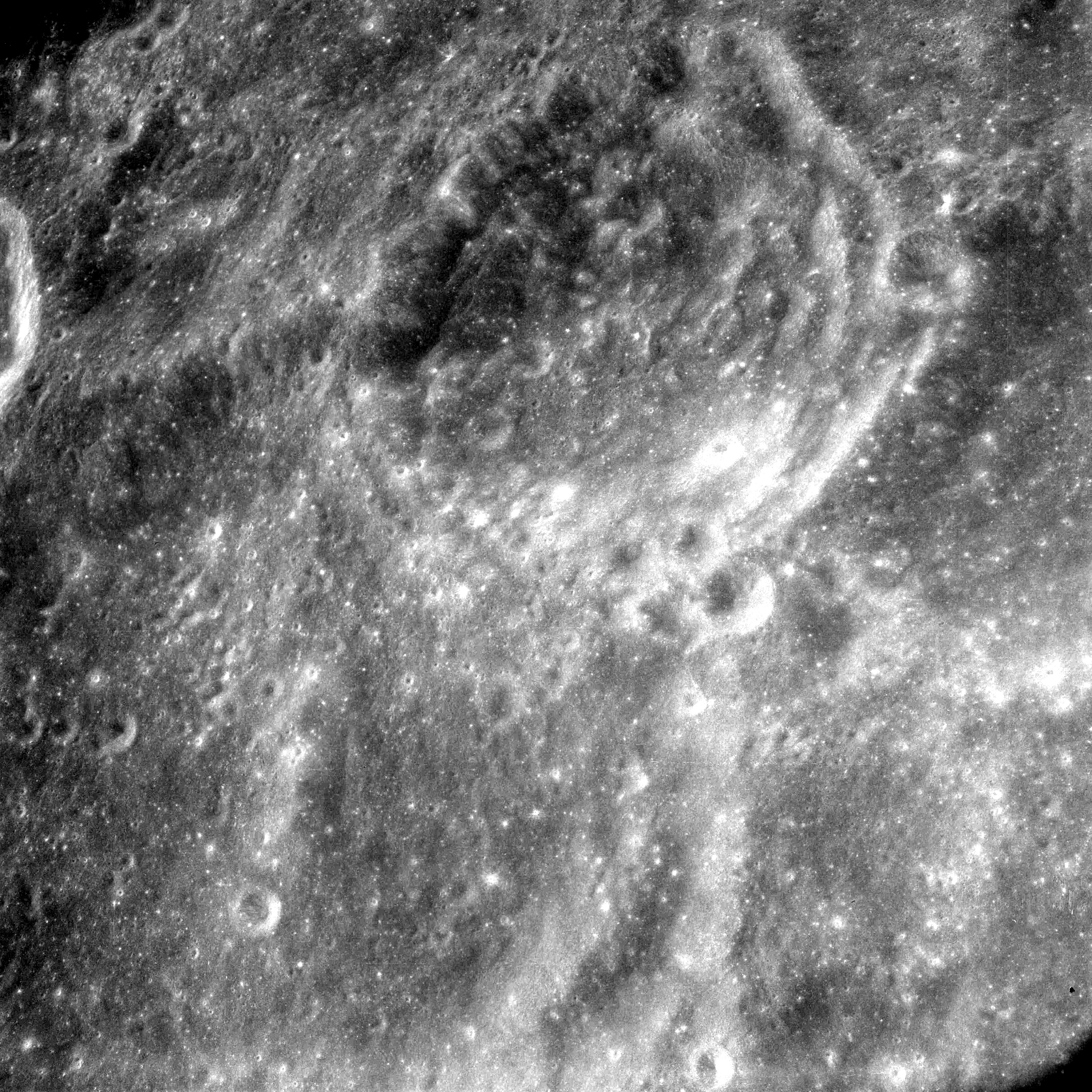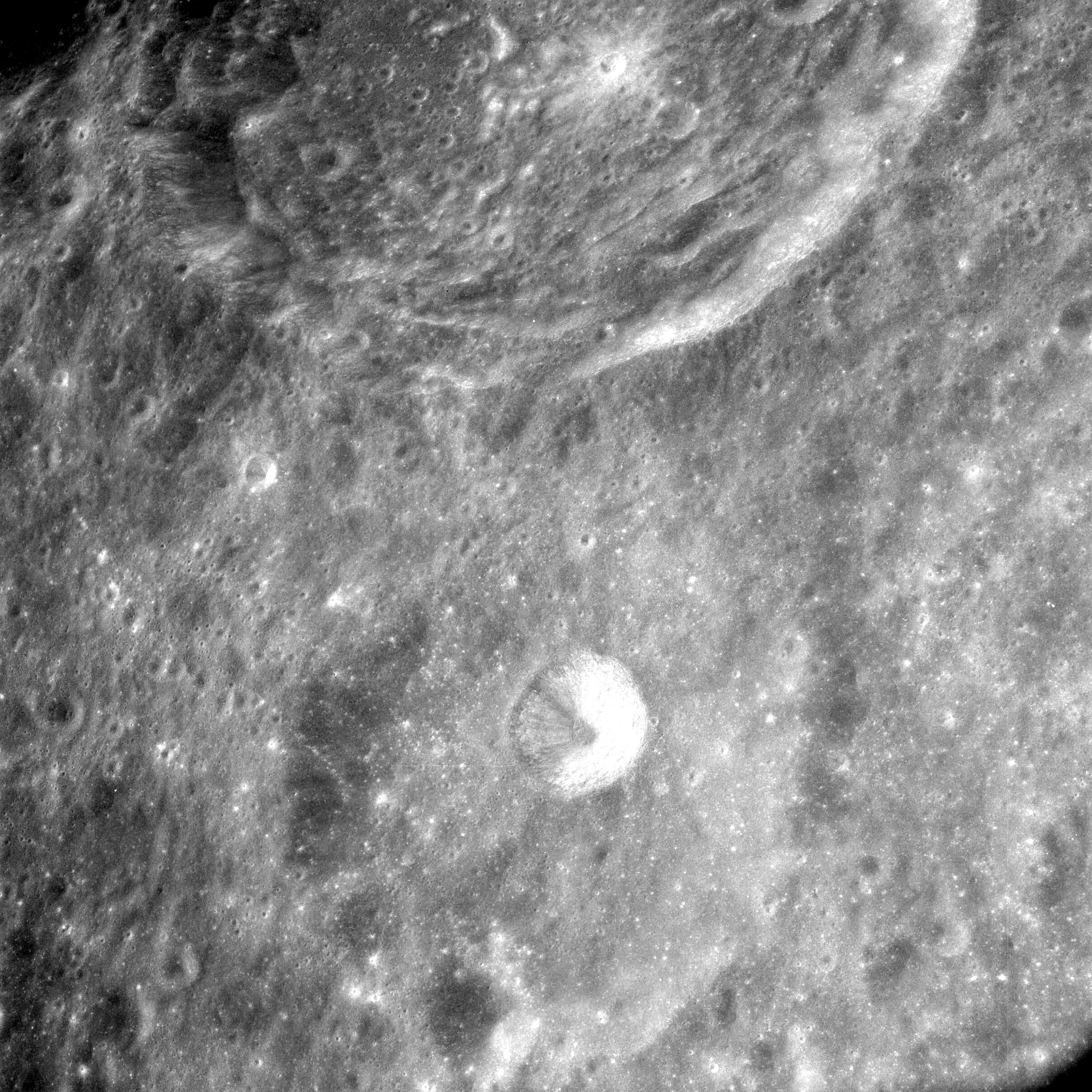 AS08-17-2681 269 kB or 2,096 kB Far-side Crater Amici T. This lies directly south of crater Icarus. Icarus Q is cut off top left. Image credit: Image Science and Analysis Laboratory, NASA-Johnson Space Center. |