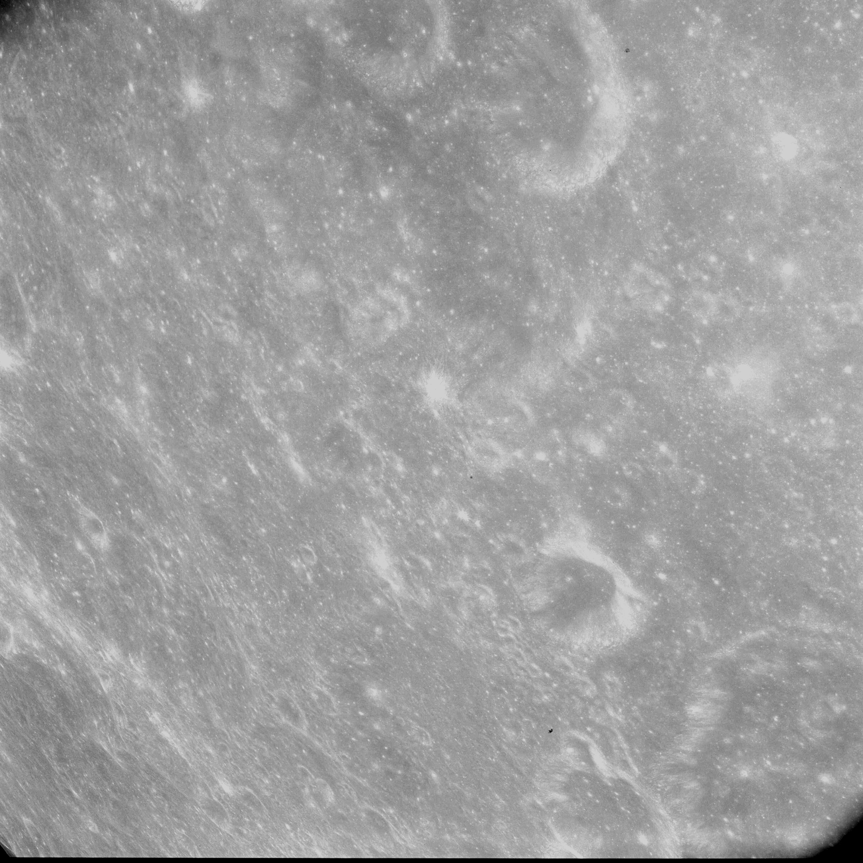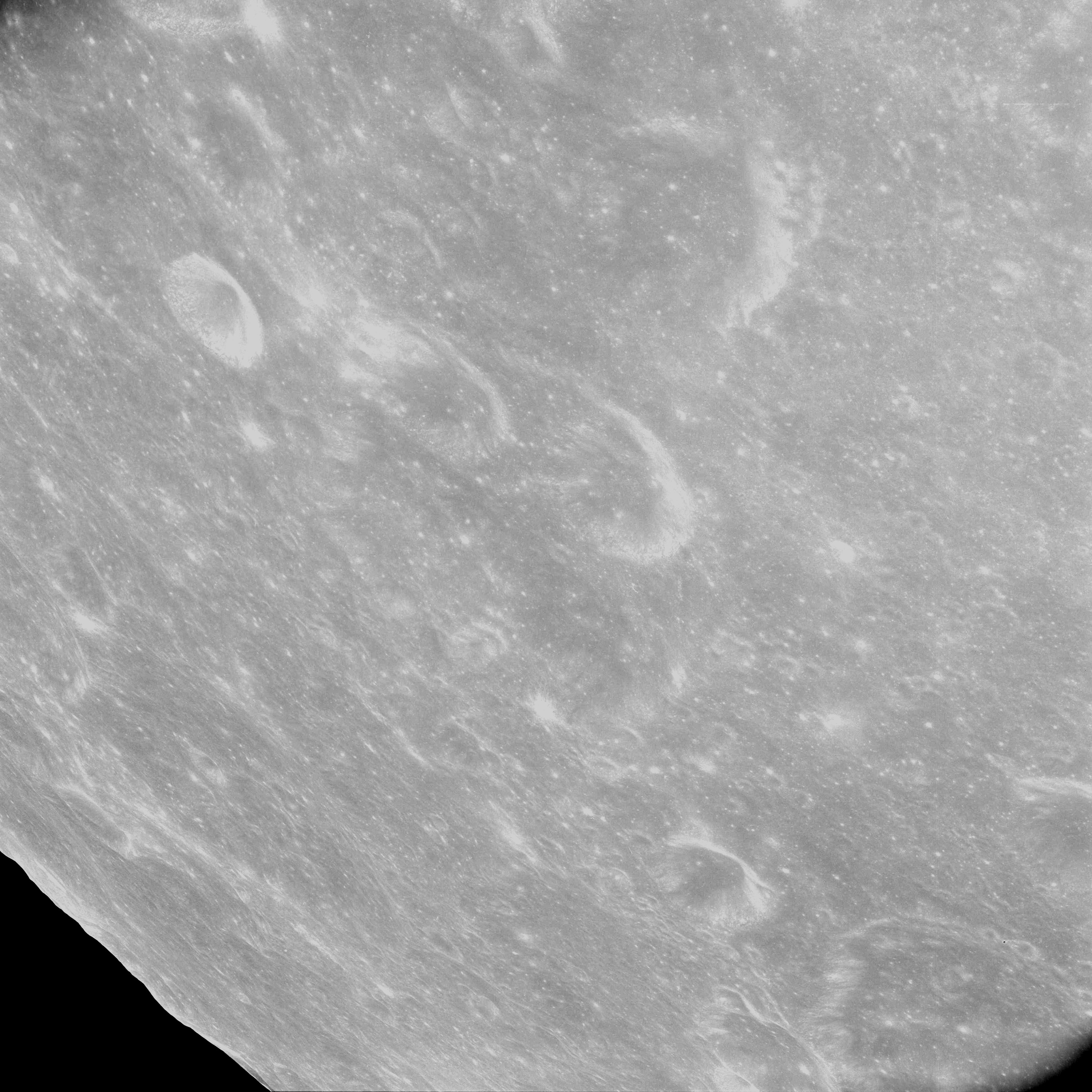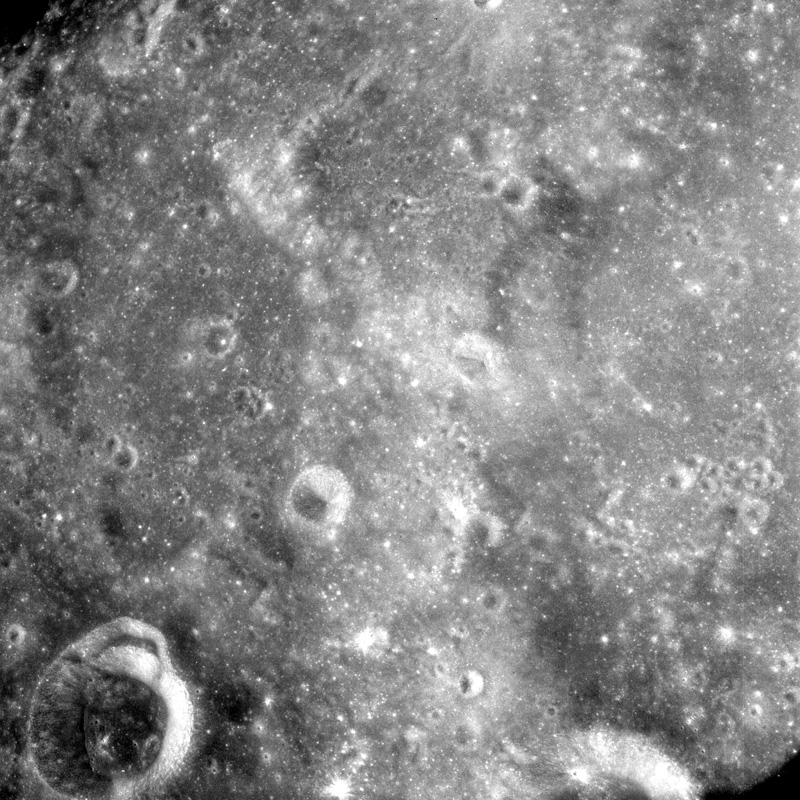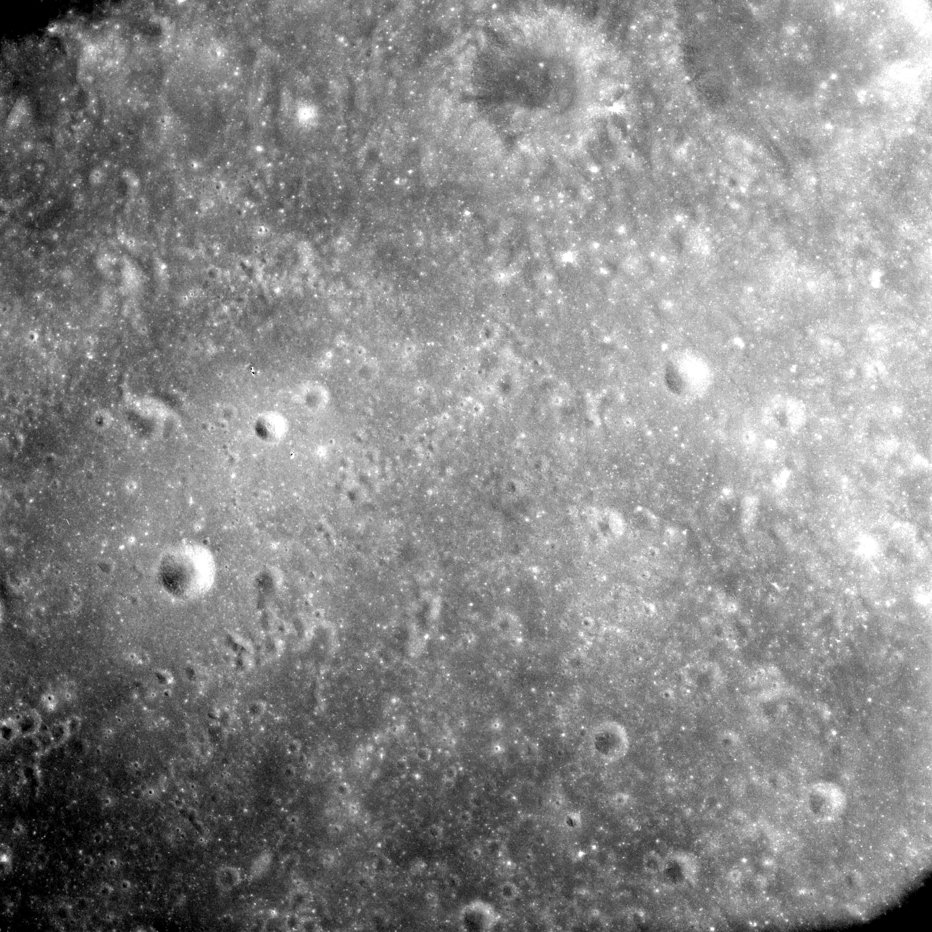 AS08-17-2664 306 kB or 2,279 kB The floor of the far-side multi-ring basin Korolev. The largest crater is Korolev L with Korolev T top left. Cut off at bottom left is the feature known to the Apollo 8 crew as Keyhole due to its shape. A small crater on the northern rim of Keyhole was Jim Lovell's control point for his orbital navigation exercises. Image credit: Image Science and Analysis Laboratory, NASA-Johnson Space Center. |
