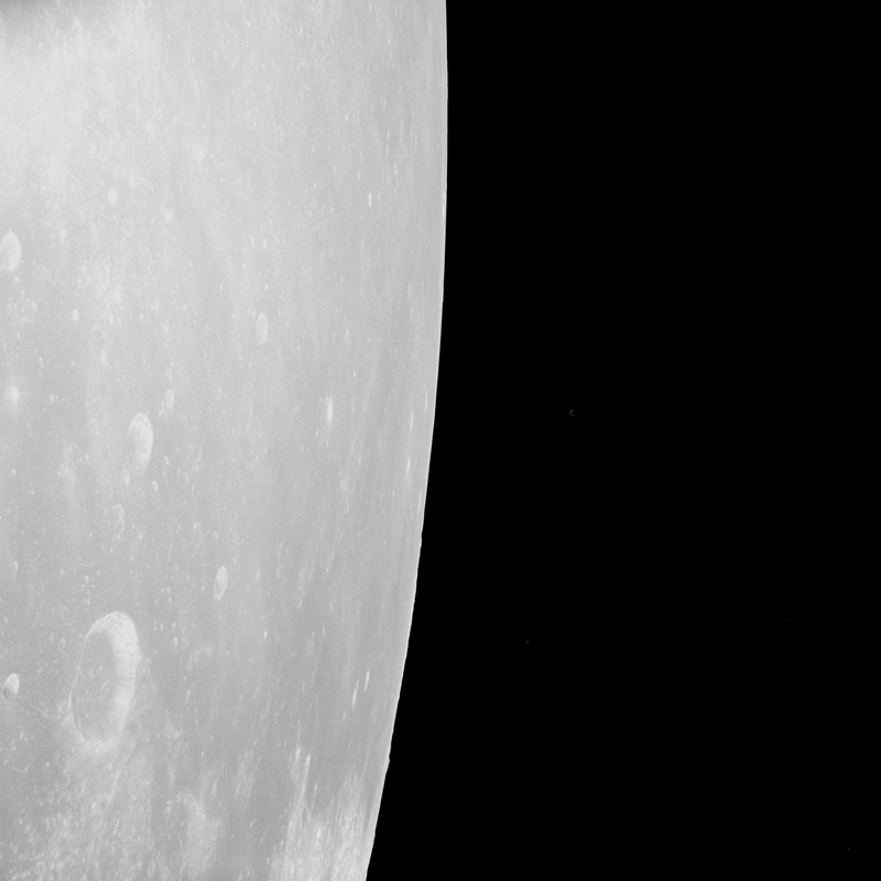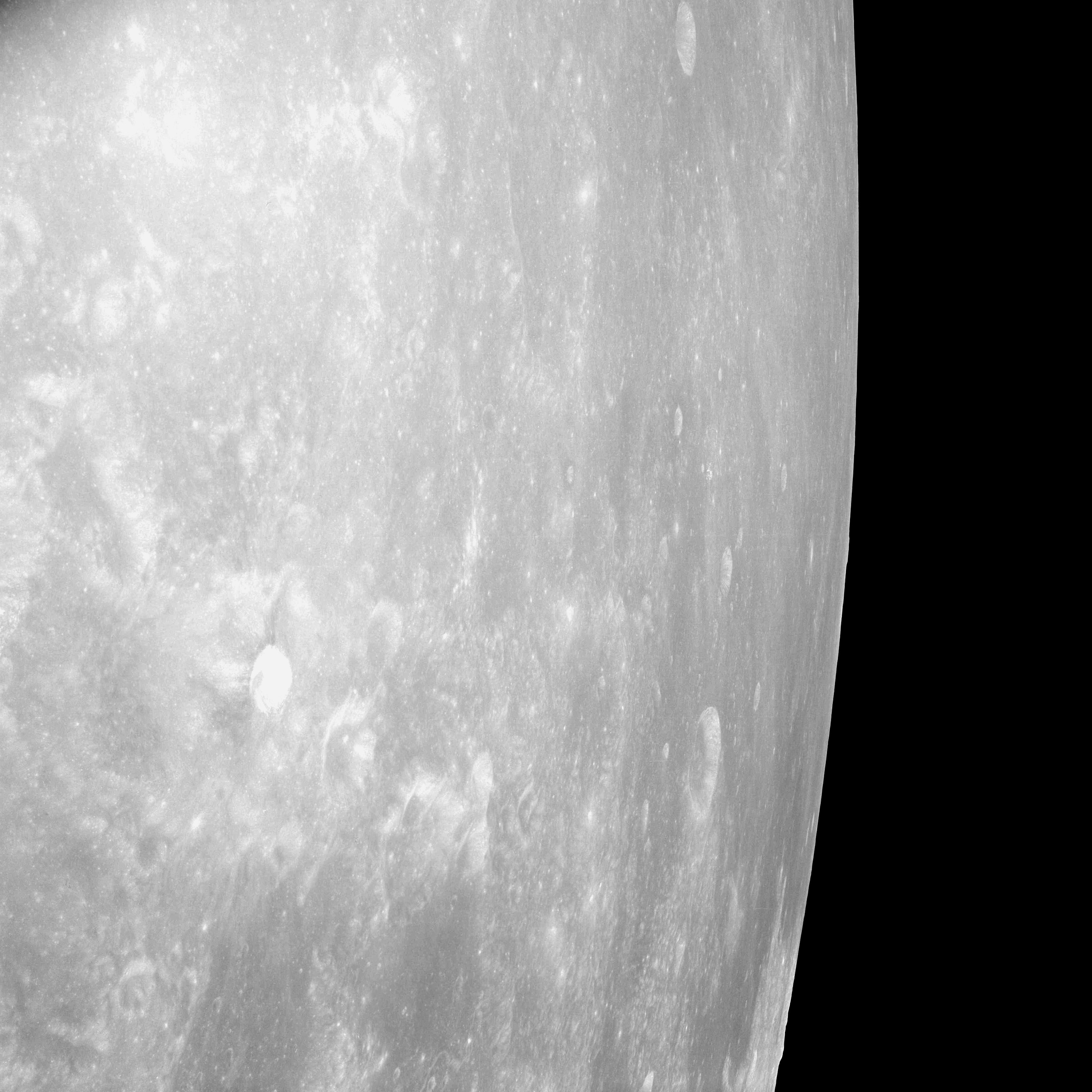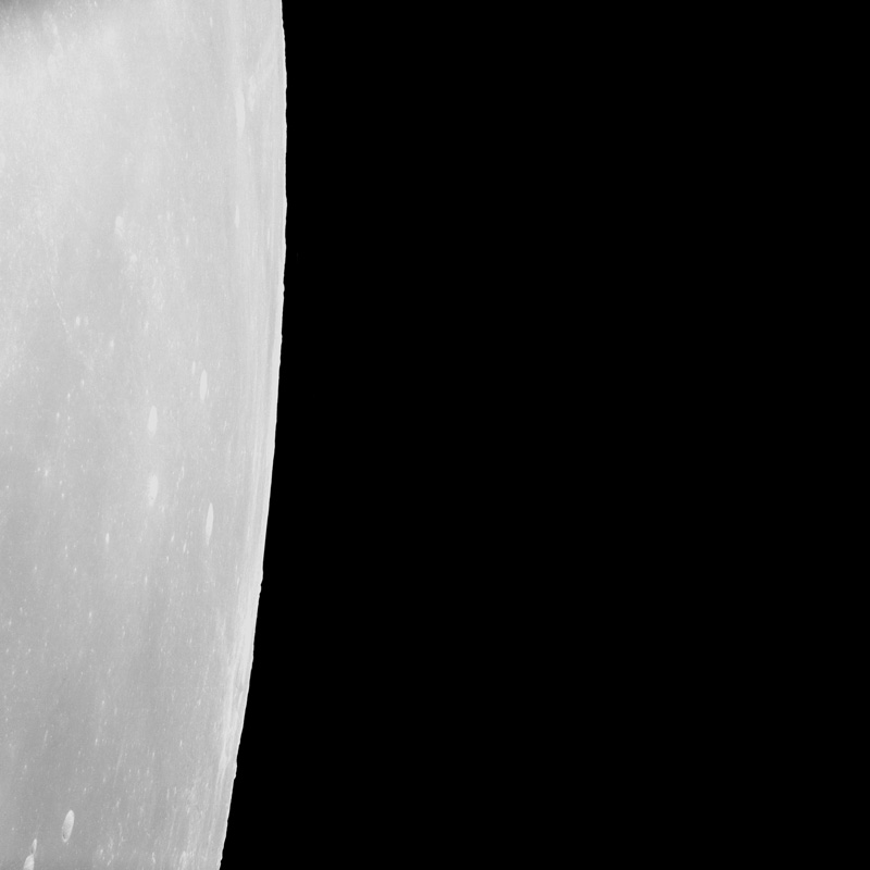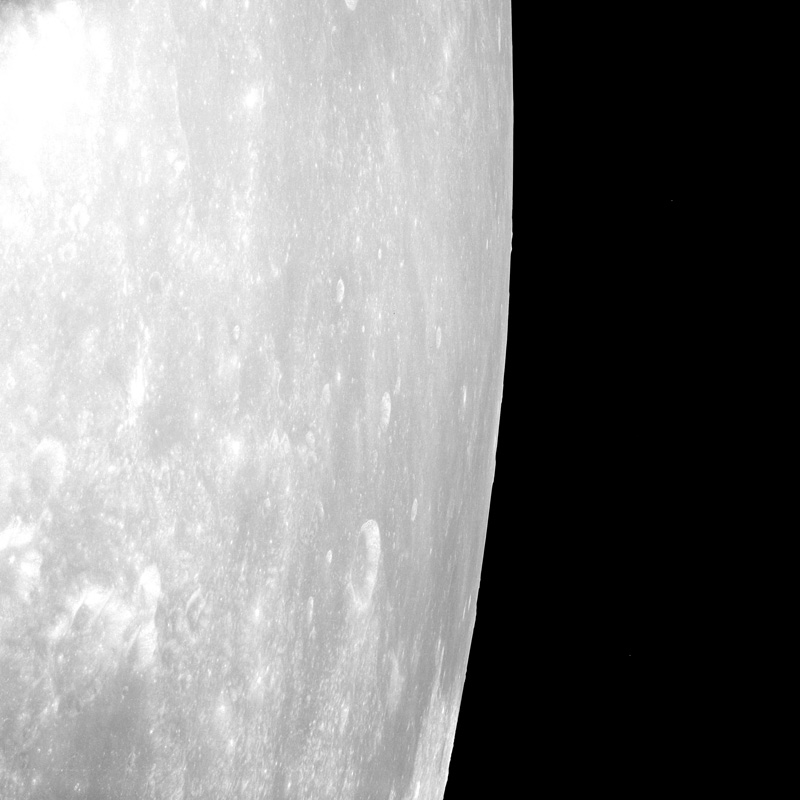 AS08-17-2685 248 kB or 1,901 kB Top centre is far-side crater Daedalus K. Cut off at bottom centre is Racah B. Image credit: Image Science and Analysis Laboratory, NASA-Johnson Space Center. |