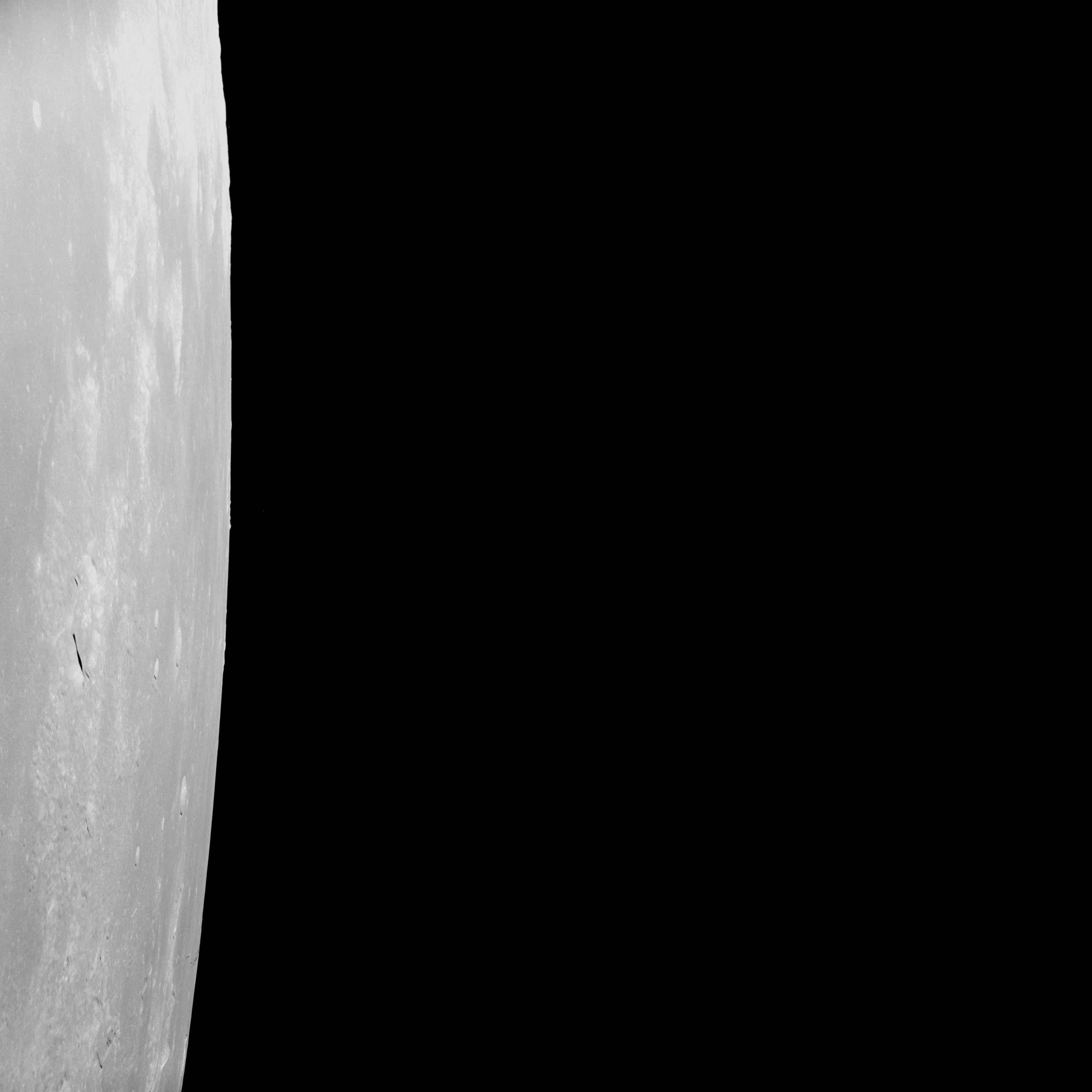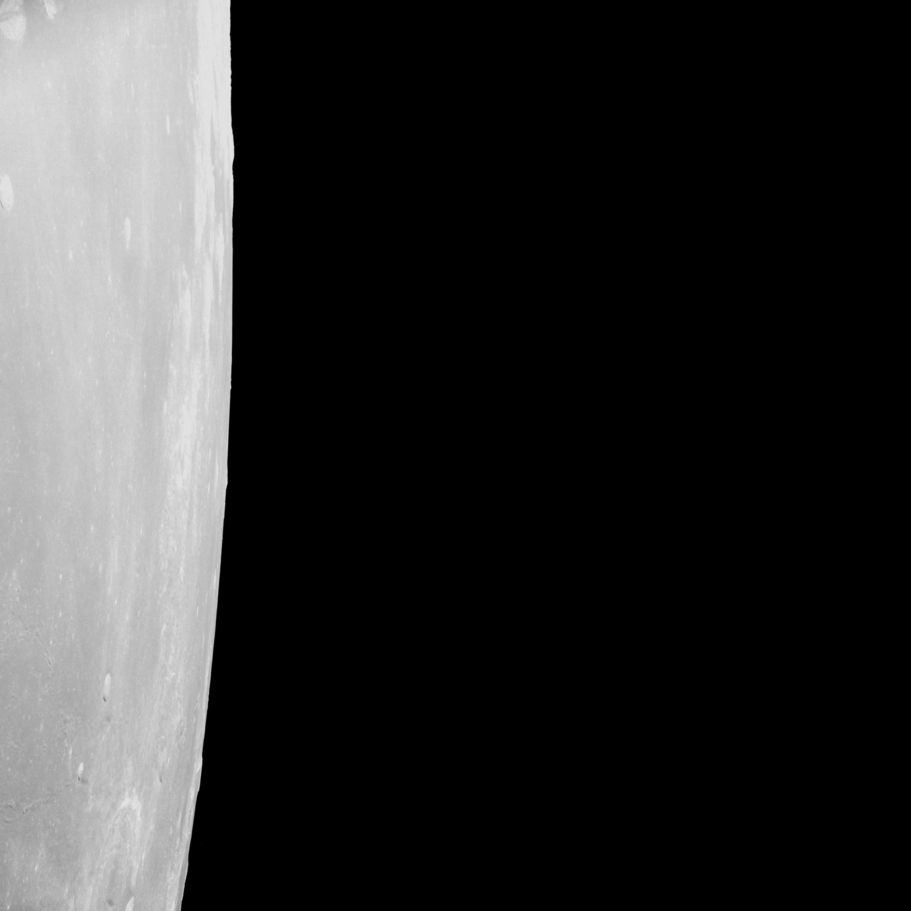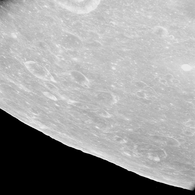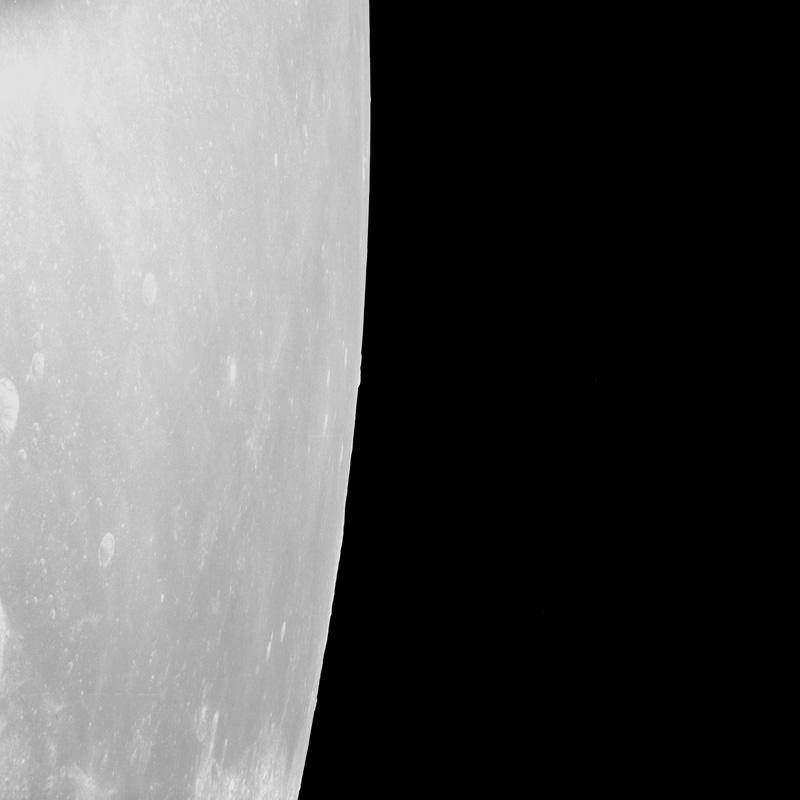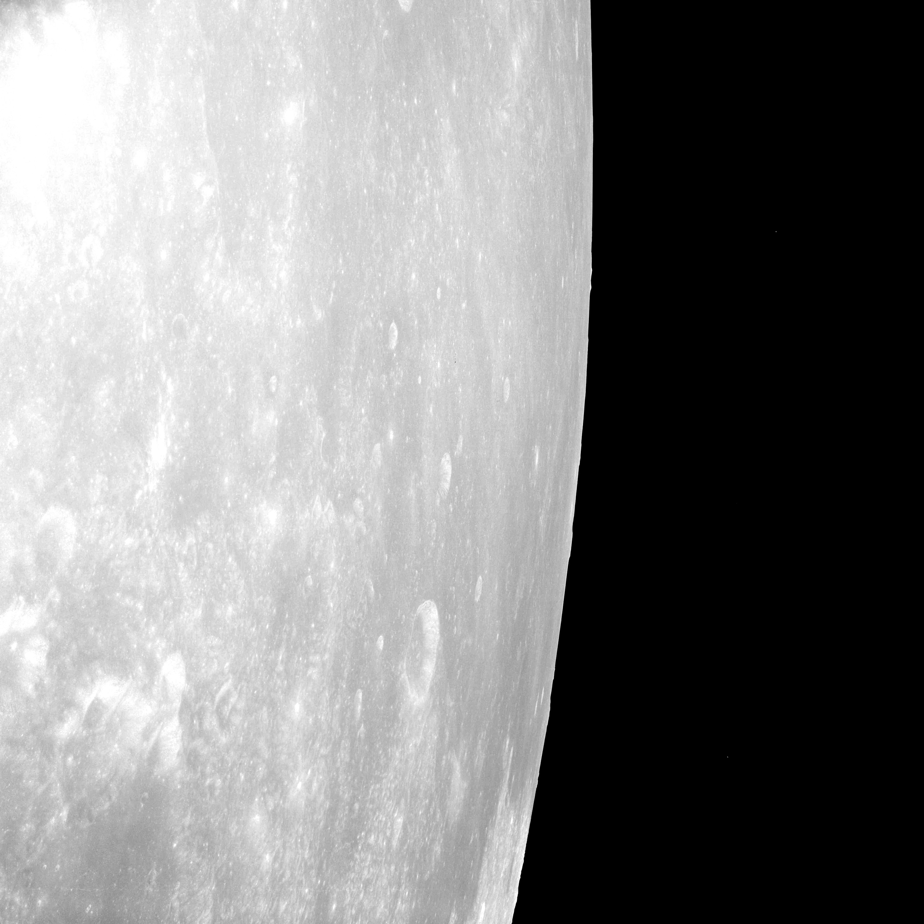 AS08-17-2806 56 kB or 431 kB Mare Fecunditatis, looking west. Unusual crater pair, Messier and Messier A are at the top near the horizon. Image credit: Image Science and Analysis Laboratory, NASA-Johnson Space Center. |