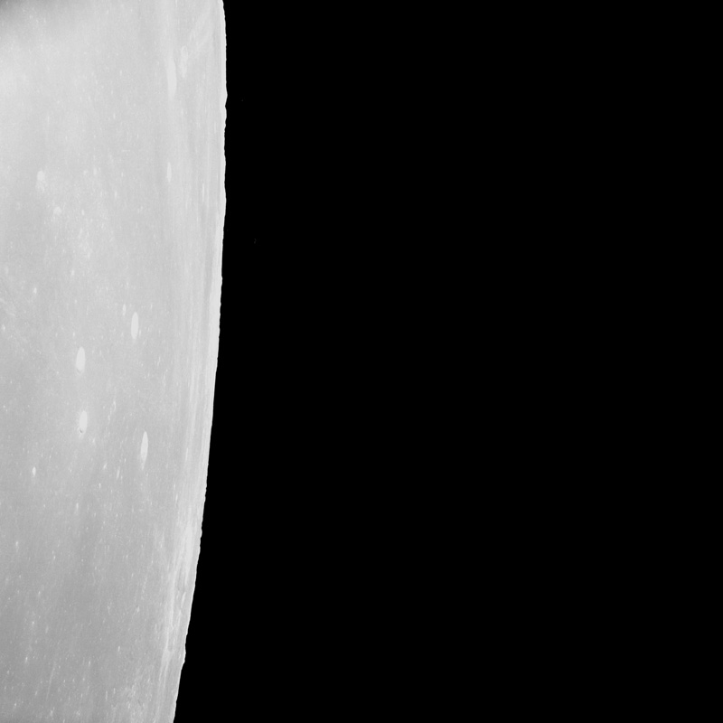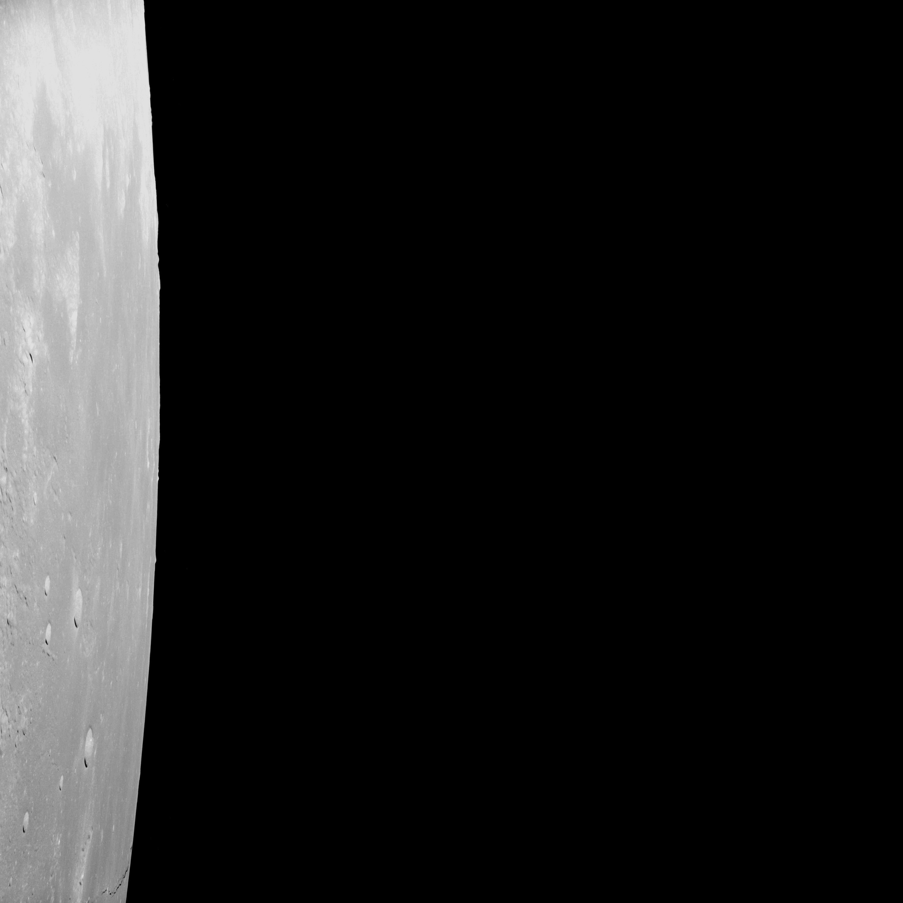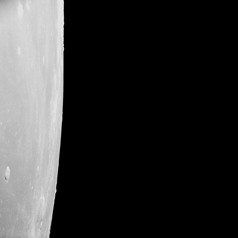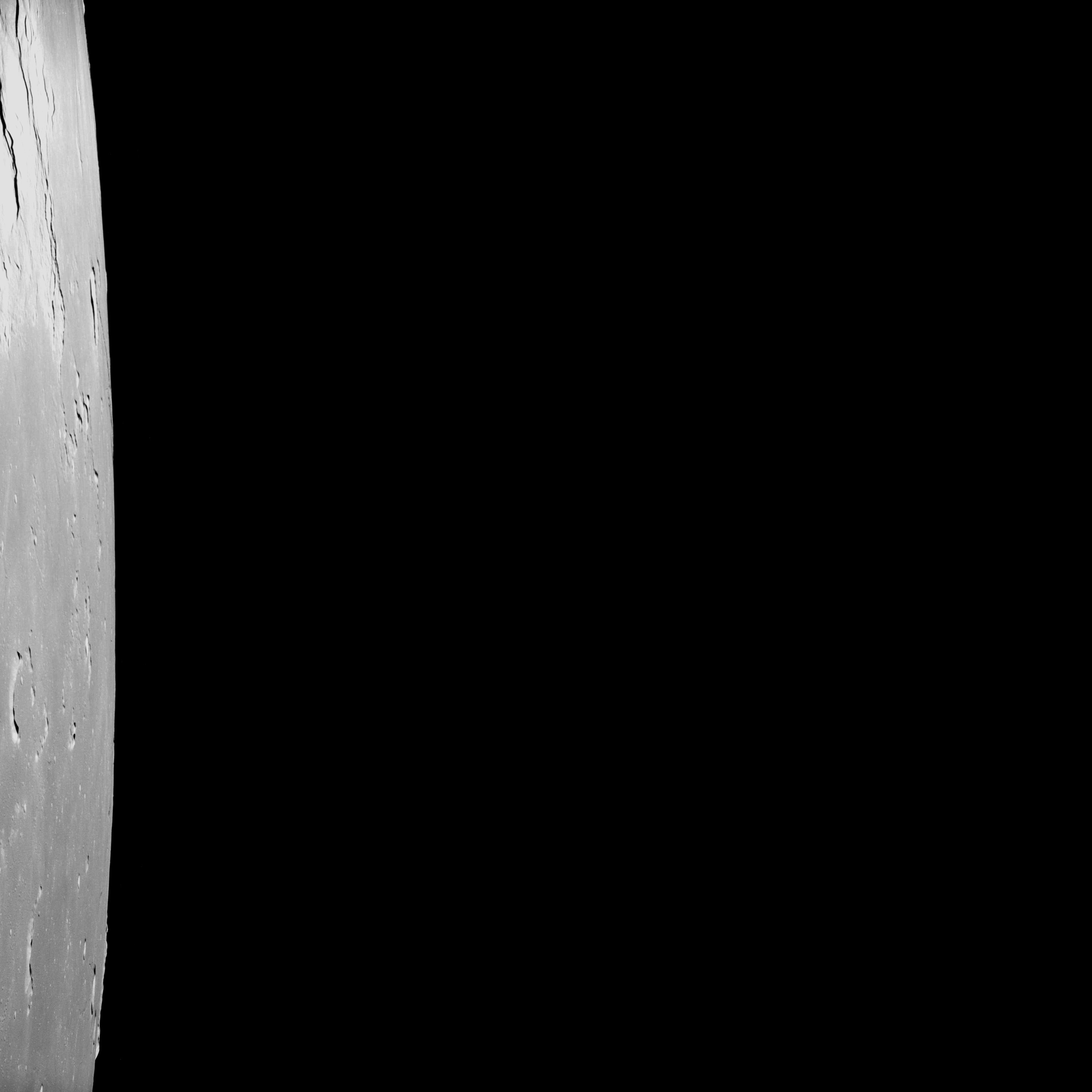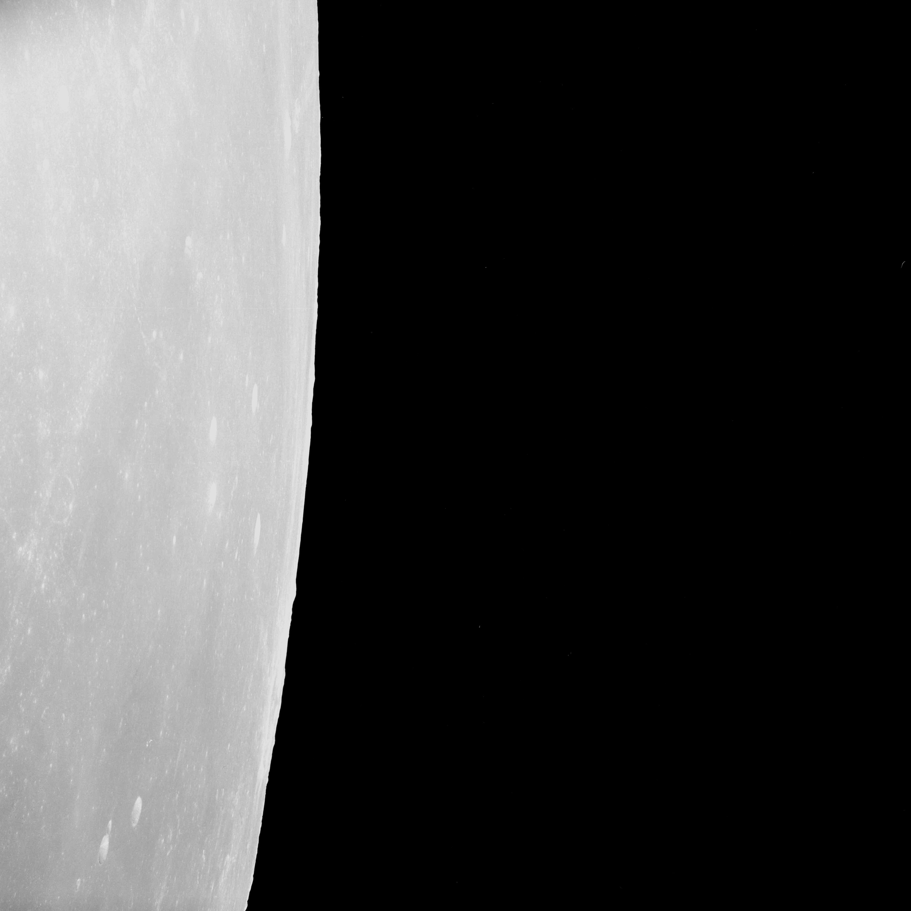 AS08-17-2806 56 kB or 431 kB Mare Fecunditatis, looking west. Unusual crater pair, Messier and Messier A are at the top near the horizon. Image credit: Image Science and Analysis Laboratory, NASA-Johnson Space Center. |