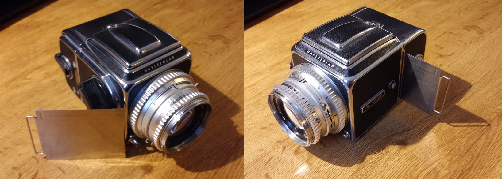 A contemporary Hasselblad 500C camera with a dark slide.