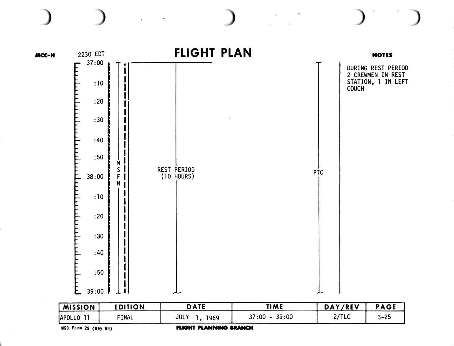 This is Apollo Control at 38 hours, 26 minutes. Here in Mission Control, we are presently going through the shift change. Flight Director Glynn Lunney and his team of flight controllers are coming on to replace Gene Kranz. The capsule communicator on the upcoming shift will be astronaut Ron Evans. Flight Surgeon John Ziegleschmid reported that two of the three crewmen apparently began sleeping at about 38 hours Ground Elapsed Time or about 26 minutes ago. The two that are asleep are Command Module Pilot Mike Collins and Commander Neil Armstrong. Lunar Module Pilot Buzz Aldrin, at last report, was still awake. We expect the change of shift press briefing will occur at about 11:15 Central Daylight Time. At 38 hours, 27 minutes; this is Apollo Control, Houston.