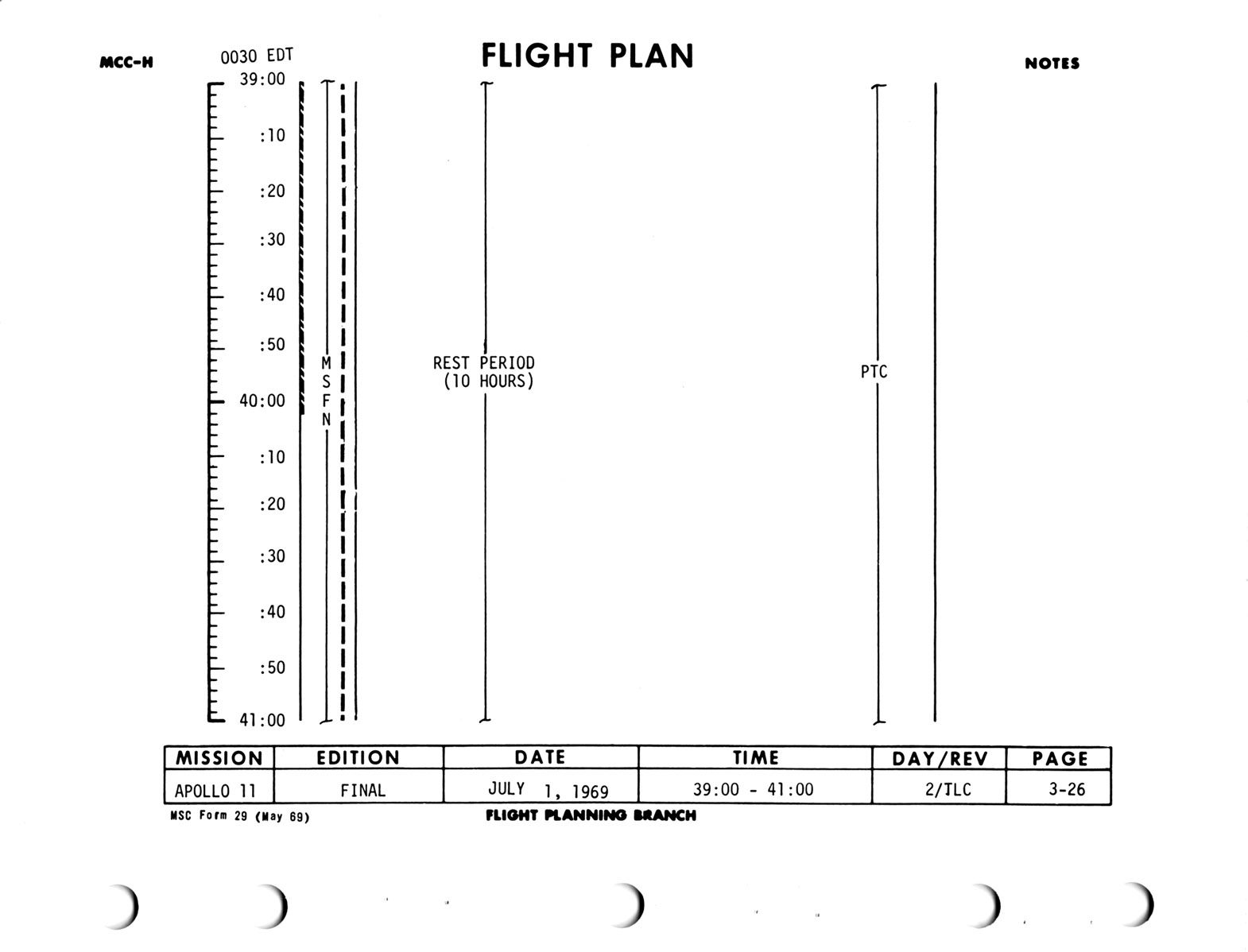 This is Apollo Control; 39 hours, 40 minutes Ground Elapsed Time. Apollo 11 crew at this time, all three soundly asleep. The space digitals display - stand by. Space digitals display here in Mission Control now showing 82,905 nautical miles [153,540 km] out from the Moon. Velocity; 3,897 feet per second [1,188 m/s] relative to the Moon. Awake time; 7 hours, 19 minutes away. Spacecraft presently over the west-central Pacific, if a line were projected back toward its nearest point on Earth. And at 39 hours, 41 minutes Ground Elapsed Time; this is Apollo Control.