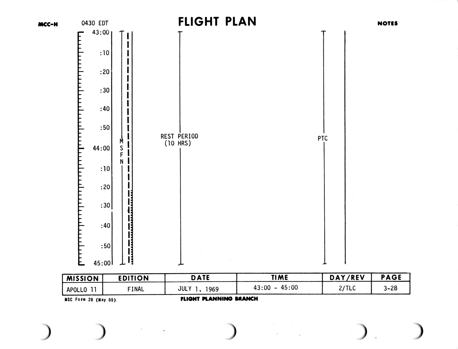 This is Apollo Control; 45 hours, 28 minutes Ground Elapsed Time. A little more than an hour remaining in the Apollo 11 crew sleep period. Present velocity; 3,799 feet per second [1,158 m/s]. Distance from Moon; 69,810 nautical miles [129,288 km]. Apollo 11 will continue decelerating as it gets to the point where the Moon's sphere of influence overcomes the Earth's sphere of influence. This point will take place - This event will take place at 61 hours, 39 minutes and 57 seconds Ground Elapsed Time; according to the Flight Dynamics Officer. At this point, the spacecraft-to-Moon distance will be 33,822 nautical miles [62,638 km]; spacecraft-to-Earth distance, 186,437 nautical miles [345,281 km]. The velocity will have slowed to a relative crawl. At this point; the Earth-referenced, 2,990 feet per second [911 m/s]; Moon referenced, 3,772 feet per second [1,150 m/s]. Clock counting down to lunar touchdown, which as mentioned before will likely be changed as the spacecraft goes into lunar orbit and the data is refined, some of the times change a few seconds one way or the other. At any rate, the landing clock now showing 57 hours, 17 minutes until lunar landing. At 45 hours, 30 minutes Ground Elapsed Time; this is Apollo Control.
