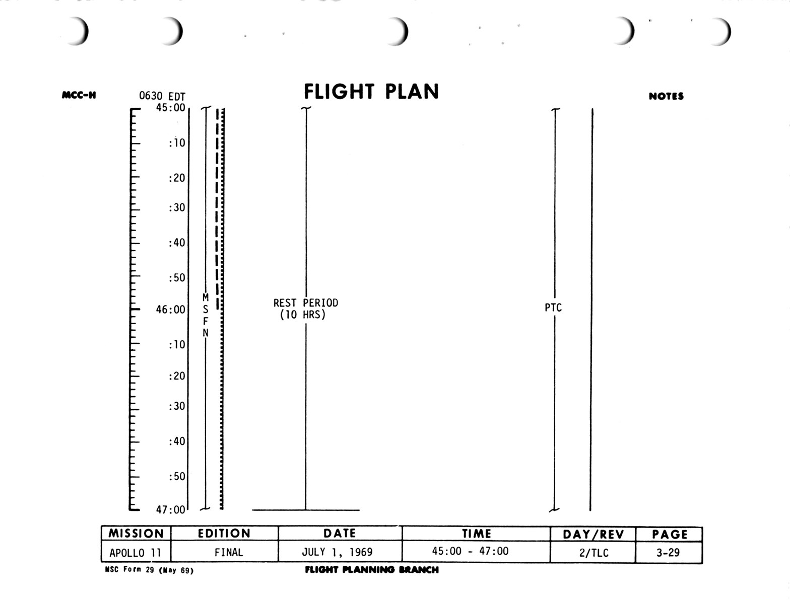 This is Apollo Control at 48 hours into the Apollo 11 mission. The spacecraft is 160,760 nautical miles [297,728 km] from Earth. The distance from the Moon is 64,115 nautical miles [118,741 km]. Earth-referenced velocity; 3,529 feet per second [1,076 m/s]. The rest period has now lasted an hour longer than the 10-hour period scheduled. It's extended to 11 hours now. Flight Surgeon says there are indications that the commander, Neil Armstrong, may be awakening. Some stirring around. However, we have not yet put in a call to the crew. The midcourse correction-3, scheduled for this afternoon at an elapsed time of 53 hours, 54 minutes, has been cancelled. The velocity value for that midcourse is only eight-tenths of a foot per second so we will not - not do midcourse correction Number 3. We'll continue to stand by for either a call from the ground or a call from the spacecraft.