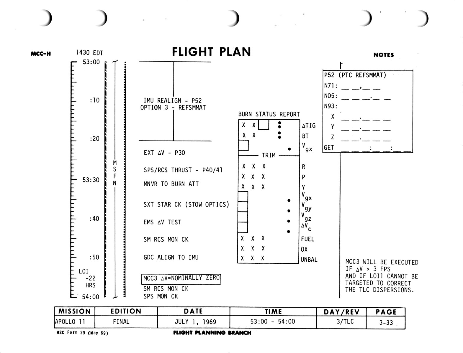 048:12:17 McCandless: Roger, 11. We'd like to perform a waste-water dump at your convenience some time in the near future here. No particular time scheduled. Down there at the time for Midcourse Correction 3, which is about 53:55, we're deleting Midcourse Correction number 3 and all the items associated with it. For your information, the calculated value of the burn for Midcourse number 3 was eight-tenths of a foot per second, that is 0.8 feet per second. Canceling this, if we decide to burn Midcourse Correction-4, this would then give you a burn for Midcourse Correction-4 of 2.0 feet per second. At 53 hours, we have an IMU realign P52. We're requesting that you do this while in PTC, and we plan to continue PTC throughout the day. Over.