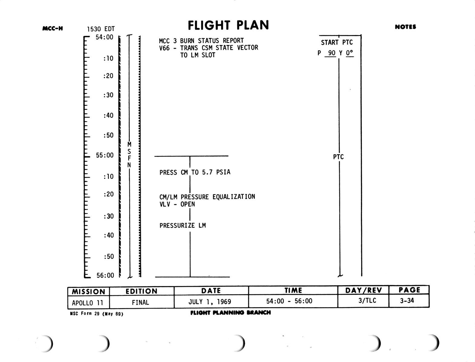 048:17:56 McCandless: Roger, 11. The magnitudes of the midcourse corrections were just for your information, but Midcourse 4 was down around 2.0 feet per second. Again, for your information, on SPS chamber pressure, it looks like your onboard readout of 87 psi corresponds to 92 psi by our telemetry, and your value of 89 on board corresponds to 94. Over. [Long pause.]