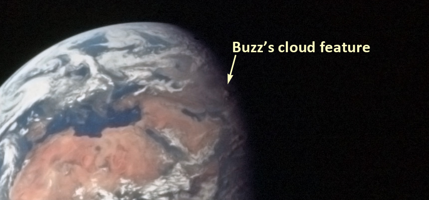 048:32:35 Aldrin: Houston, Apollo 11. We've got the continent of Africa right facing toward us right now, and of course, everything's getting smaller and smaller as time goes on. The Mediterranean is completely clear. The Sun looks like it's about to set around Madagascar. The equatorial belt of Africa stands out quite clearly. We're seeing a dark green or a muddy colored green, compared to the sandier colors of the southern tip of Africa and, of course, the Sahara northern coast of Africa. There's a rather remarkable cloud that appears in the vicinity of the border between Afghanistan and Pakistan. It's just about to go into the sunset now. It is casting quite a large shadow. It's isolated. There don't seem to be any other clouds. The band of clouds near the tropical convergent clouds down around the equator clearly separate the clockwise and the counter-clockwise cloud formations. Over.