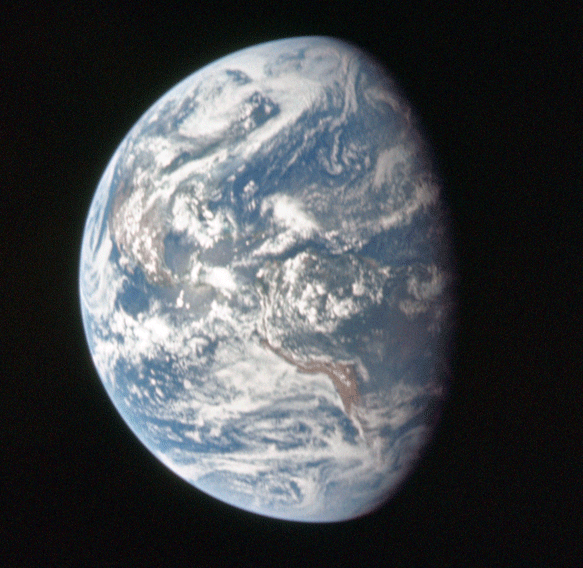 AS11-36-5380 - Earth at about 321,000 km or 173,300 nautical miles. North is to the bottom. The North and South American continents run along the daylit face of the planet. This version suffered from a degree of camera shake. Image by LPI.