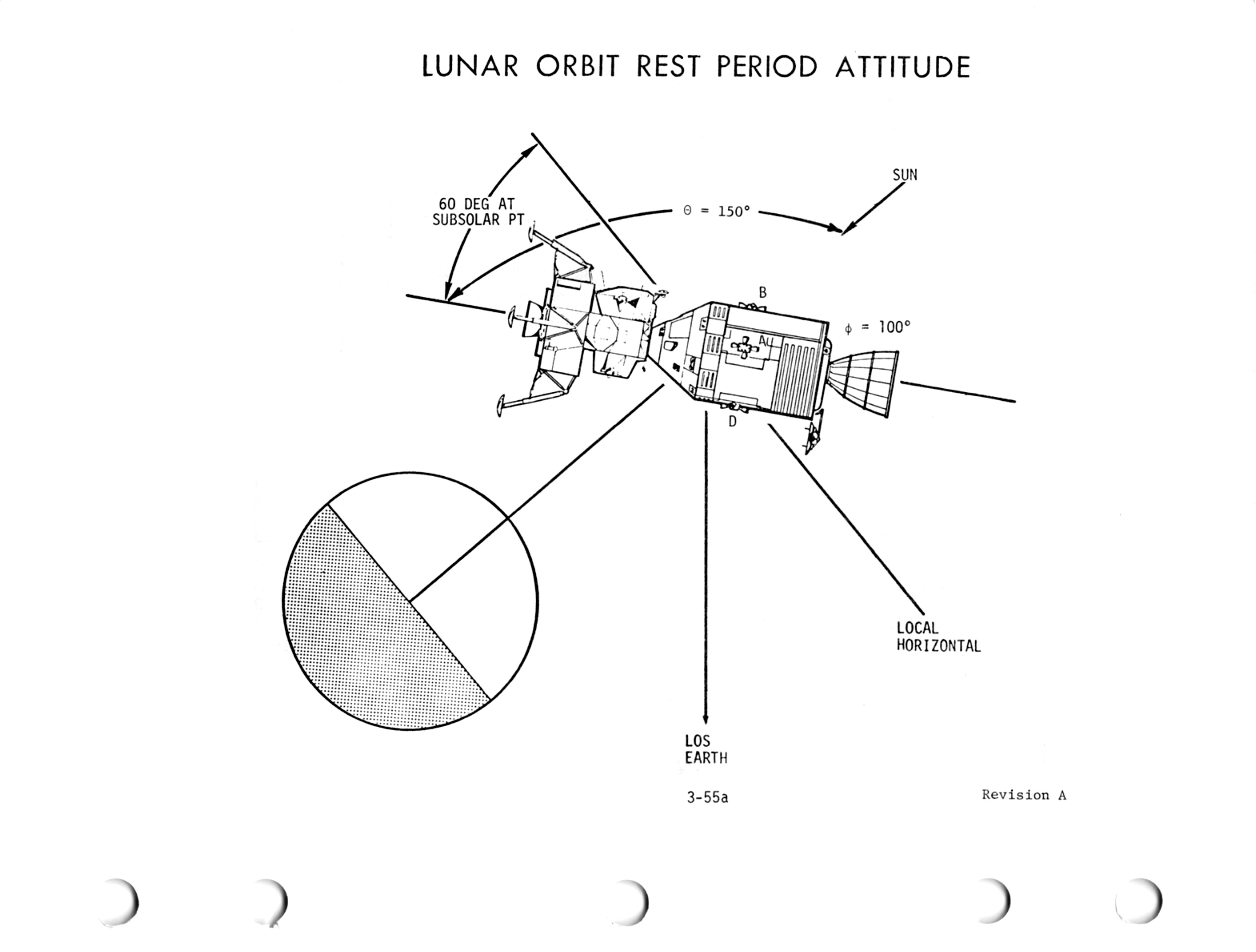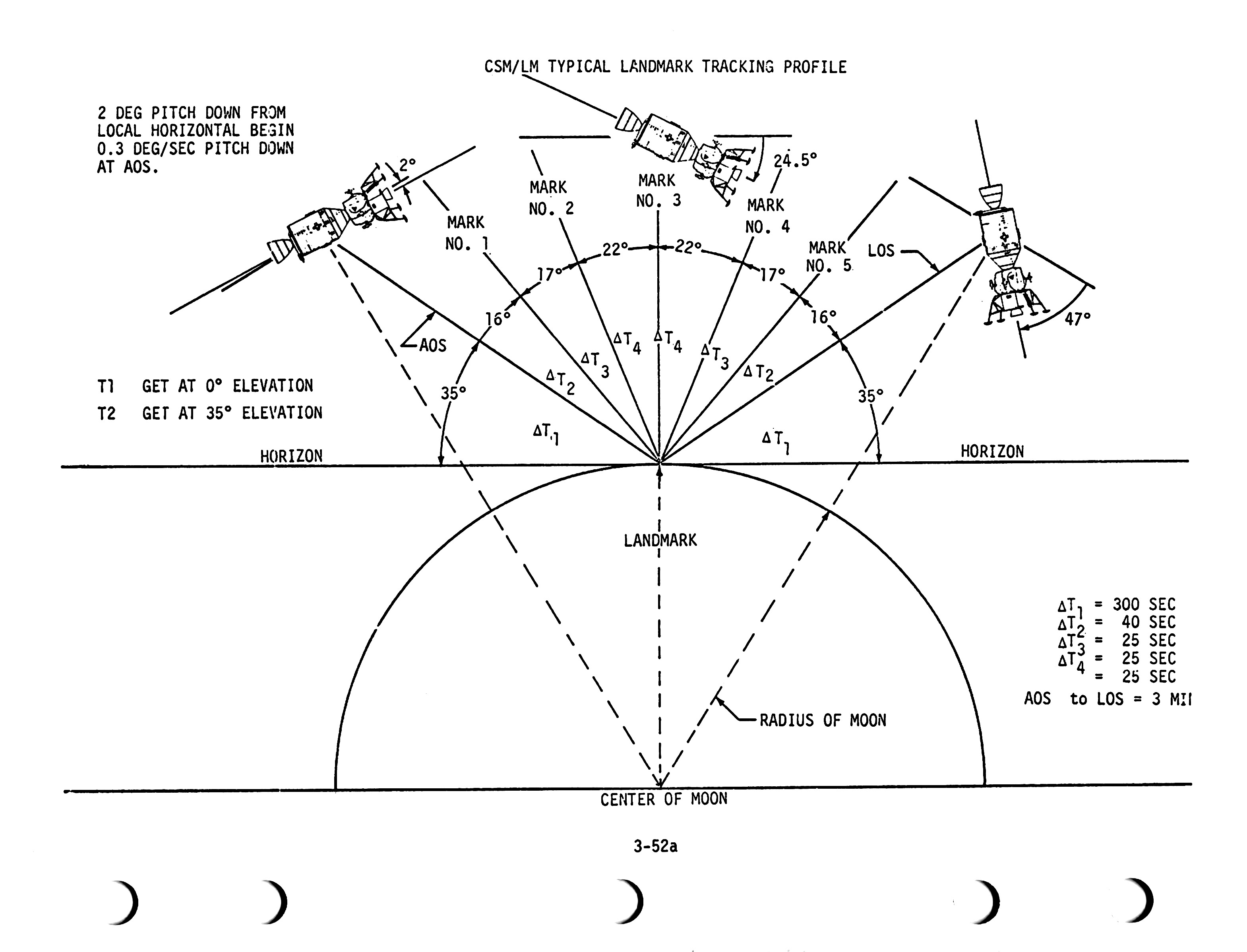 When the spacecraft reaches T2, Mike will begin a pitchdown manoeuvre at 0.3° per second. As the spacecraft coasts over the landmark, he will take marks on it using the optics at about 25-second intervals until it reaches 35° elevation on the other side. These marks provide the computers with a geometrical link between the spacecraft's orbit and the landscape below.