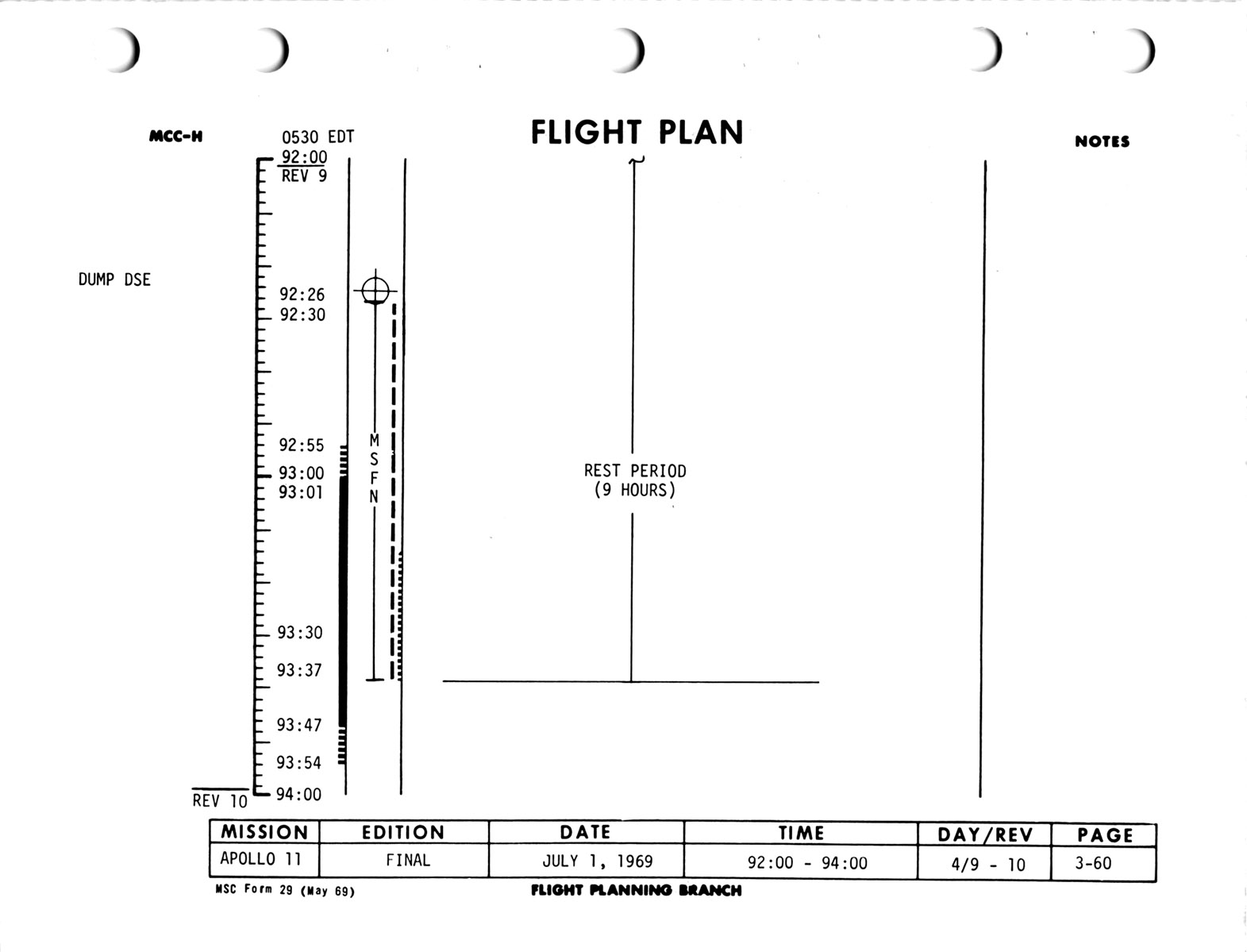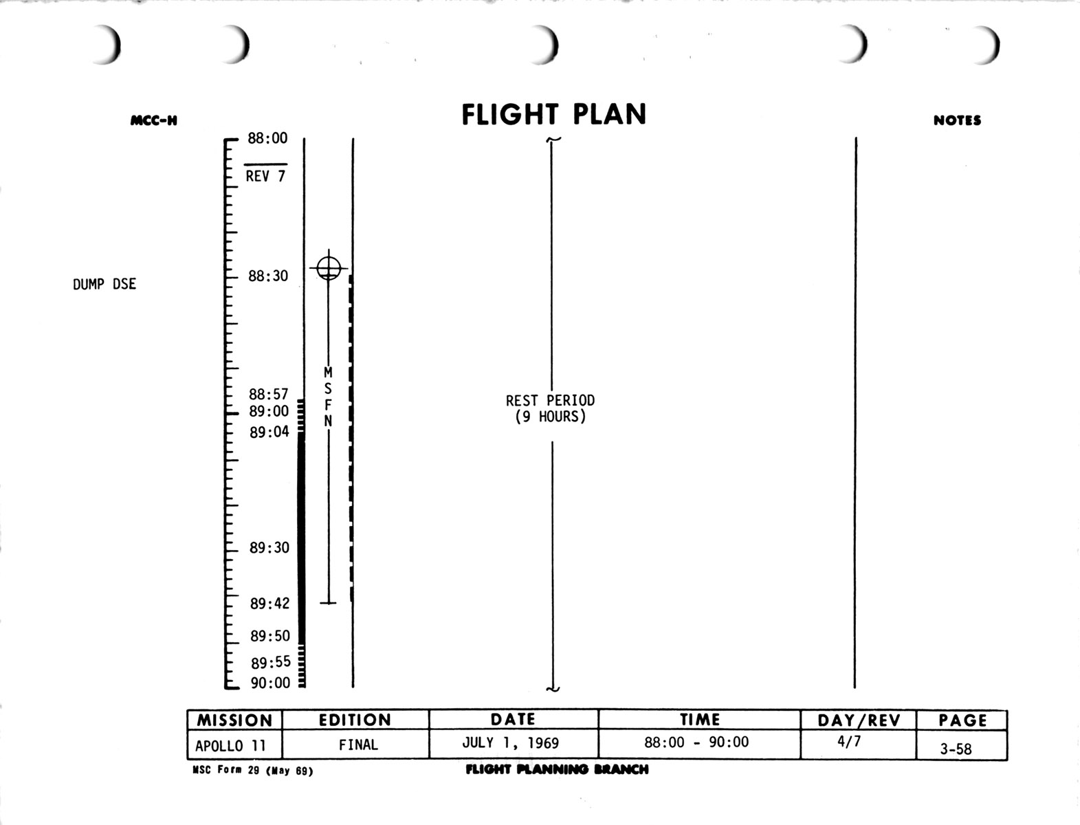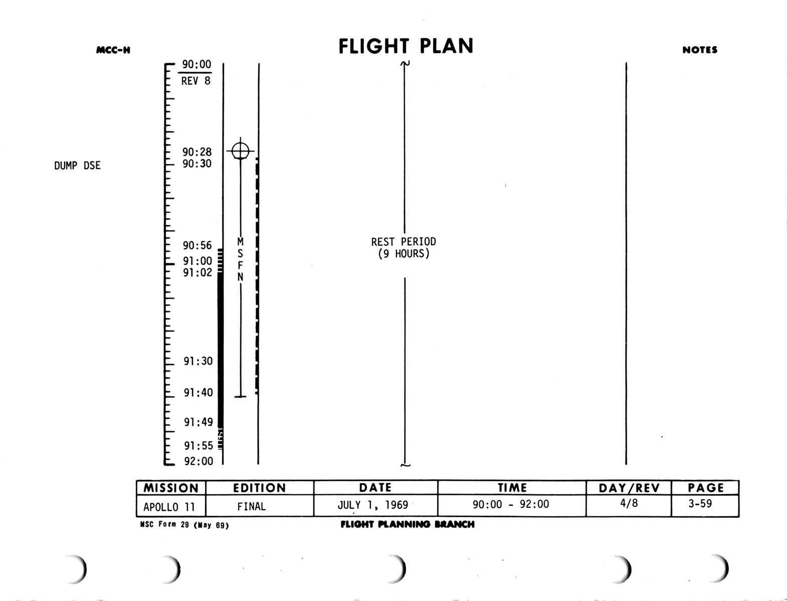 This is Apollo Control. We have had Loss Of Signal from Apollo 11 as it went over the hill. Now tracking through the Madrid station during this series of revolutions. Next acquisition, as Apollo 11 comes back around the east limb of the Moon on the next revolution, will be at 94 hours, 21 minutes Ground Elapsed Time; some 43 minutes from now. And at 93 hours, 36 minutes Ground Elapsed Time; this is Apollo Control.