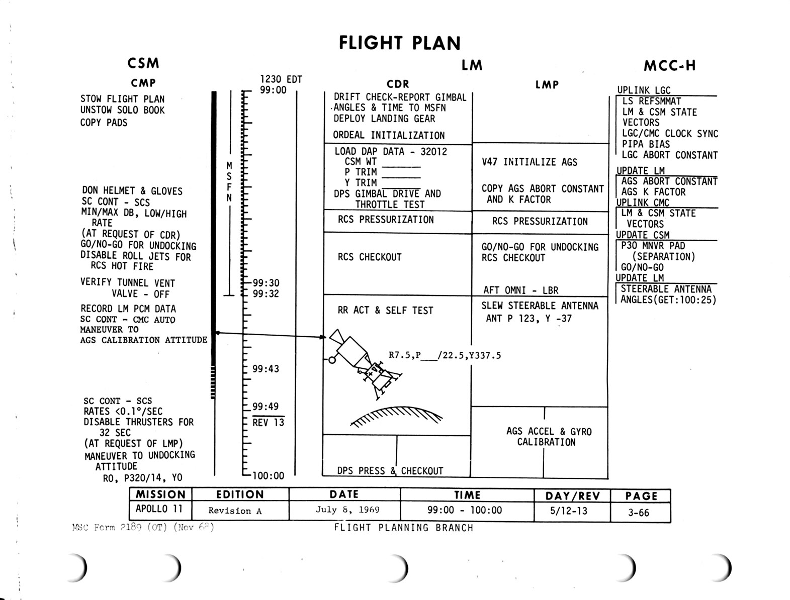 After having breakfast and getting all squared away after the night's rest period, the crew will have a rather busy day today including the first manned landing on the Moon. Some of the preliminary times being generated now for maneuvers of the day will include separation at - a separation burn at 100 hours, 39 minutes, 50 seconds. Here goes the call.