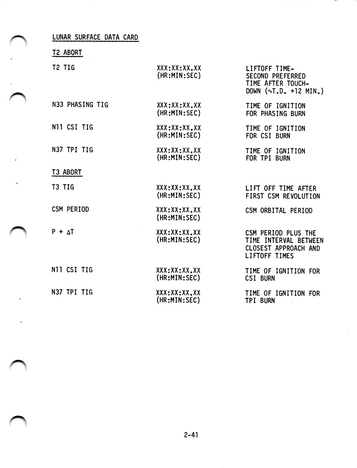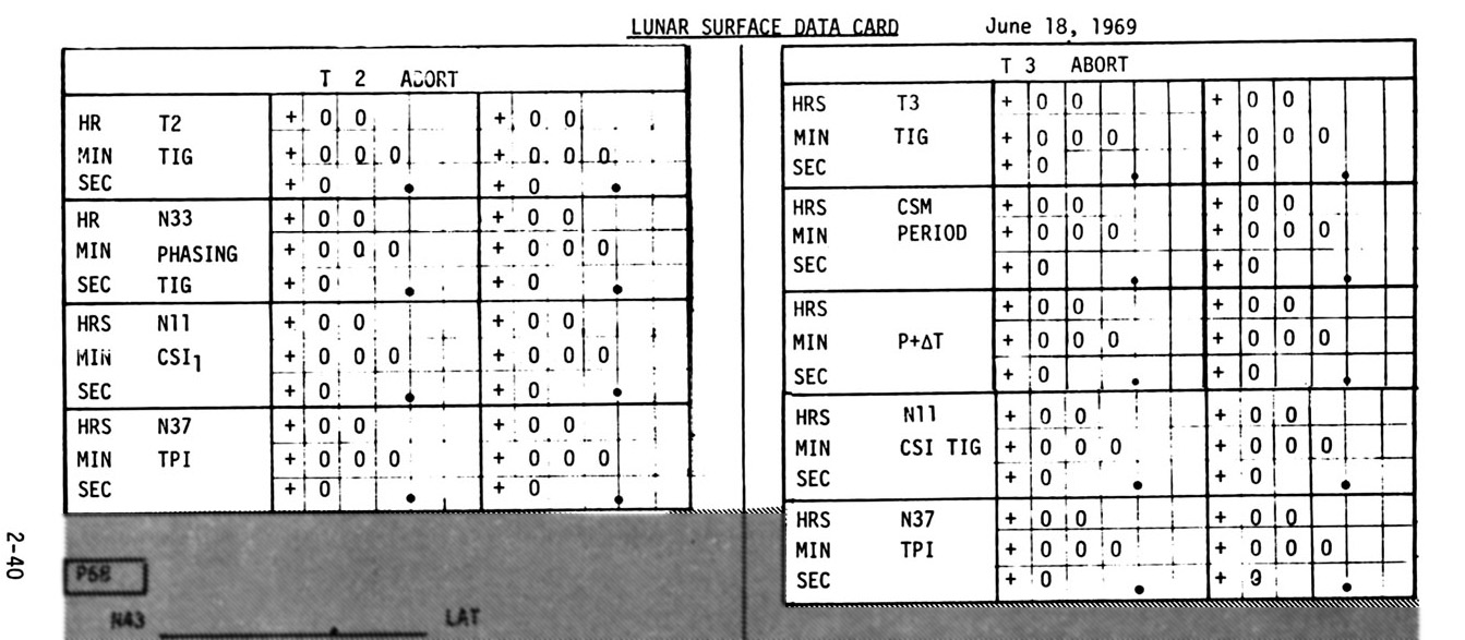 102:11:07 Aldrin (onboard): Okay, get a - get a - Need to compare a TIG time. 09:50. That's right.