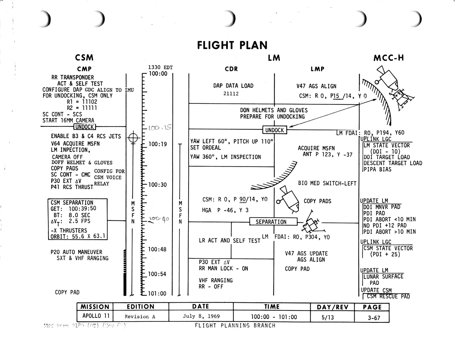 099:42:38 Collins (onboard): So we're about 3 minutes ahead of the printed Flight Plan. It might be wise to try to Sep about 3 minutes early, and we can give them a GET of Sep that's precise, whenever they want it.