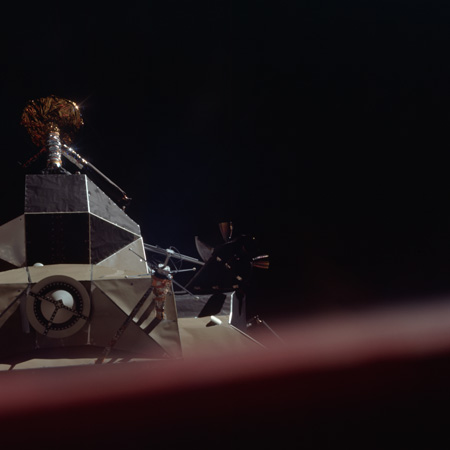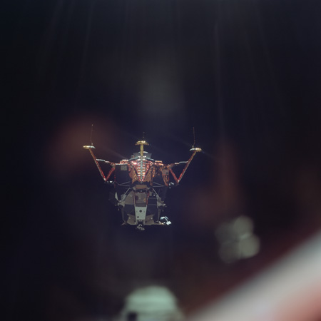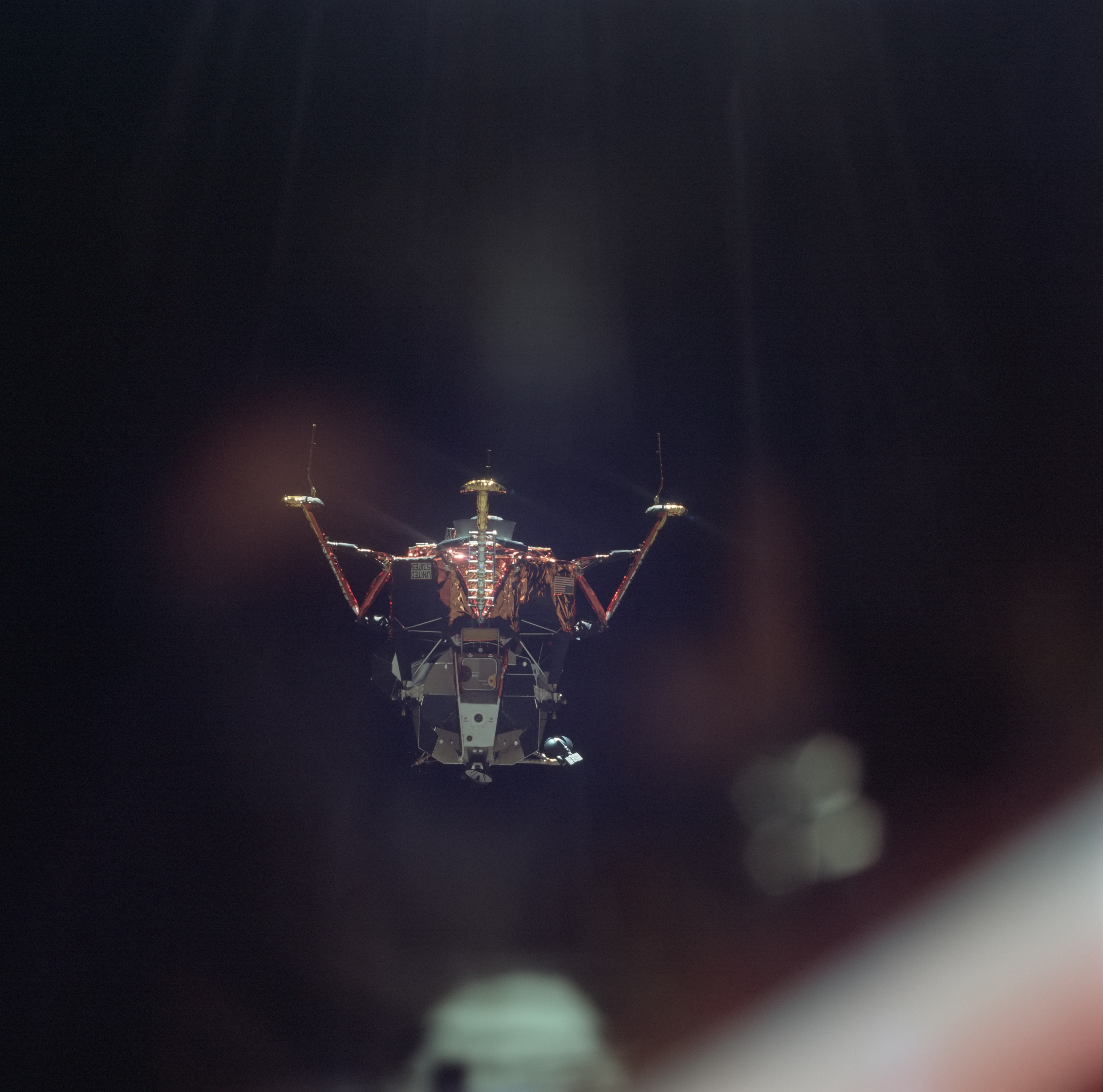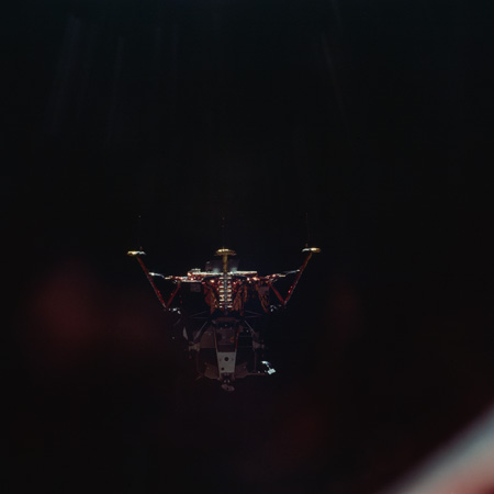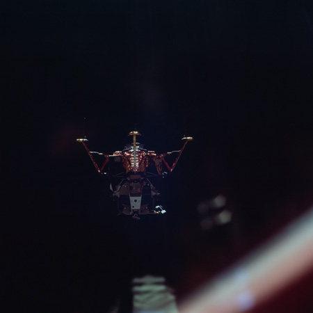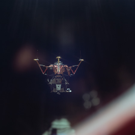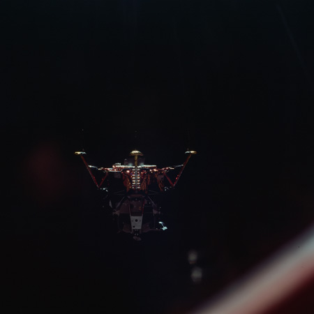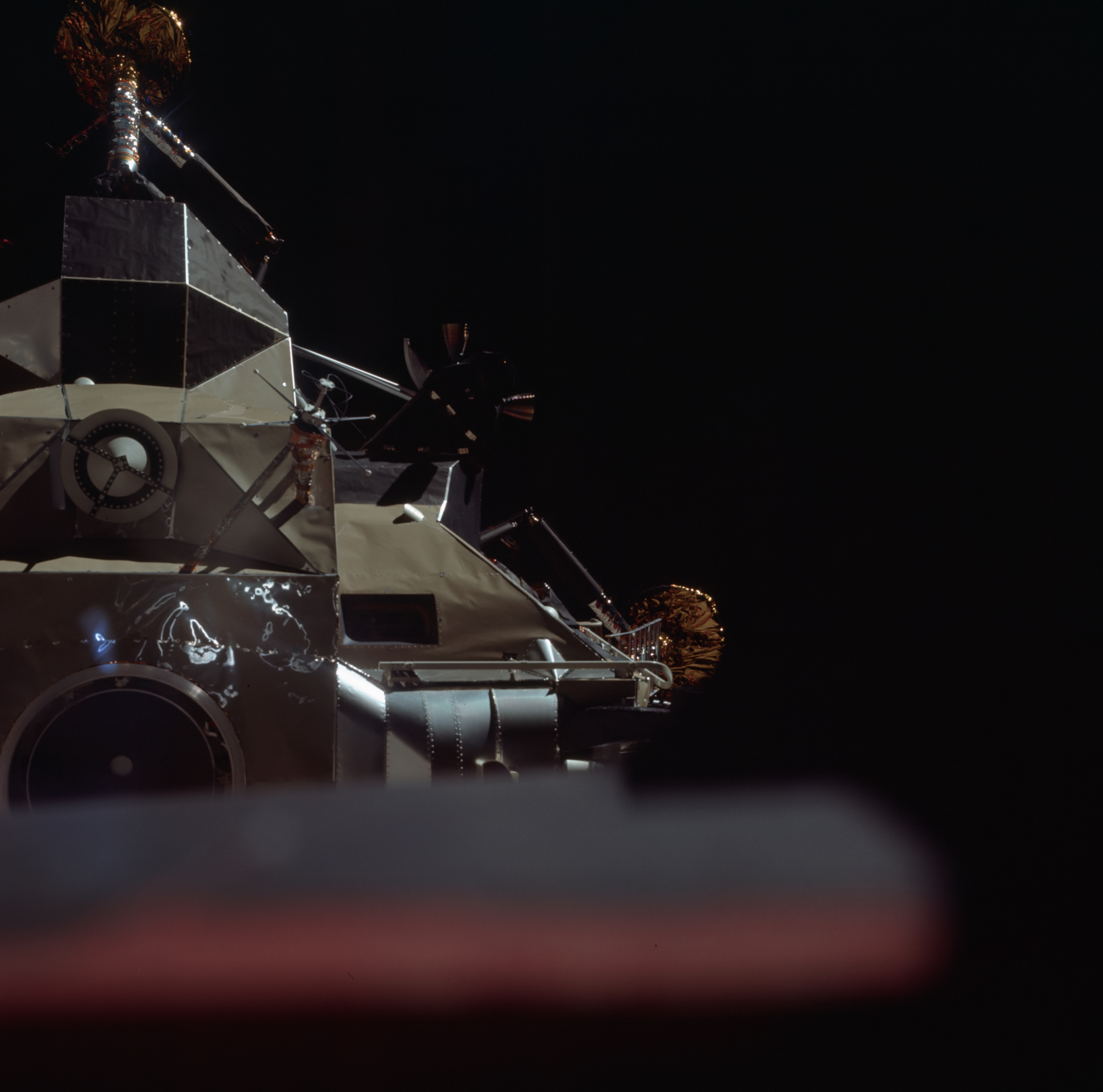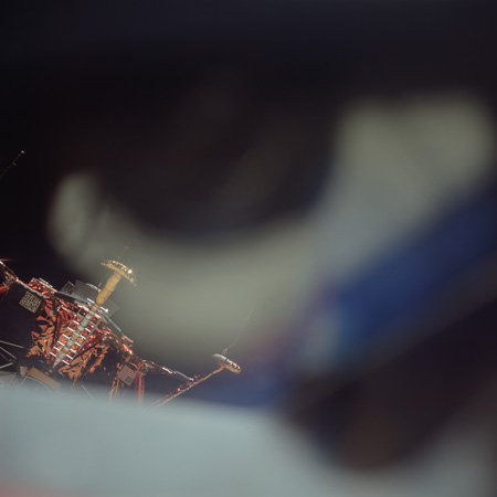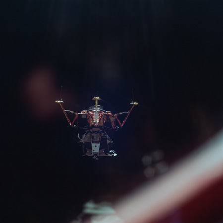 Mike films the undocking using a 16-mm Maurer movie camera. Known by NASA as a Data Acquisition Camera (DAC), its removable magazine, serial 'C', is loaded with Ektachrome-type reversal film. As the LM moves away, Neil rotates the lander to allow Mike to inspect its exterior and in particular, to ensure that the four landing gear are properly deployed.