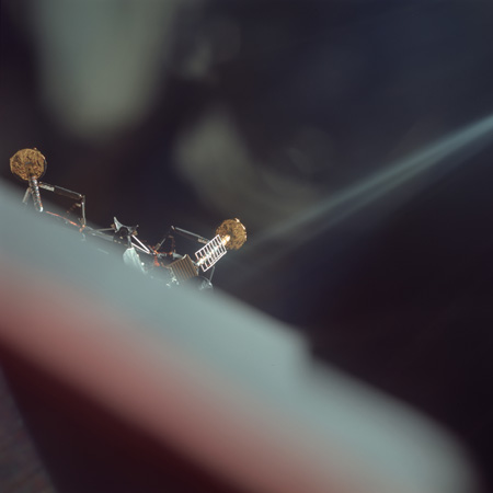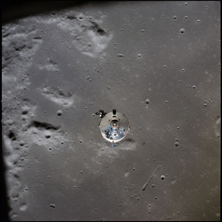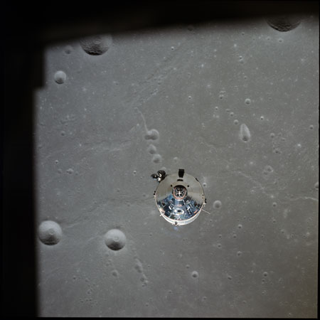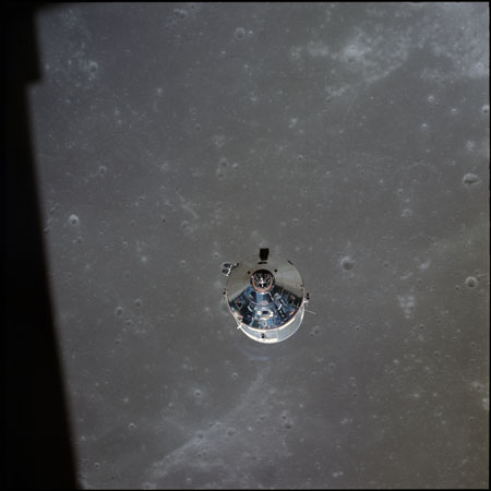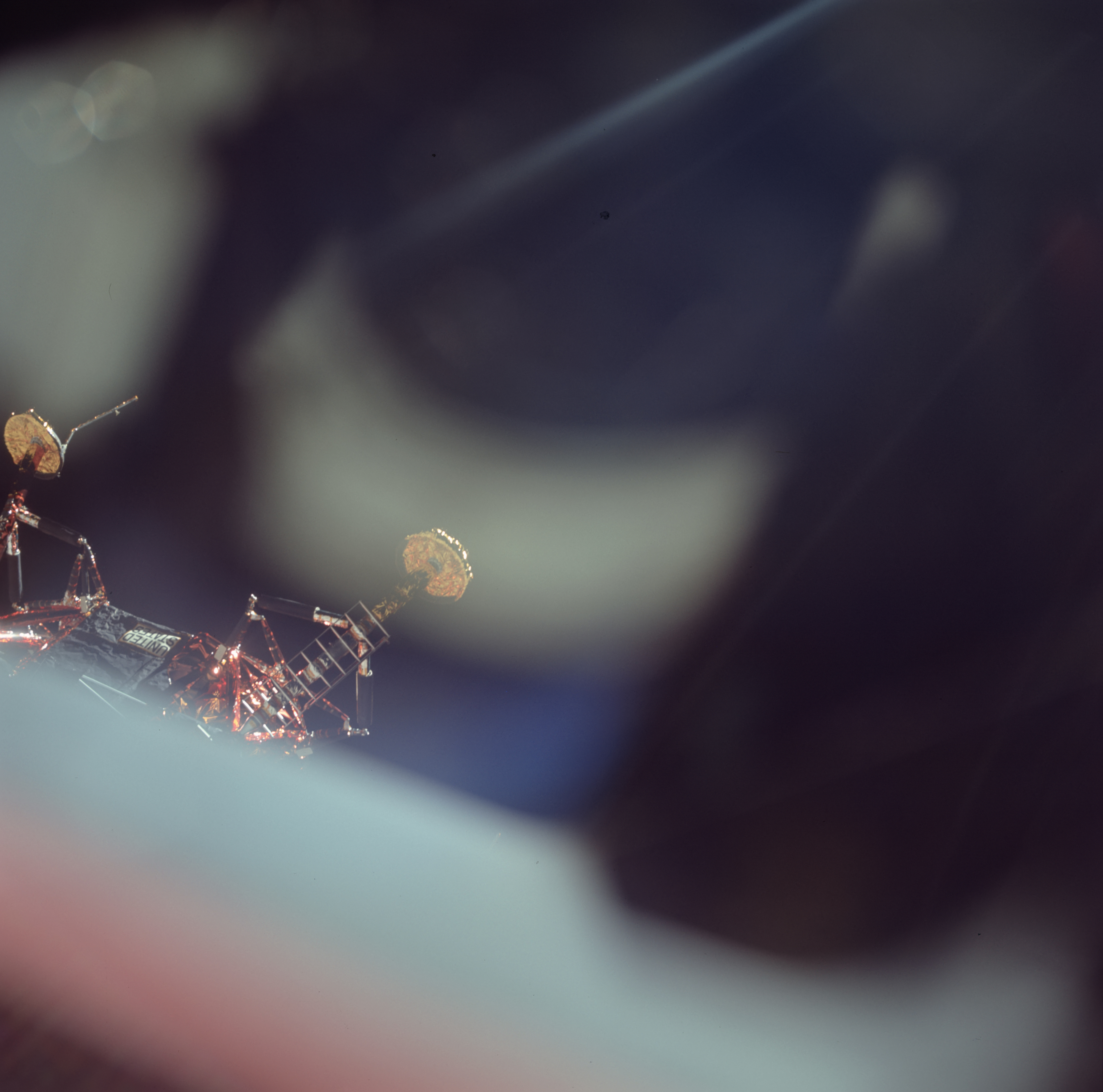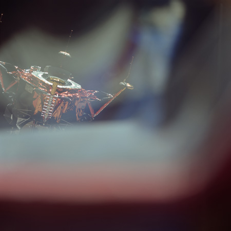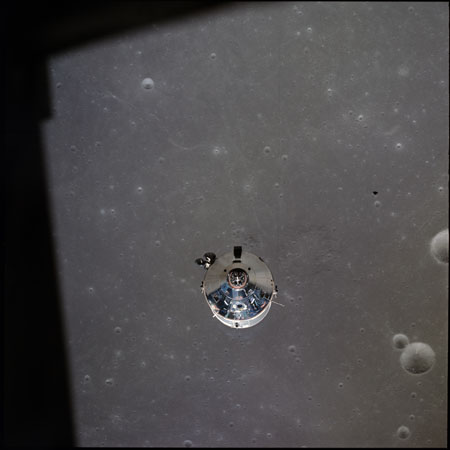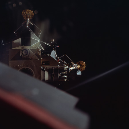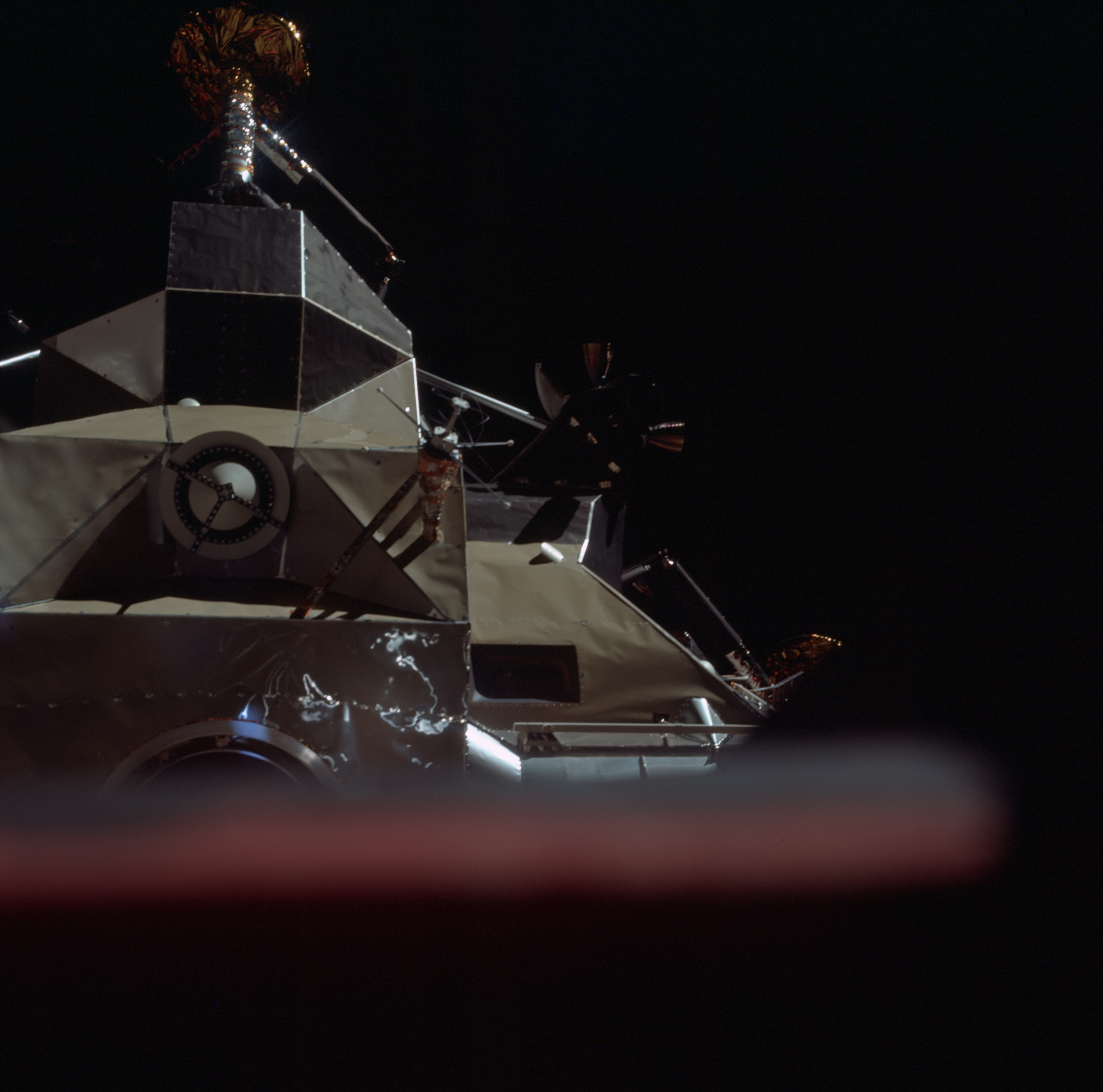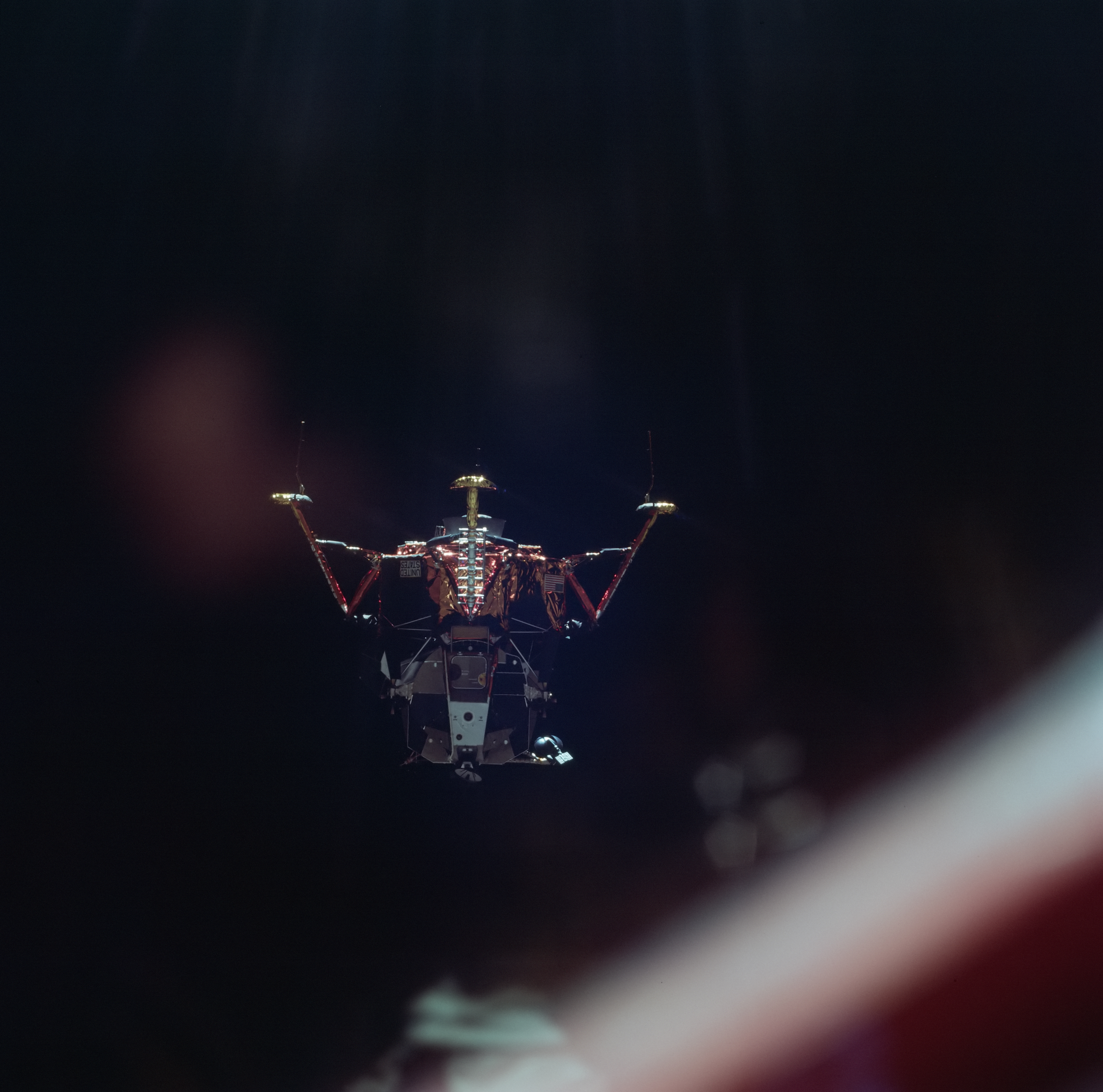Mike films the undocking using a 16-mm Maurer movie camera. Known by NASA as a Data Acquisition Camera (DAC), its removable magazine, serial 'C', is loaded with Ektachrome-type reversal film. As the LM moves away, Neil rotates the lander to allow Mike to inspect its exterior and in particular, to ensure that the four landing gear are properly deployed.