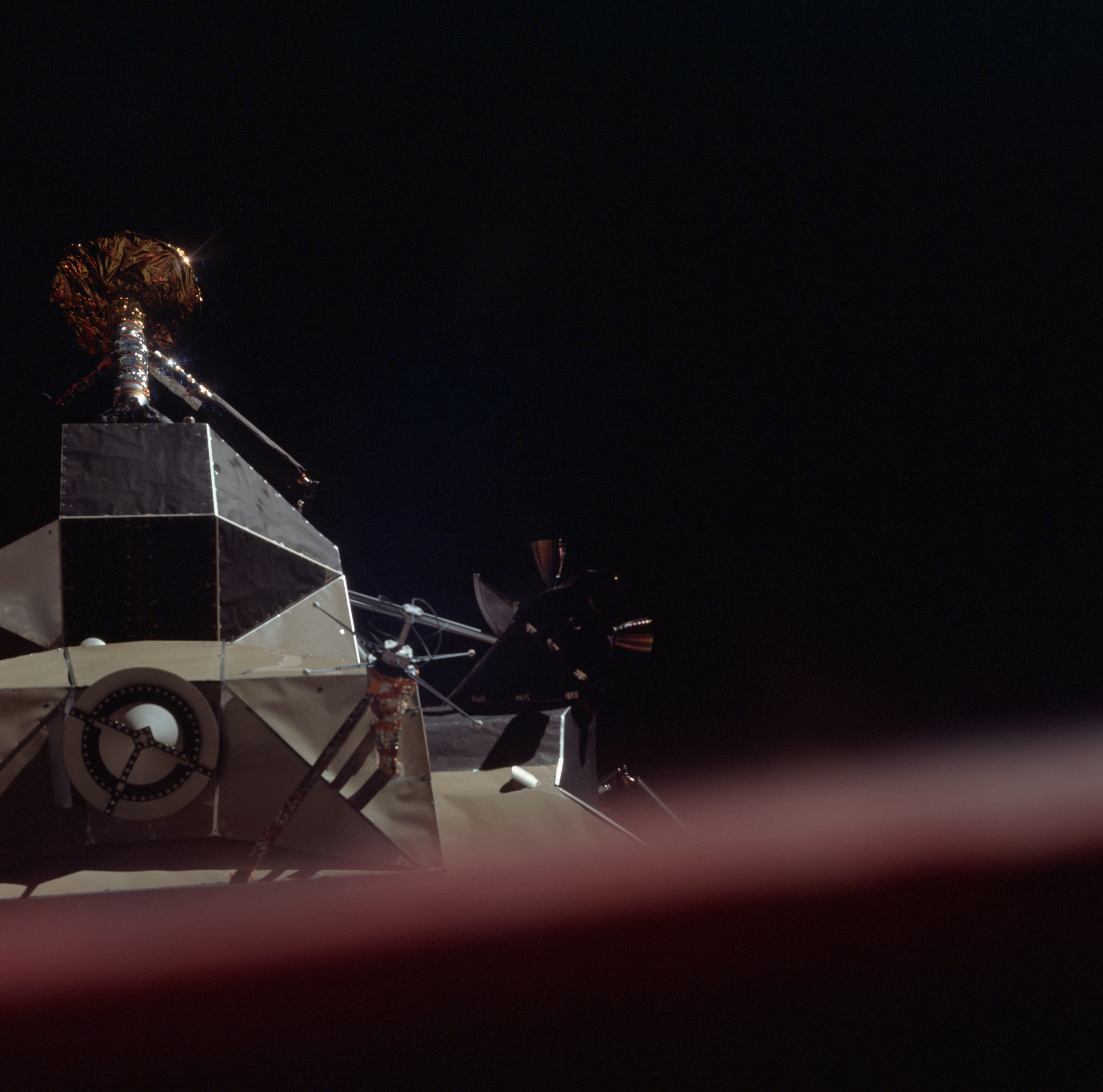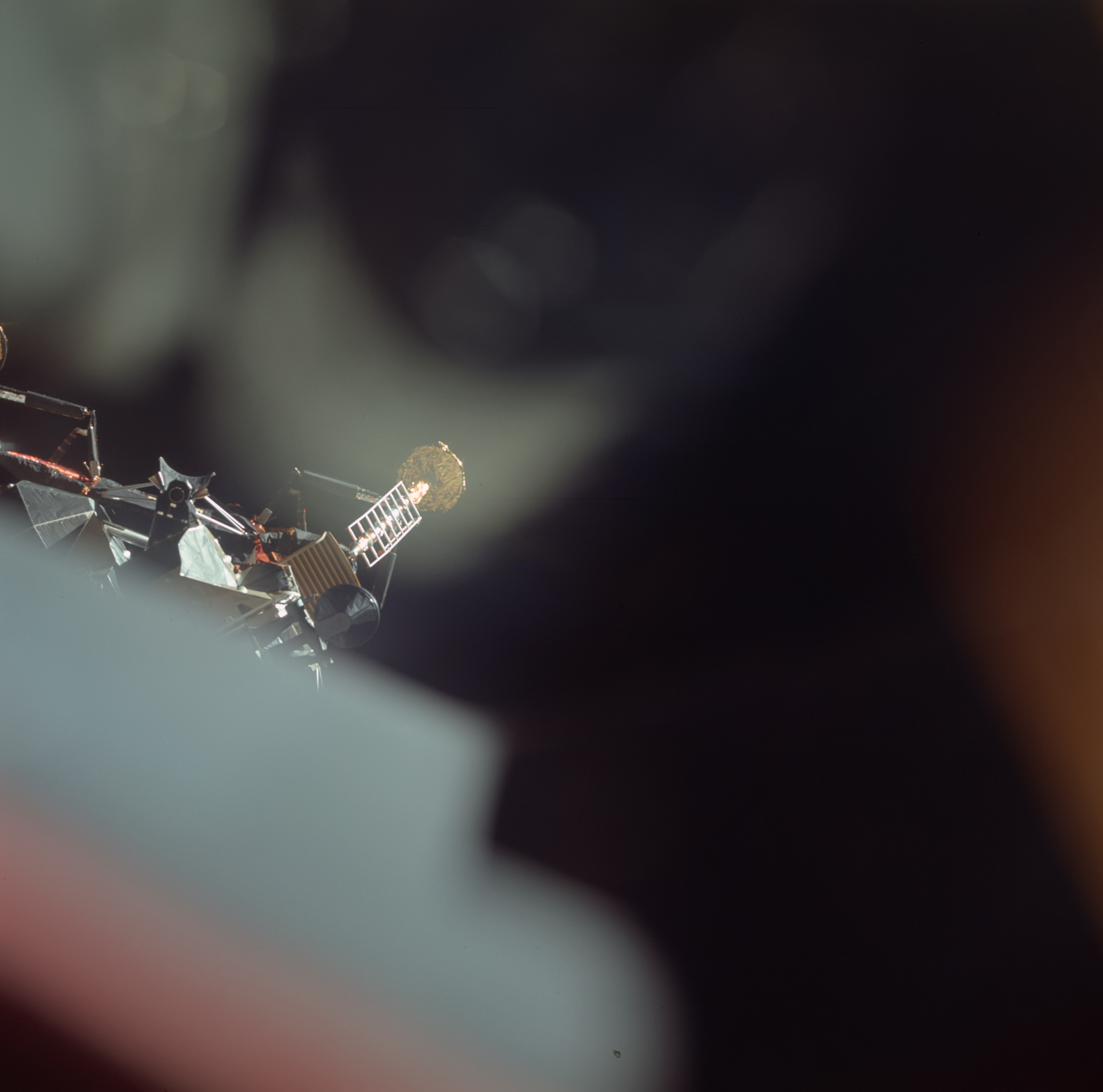 A crop of image AS11-44-6642 taken by Mike Collins as Eagle approaches Columbia. This is Eagle's ascent stage and shows the location of the Rendezvous Radar antenna.