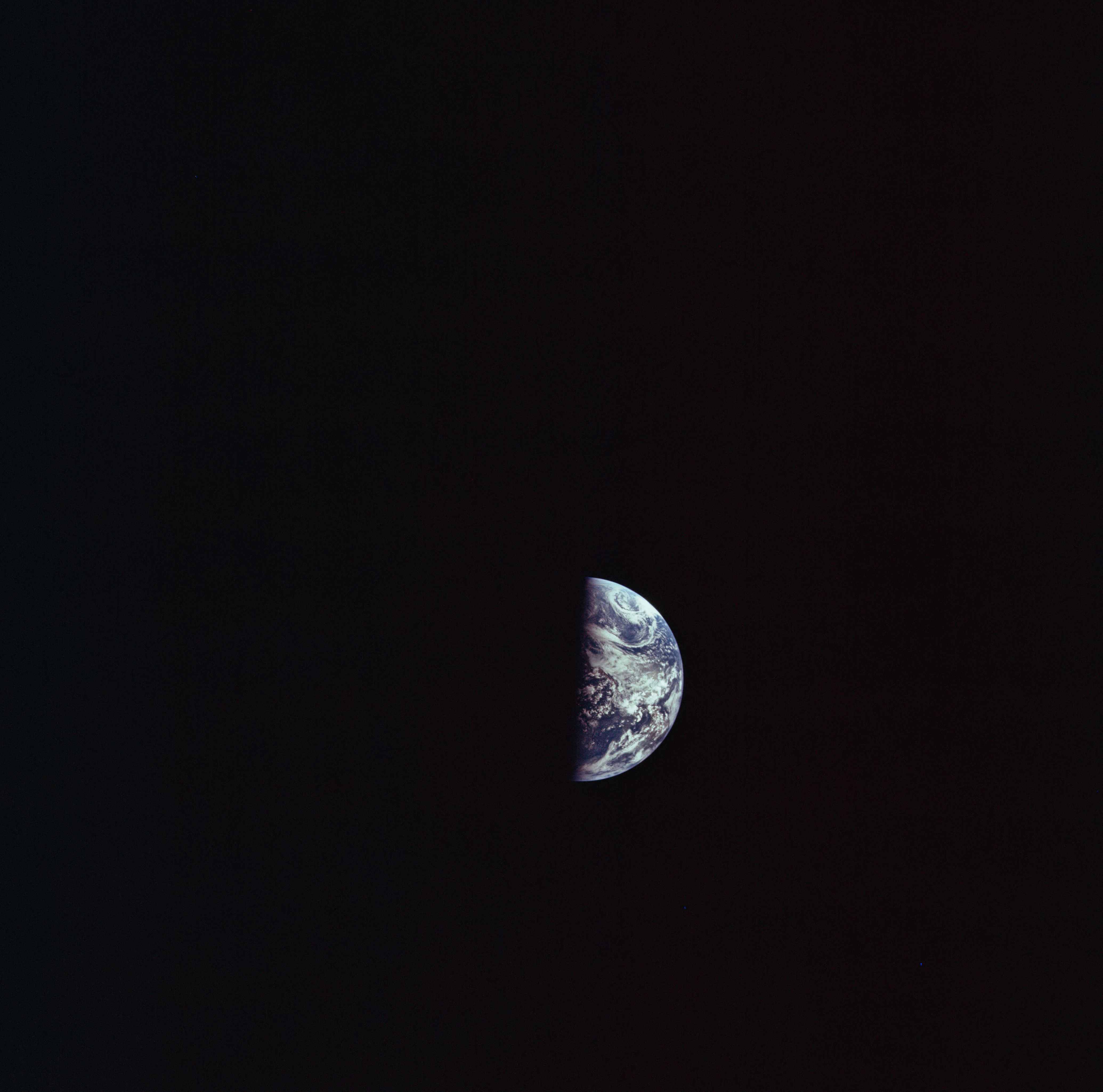 AS11-44-6670 - Earth at about 304,000 km or 164,000 nautical miles. Photograph taken at approximately 152:30:00. South is up and the west coast of South America is passing the terminator. North America is to the bottom right of the globe. 250-mm lens. Image credit: Image Science and Analysis Laboratory, NASA-Johnson Space Center.