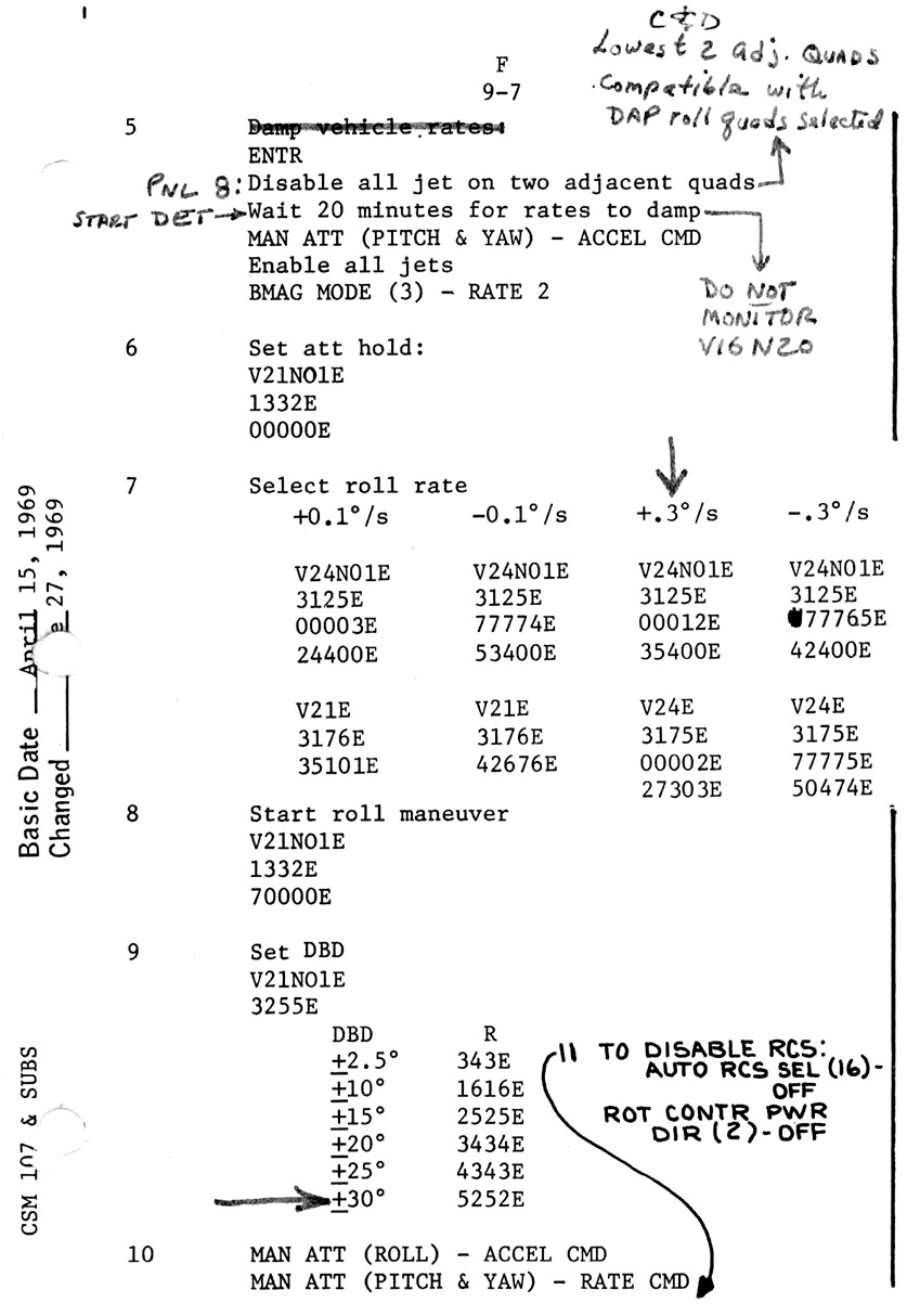 The roll rate of +0.3°/second is arrowed and this is the information that Mike wanted to enter using V24 N01. In this, he entered the appropriate address (3125) then two items of information (00012 and 35400). However, after that, the computer returned to V16 N20 - monitoring the CDUs - and by going to the next stage (V24 Enter) he began entering numbers directly into the CDUs. The unexpected roll rate was a reaction to that erroneous info.