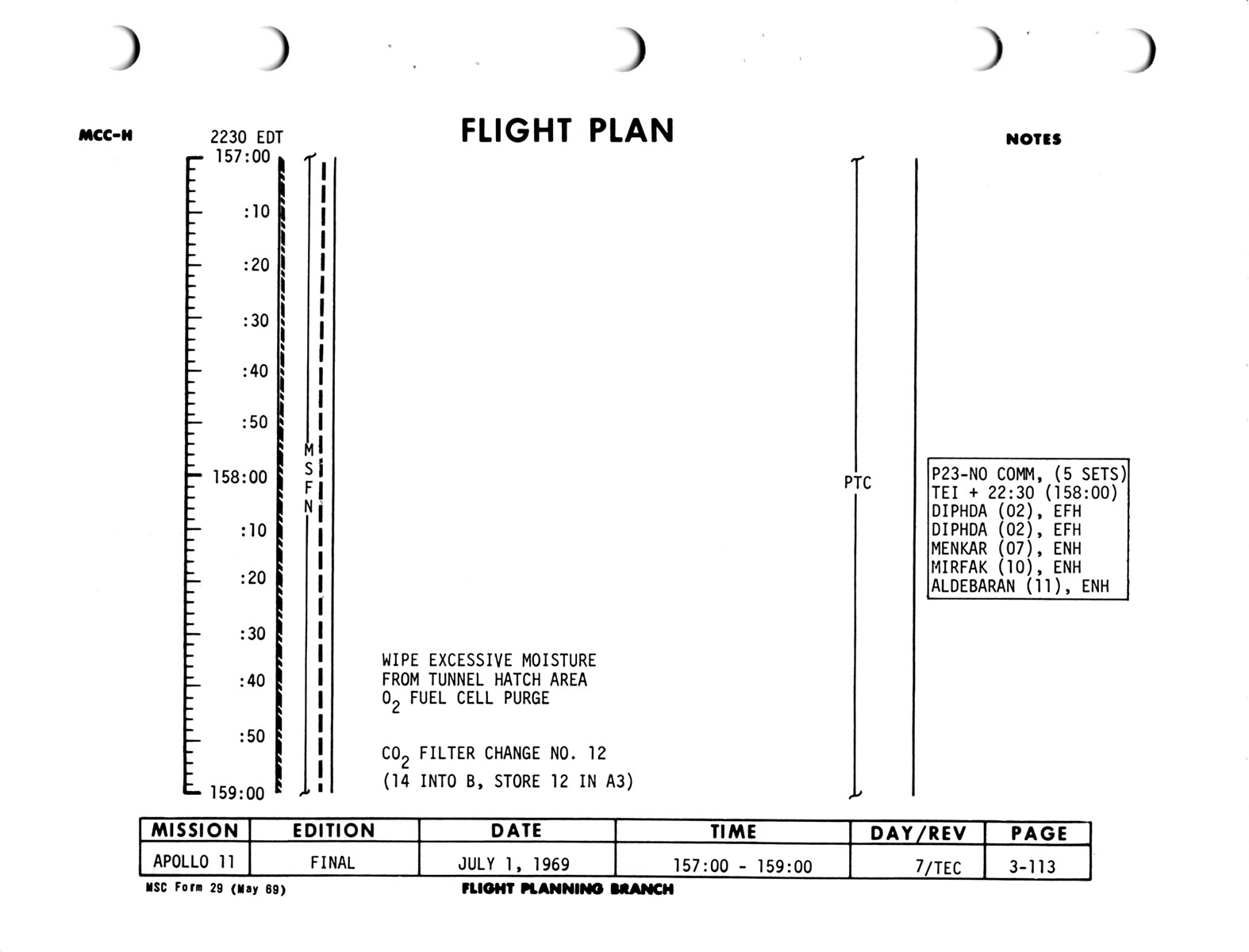159:55:27 Aldrin: Roger. Lunar entry, MPL: 359, 152, 001. 194:46:03; 267, plus 11.02, minus 172.03, 068. 36194, 6.56, 1189.4, 36275, 195:03:03; 00:27. Four NA. 4.00 02:09. 00:17, 03:38, 08:20. 02, 094.5, 14.9. Scorpii Theta. Up 315, right 35, up. Assumes no MCC-6. Horizon at EI minus 30, 194:33:03, and pitch 298. Set stars Deneb and Vega; 079, 234, 340. Over.