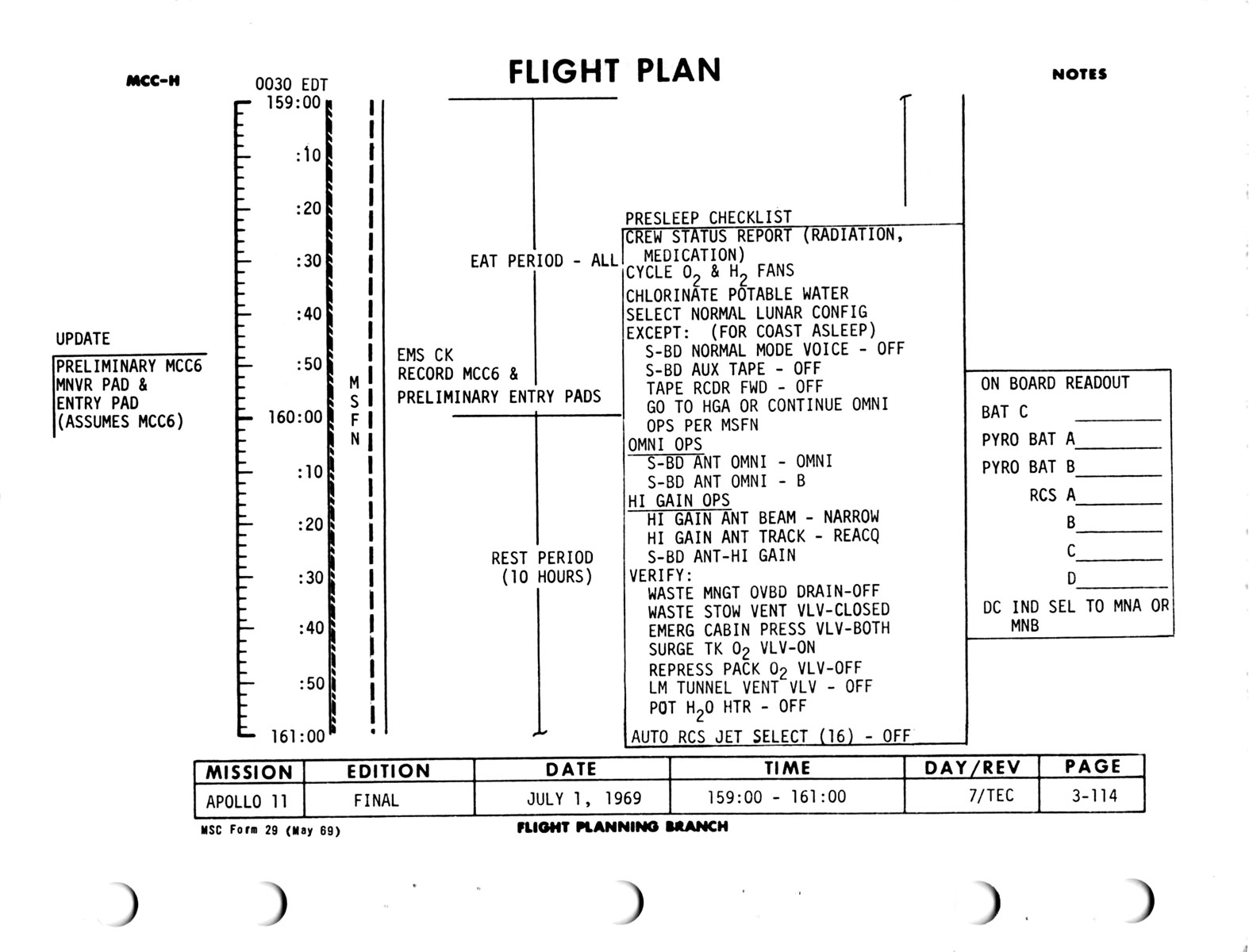 This is Apollo Control; 159 hours, 49 minutes Ground Elapsed Time. Apollo 11 crew is giving their final report prior to their starting their 10-hour rest period. We've got a little accumulation of tape, then we'll join live. Let's roll the tape now.