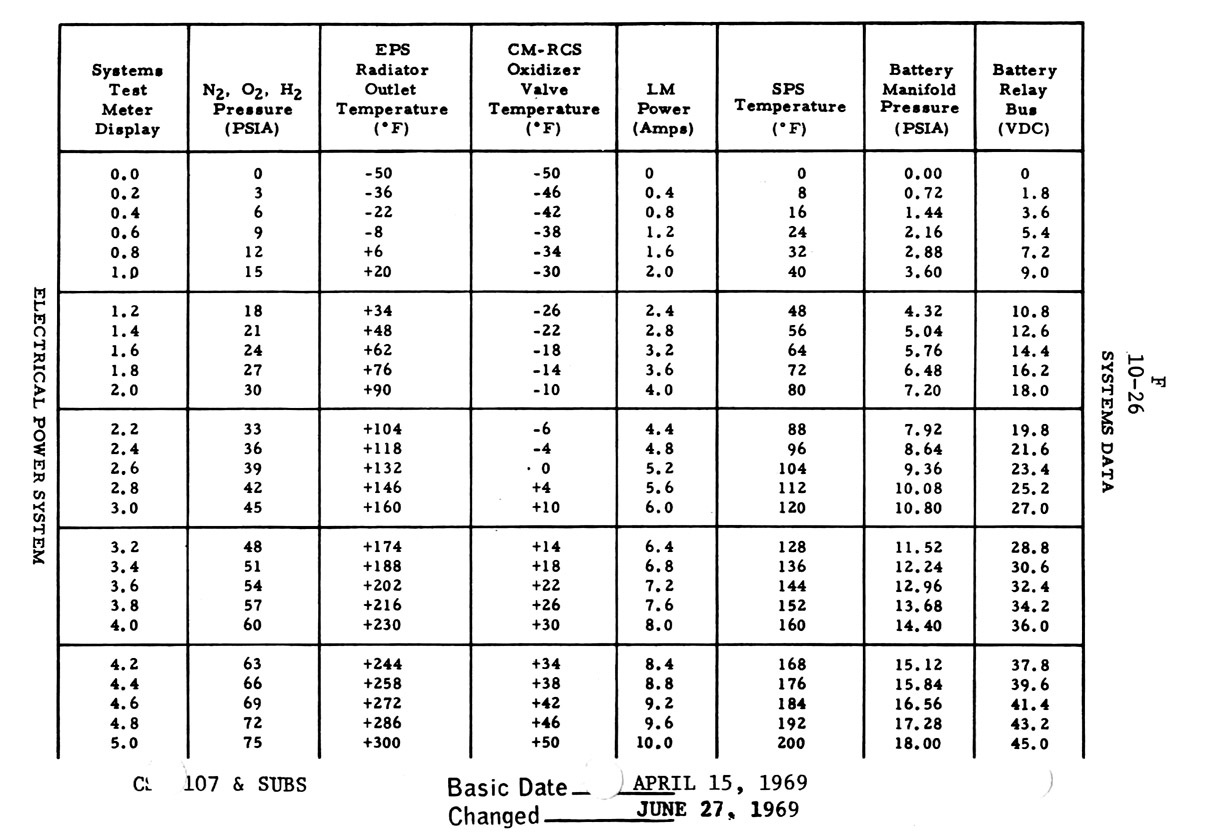 171:26:49 Collins: Okay. 2-4 is reading 4.7 volts, 2-5 is reading 4.8 volts, 1-2 is reading 4.8 volts, 1-4 is reading 4.8. 1-6, 4.5; and 2-1, 4.8. Over.