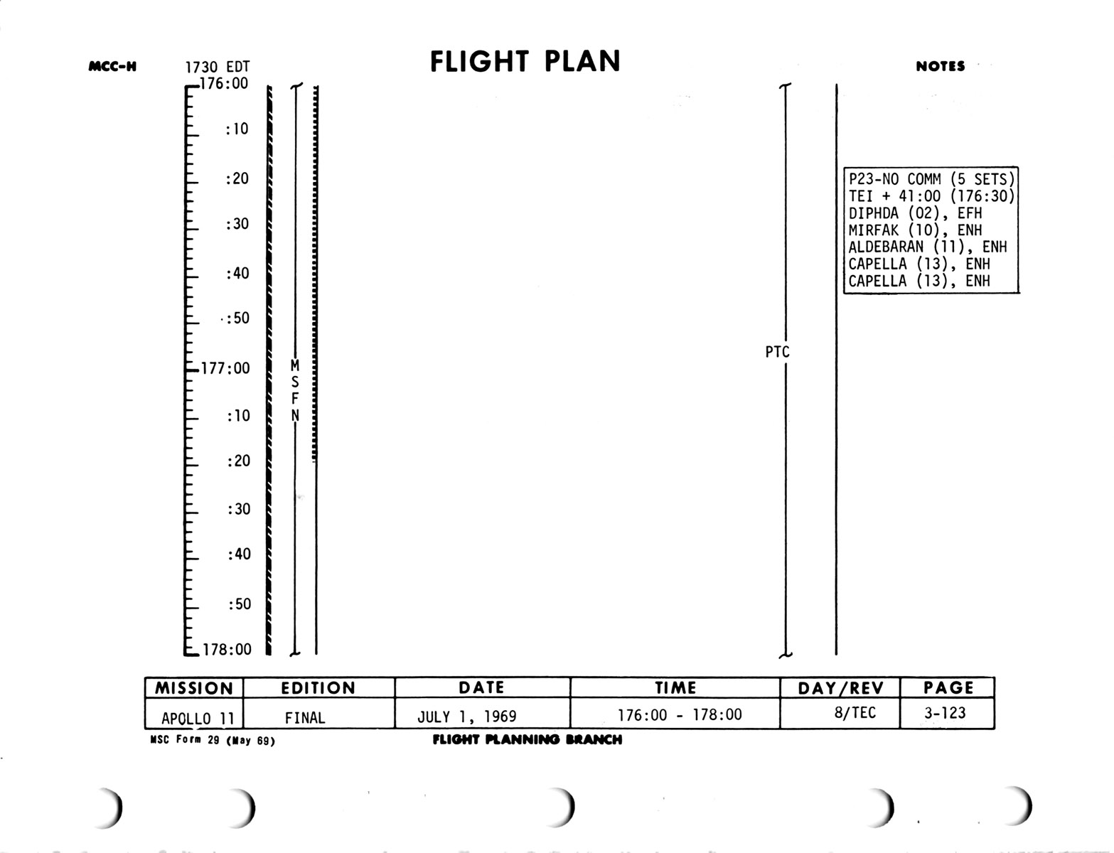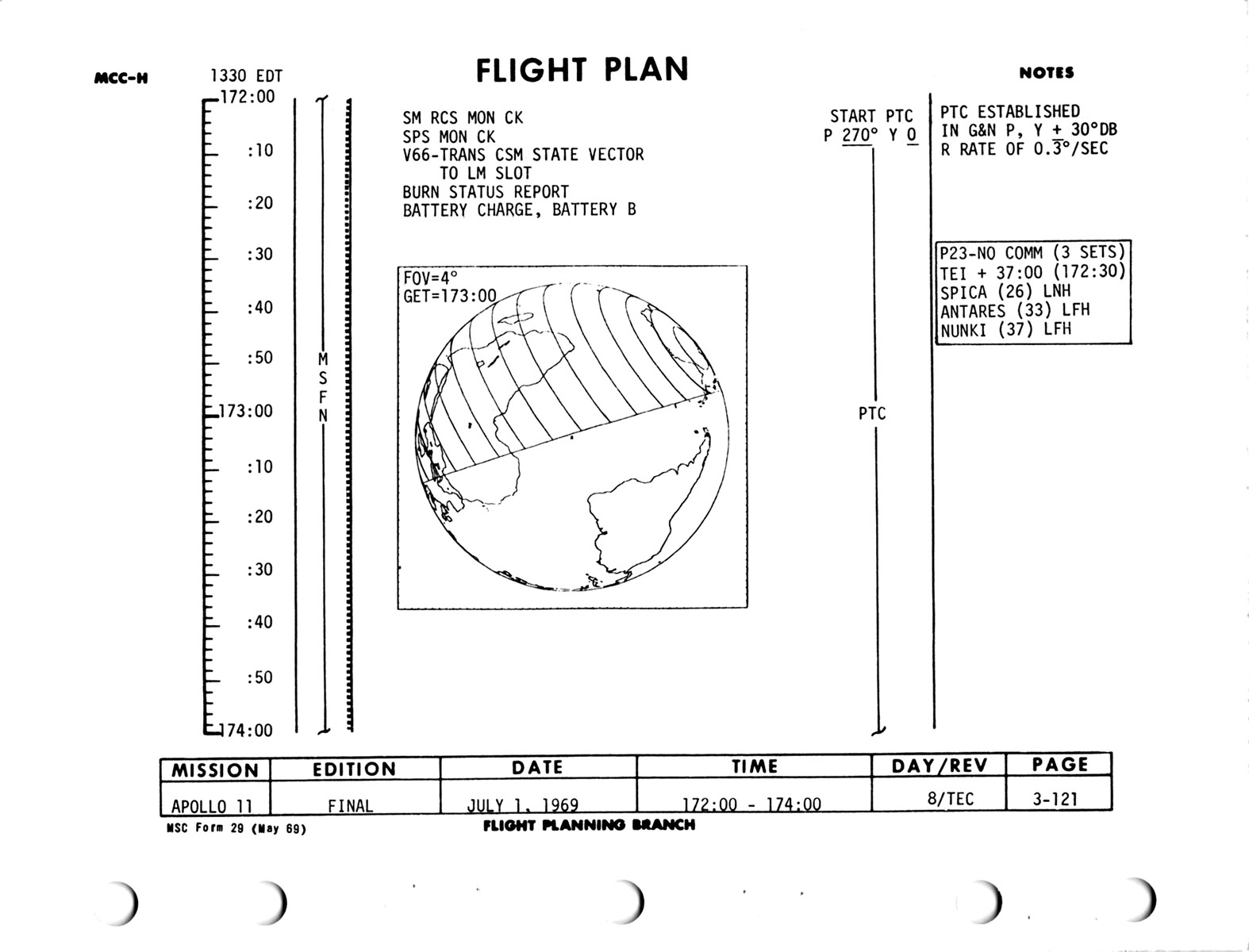171:09:57 Aldrin: Roger. MidPac Entry PAD: 359, 153, 001; 194:46:03, 267; plus 11.02, minus 172.03; 06.7; 36194, 6.55; 1187.5, 36275; 195:03:03; 00:28. DL and VL NA. 4.00, 02:10; 00:18, 03:38, 08:21. 44, 293.2, 38.0. Scorpii Delta [corrects himself] Scorpii Theta, up 31.4, right 3.4; up. No midcourse correction. Horizon, EI minus 30, 194:33:03. Pitch 297. Deneb and Vega. 078, 233, 340. Over.