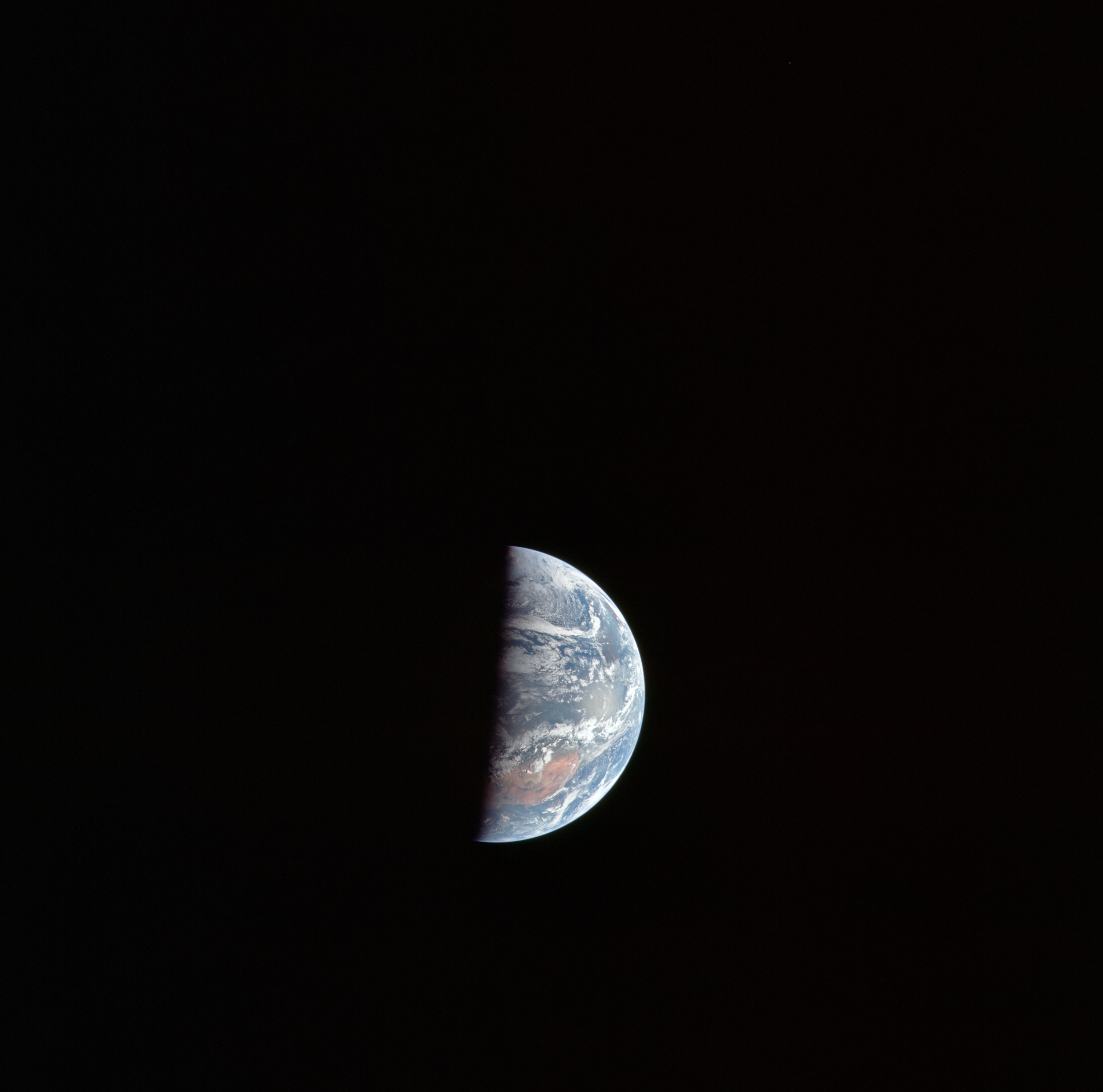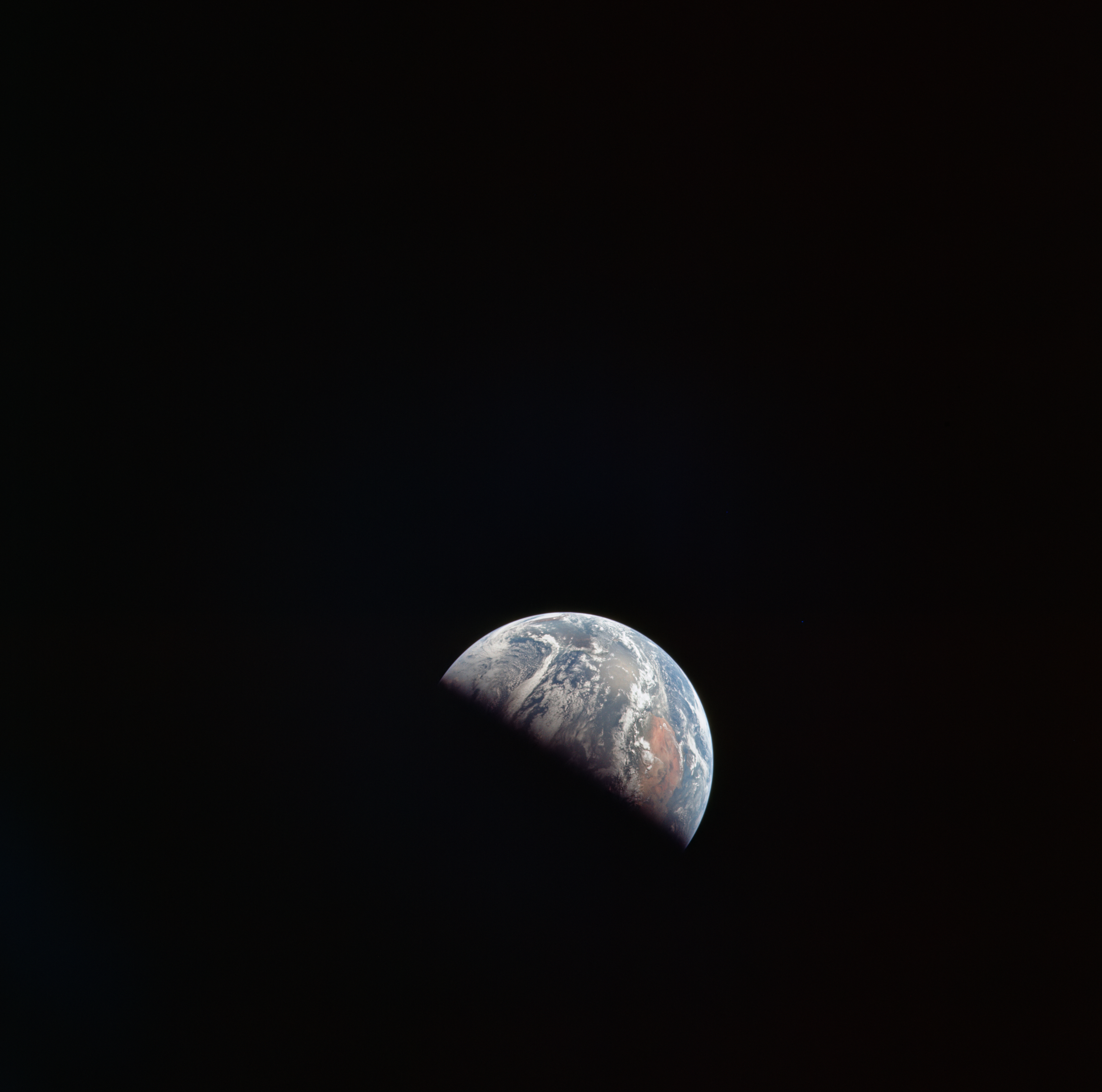 AS11-44-6672 - Earth at about 207,000 km or 112,000 nautical miles. Photograph taken at approximately 171:20:00. North is to the lower right. The ochre tones of the Sahara desert are clearly seen with the Atlantic Ocean dominating the view. 250-mm lens. Image credit: Image Science and Analysis Laboratory, NASA-Johnson Space Center.