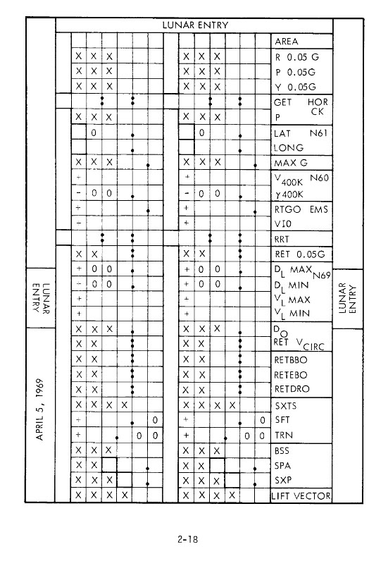 There are additional comments to the PAD. The data given here are only relevant if no further midcourse corrections are made. At 194:33:03, 30 minutes before reaching Entry Interface, a crude check is made of the spacecraft's attitude by viewing Earth's horizon and seeing where it lines up with graduations in the rendezvous window, assuming the IMU platform is aligned per the entry REFSMMAT. If the check is out by more than ±5°, the crew would treat the IMU as suspect. Instead they would use the BMAGs and the GDCs to be the attitude reference.