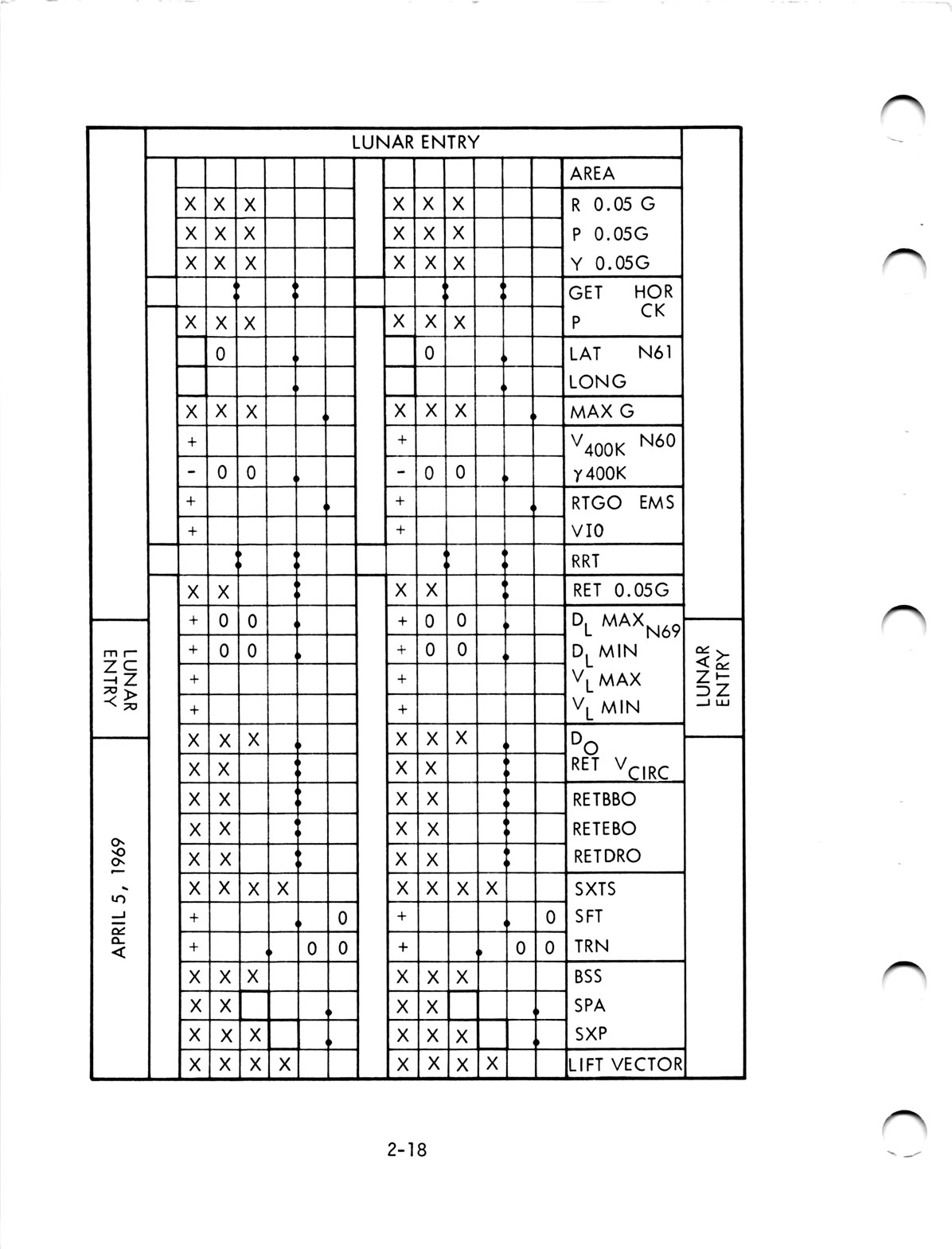 191:43:57 Evans: Roger. Entry PAD: area is the mid-Pacific; roll 000, 152, 001; GET 194:46:06, 267; latitude, plus 13.32, minus 169.17; 06.4; 36194, 6.49; range to go, 1404.5, 36275; 195:03:06, 00:28, DL max, 1.54, 0.84, 22400, 18000; D0 4.00, 02:13; 00:17, 03:51, 09:02; sextant star, 45, 018.9, 27.7; boresight star, none available; lift vector, Up. Comments: GDC align, Vega and Deneb, roll 078, pitch 223 [means 233 - corrects later], yaw 340. Additional comments: Use non-exit EMS pattern; EI minus 30 horizon check, GET 194:33:06; pitch 298. You'll get P65, but no P66. Additional note: Initial bank angle in P67 may not be full lift. Apollo 11, Houston. Read back. [Long pause.]