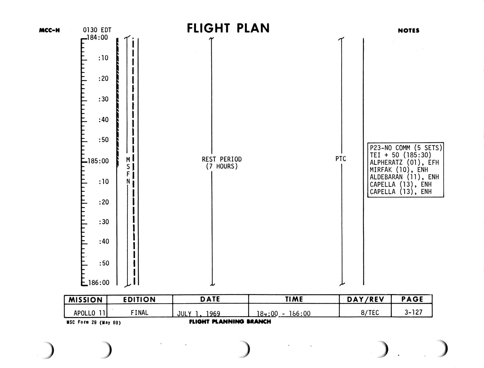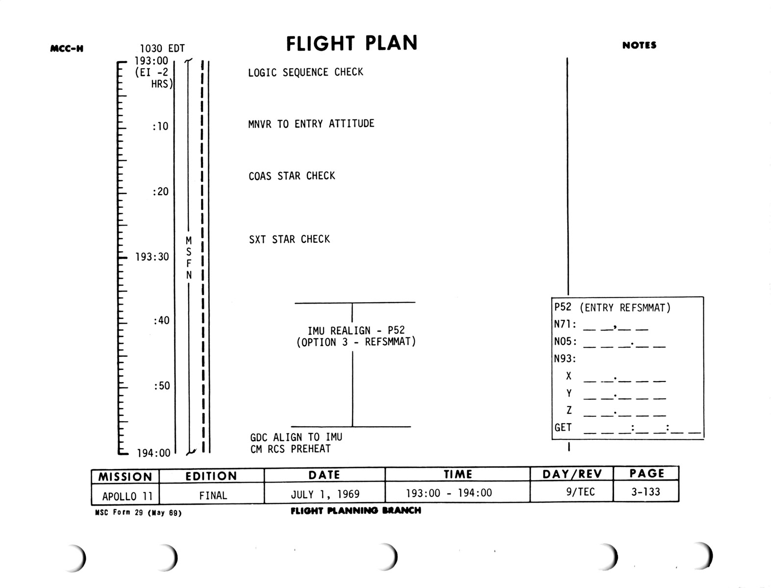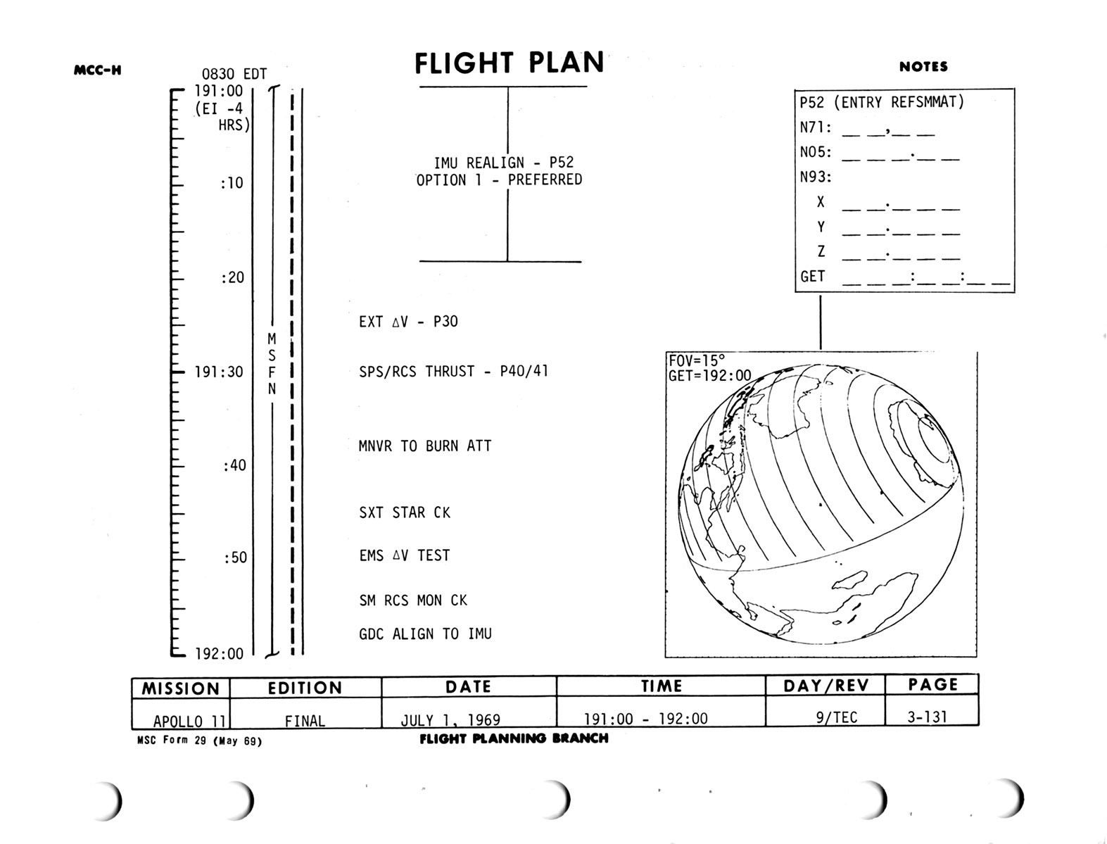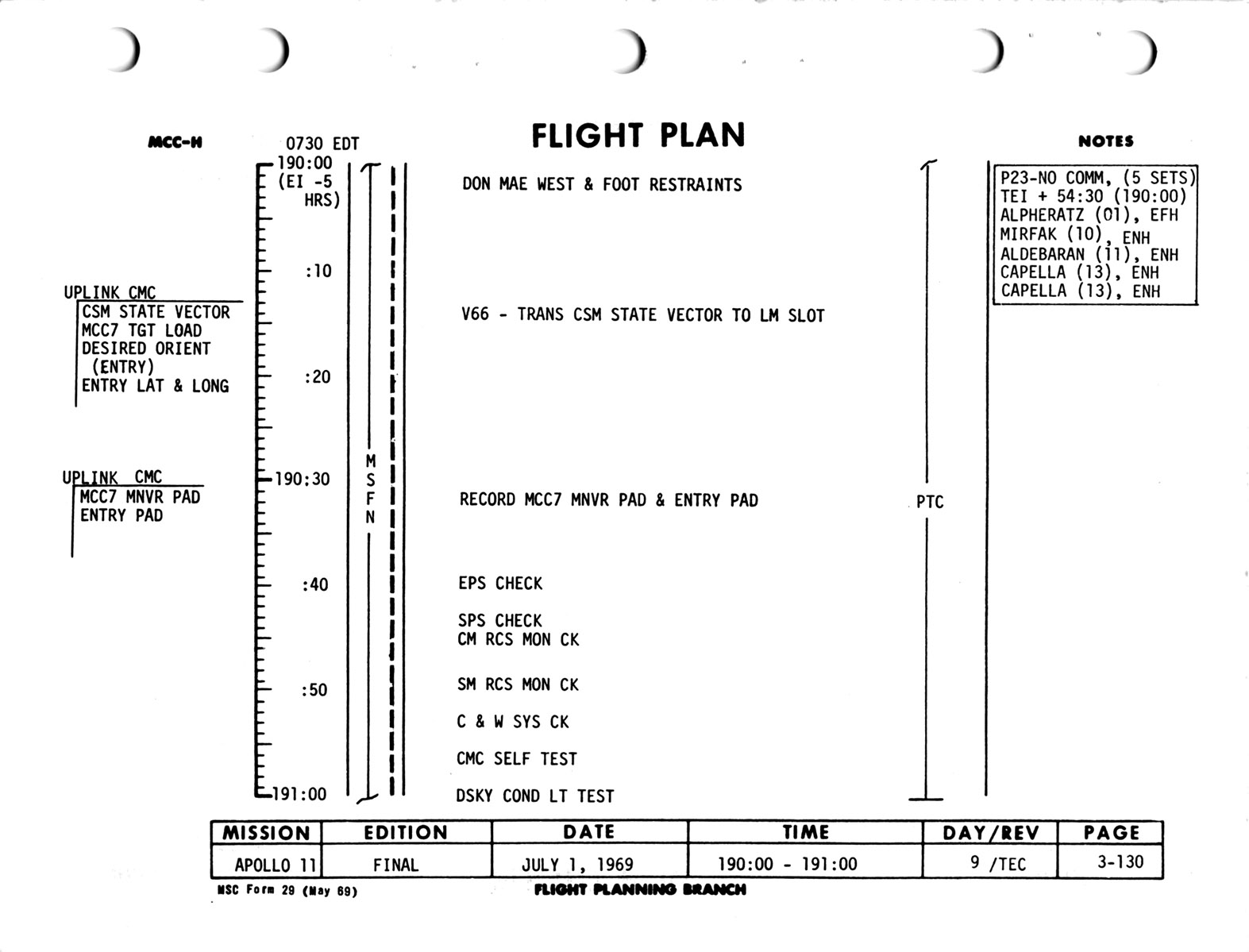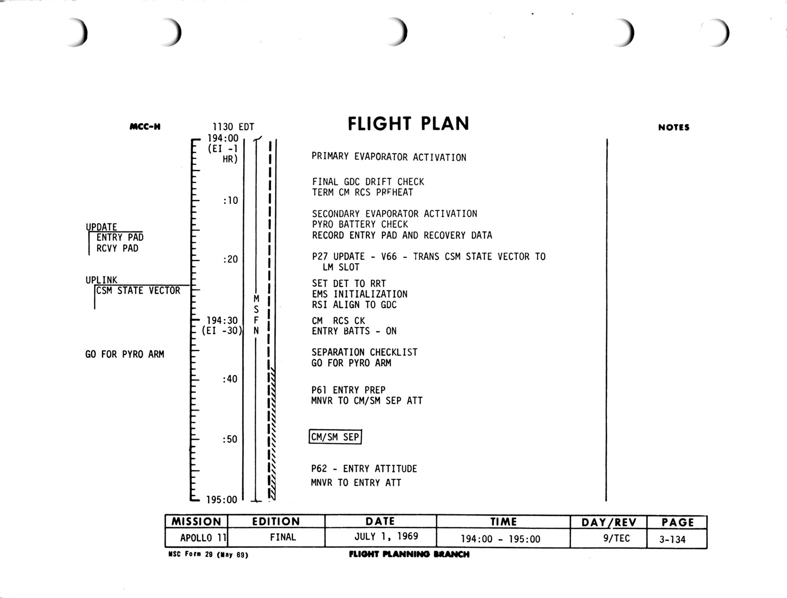 190:45:13 Evans: Apollo 11, Houston. Request P00 and Accept, and we'll send you a REFSMMAT, state vector, and entry target load. Over.