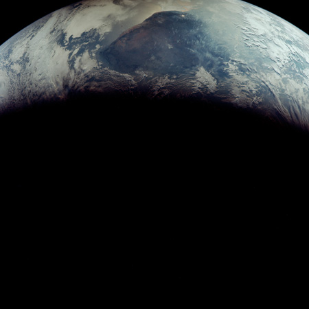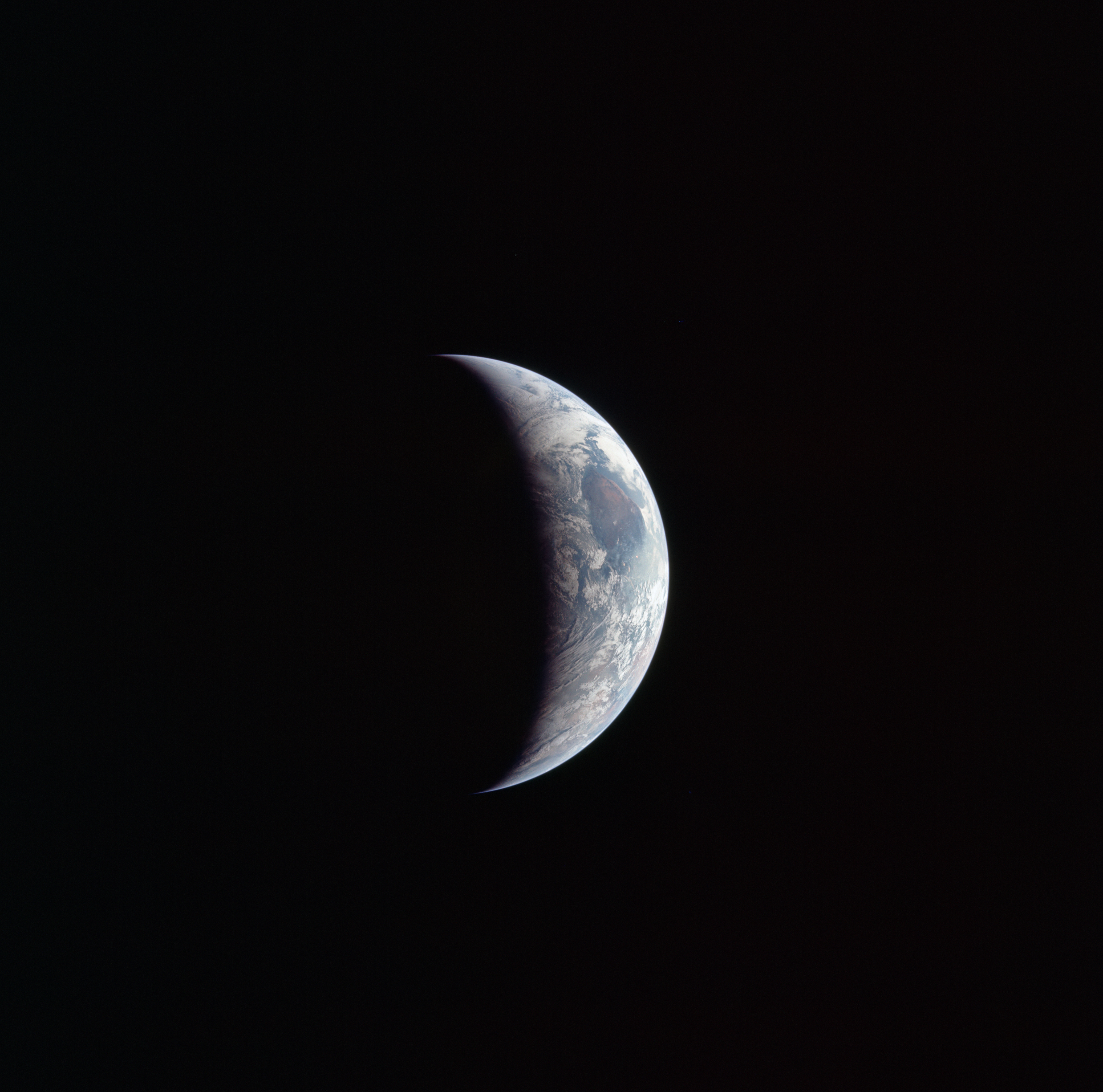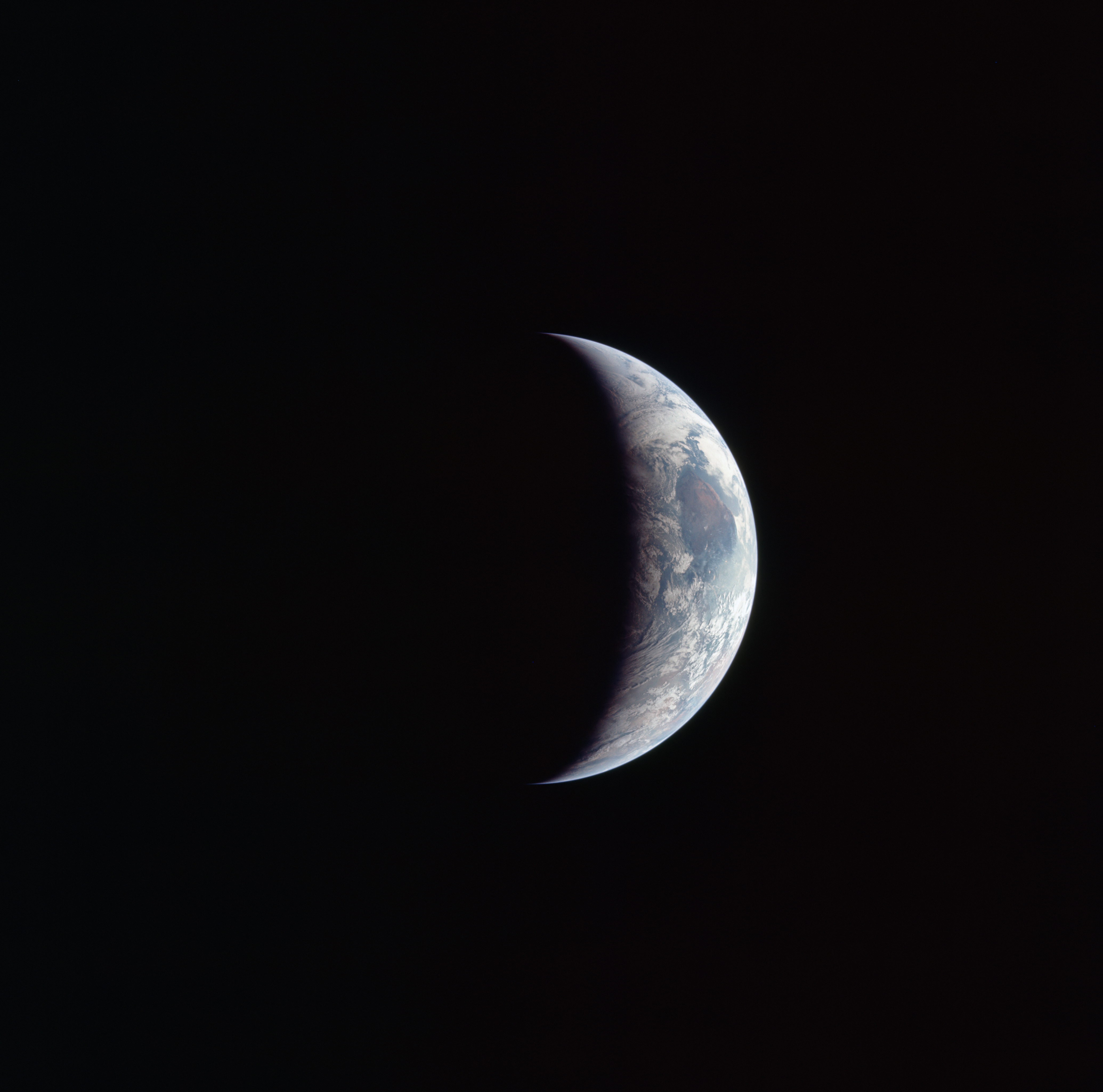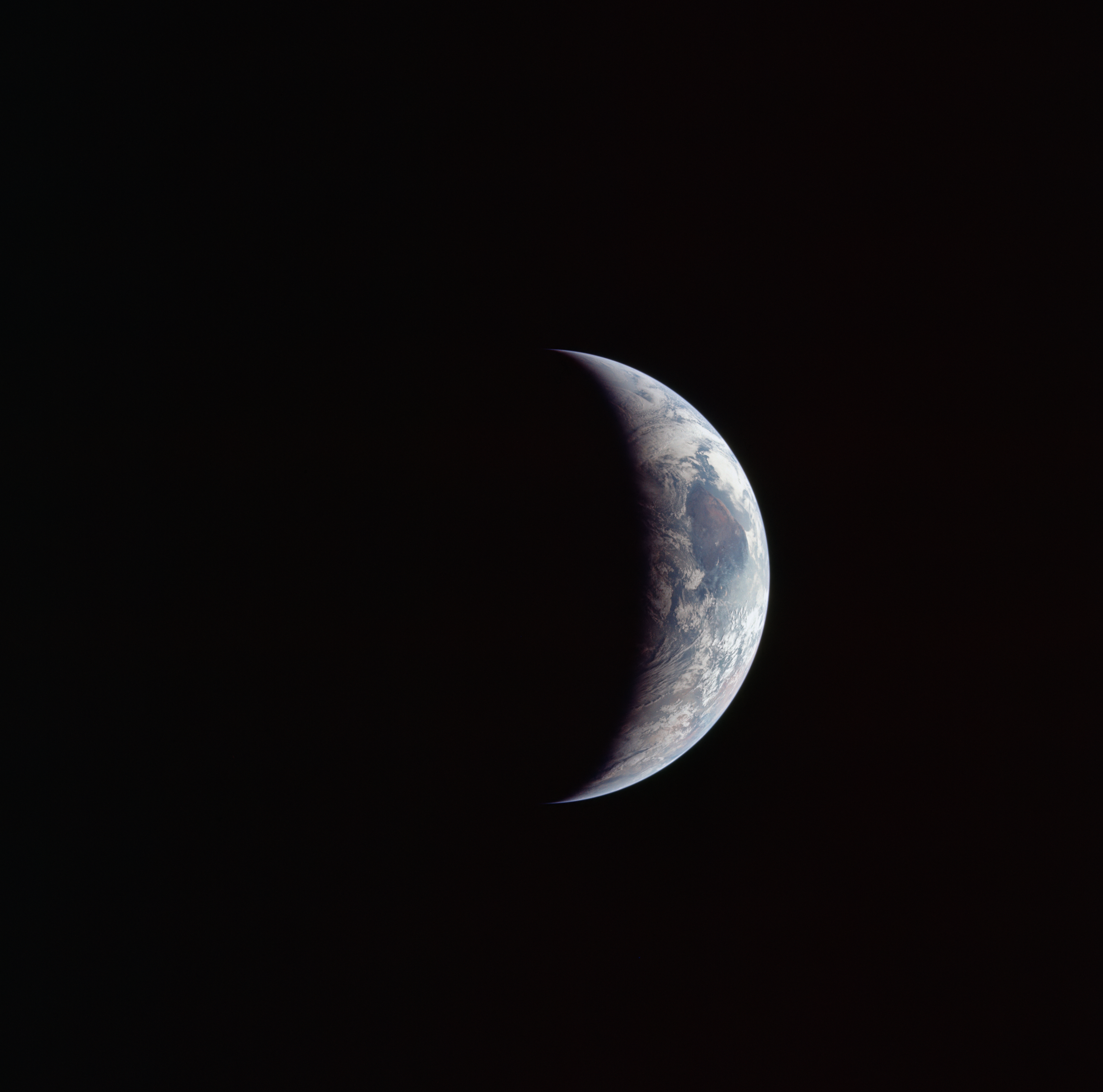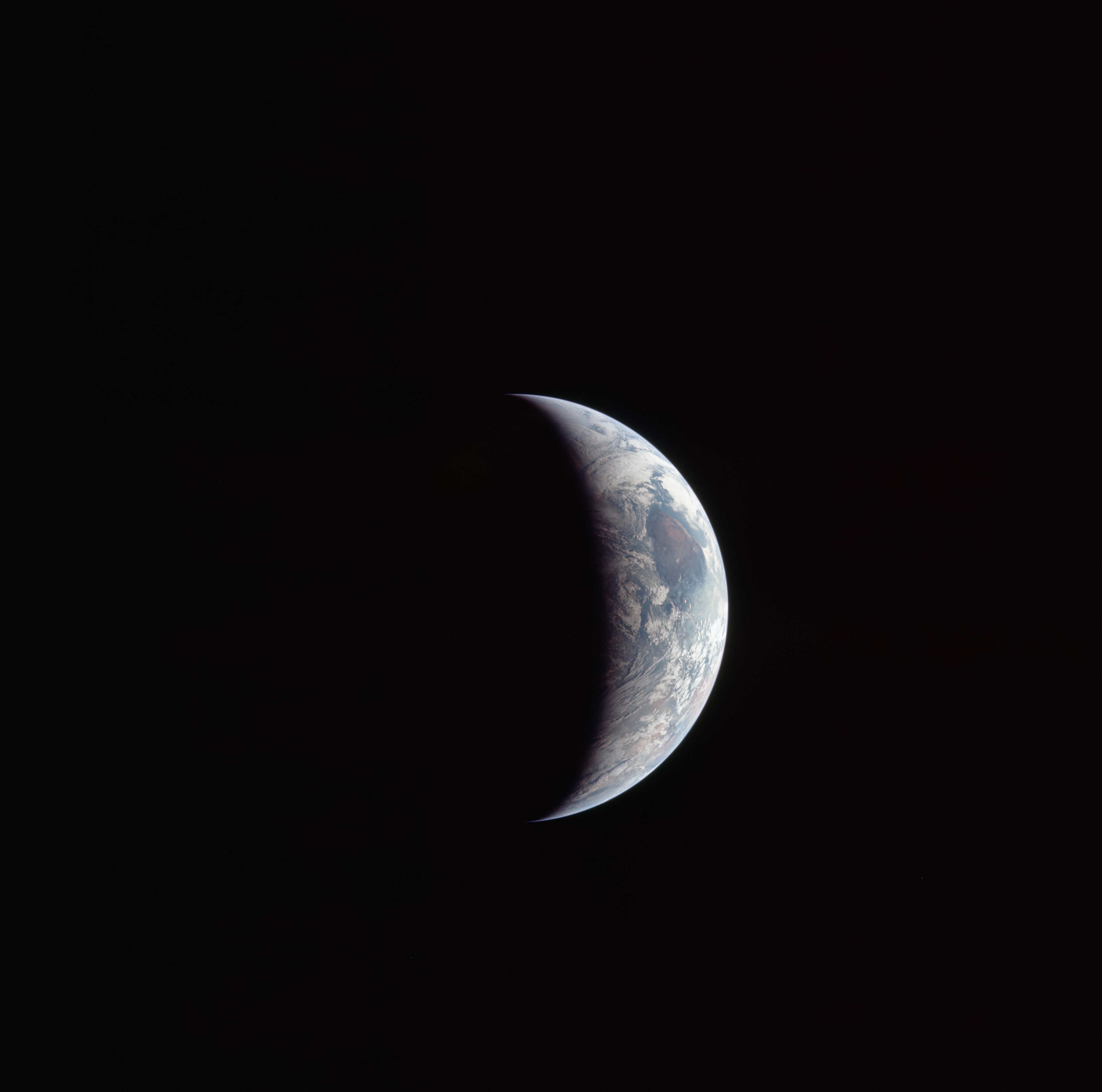AS11-44-6693 - Earth during approach. South is up. Namibia is on the bottom right. 80-mm lens. Image credit: Image Science and Analysis Laboratory, NASA-Johnson Space Center.
