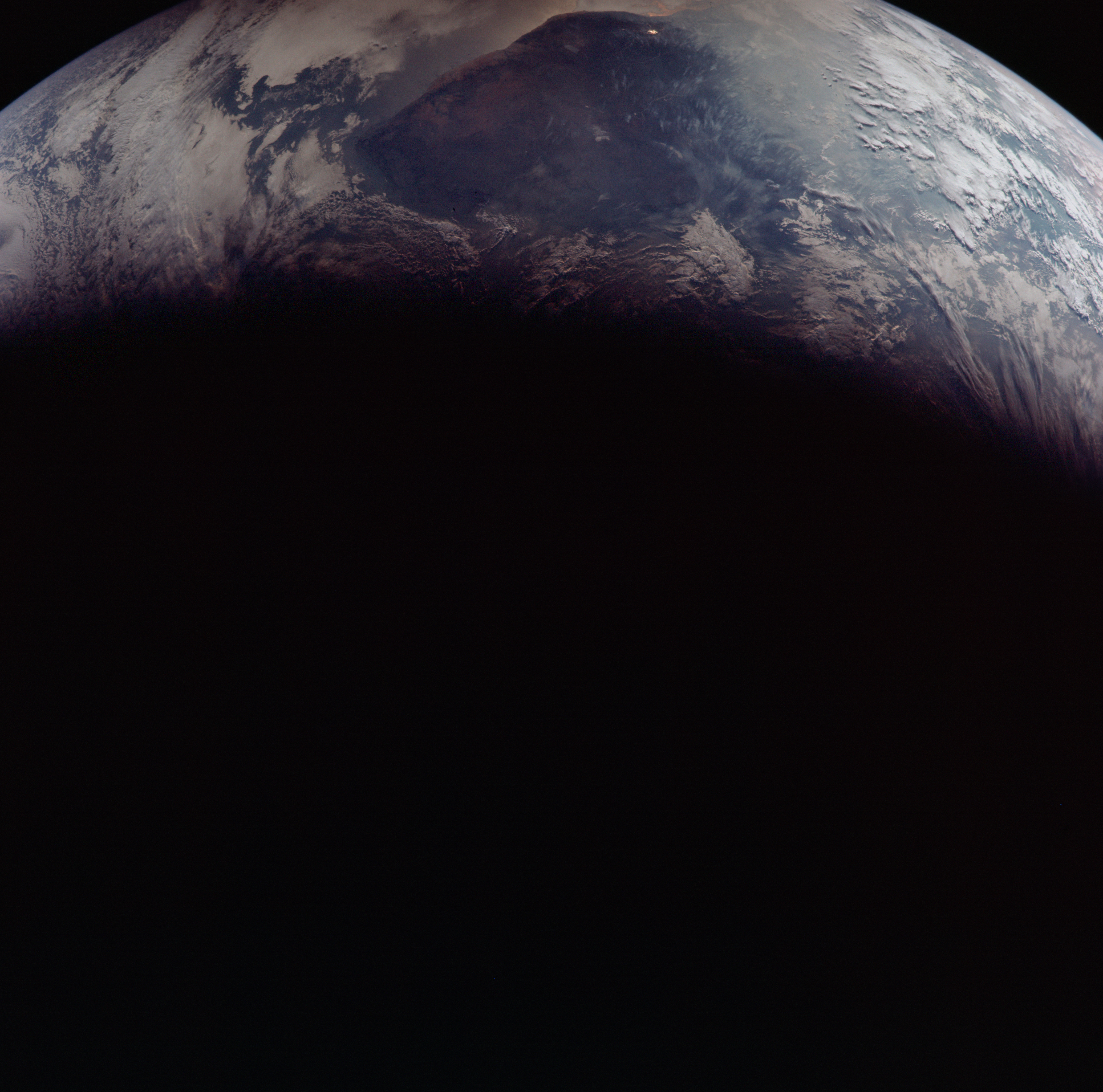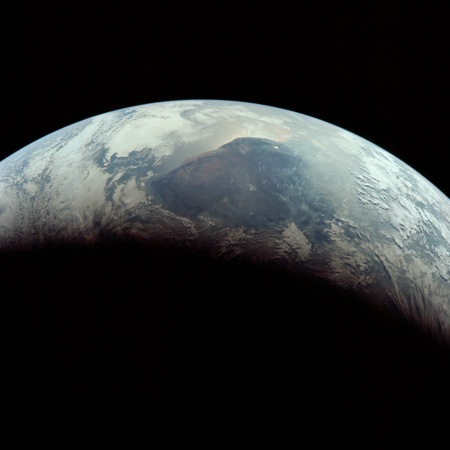 AS11-44-6676 - Earth at about 63,000 km or 34,000 nautical miles. Photograph taken at approximately 190:39:00. North is down. The Sun is glinting off the western Indian Ocean. The southern African continent is at upper right with the Arabian peninsula visible as the brown patch at the extreme right of the globe. 80-mm lens. Image credit: Image Science and Analysis Laboratory, NASA-Johnson Space Center.