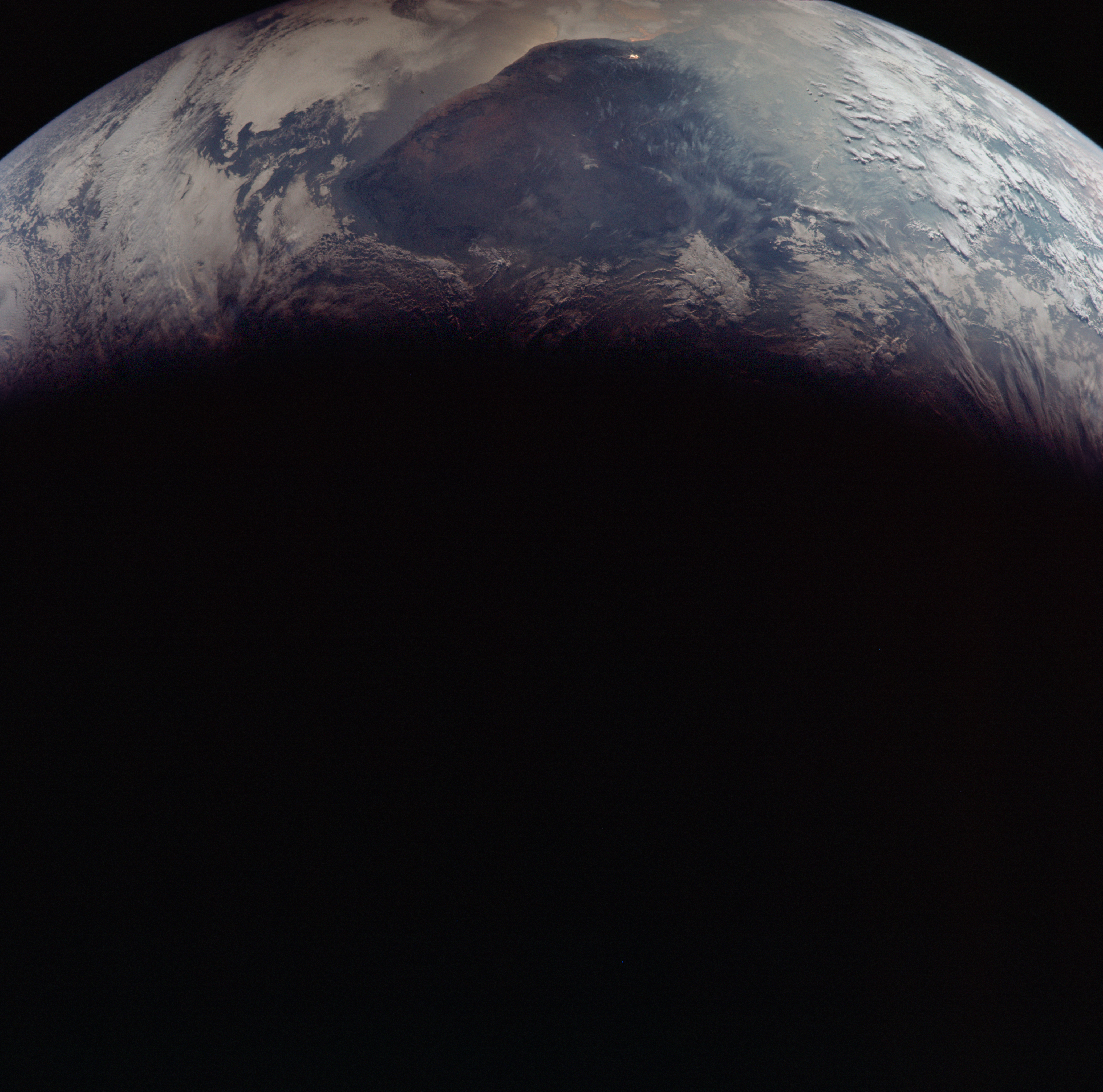 AS11-44-6692 - Earth during approach. North is to the right and the Namibian and Angolan coastline with the Atlantic Ocean is clearly visible. 80-mm lens. Image credit: Image Science and Analysis Laboratory, NASA-Johnson Space Center.