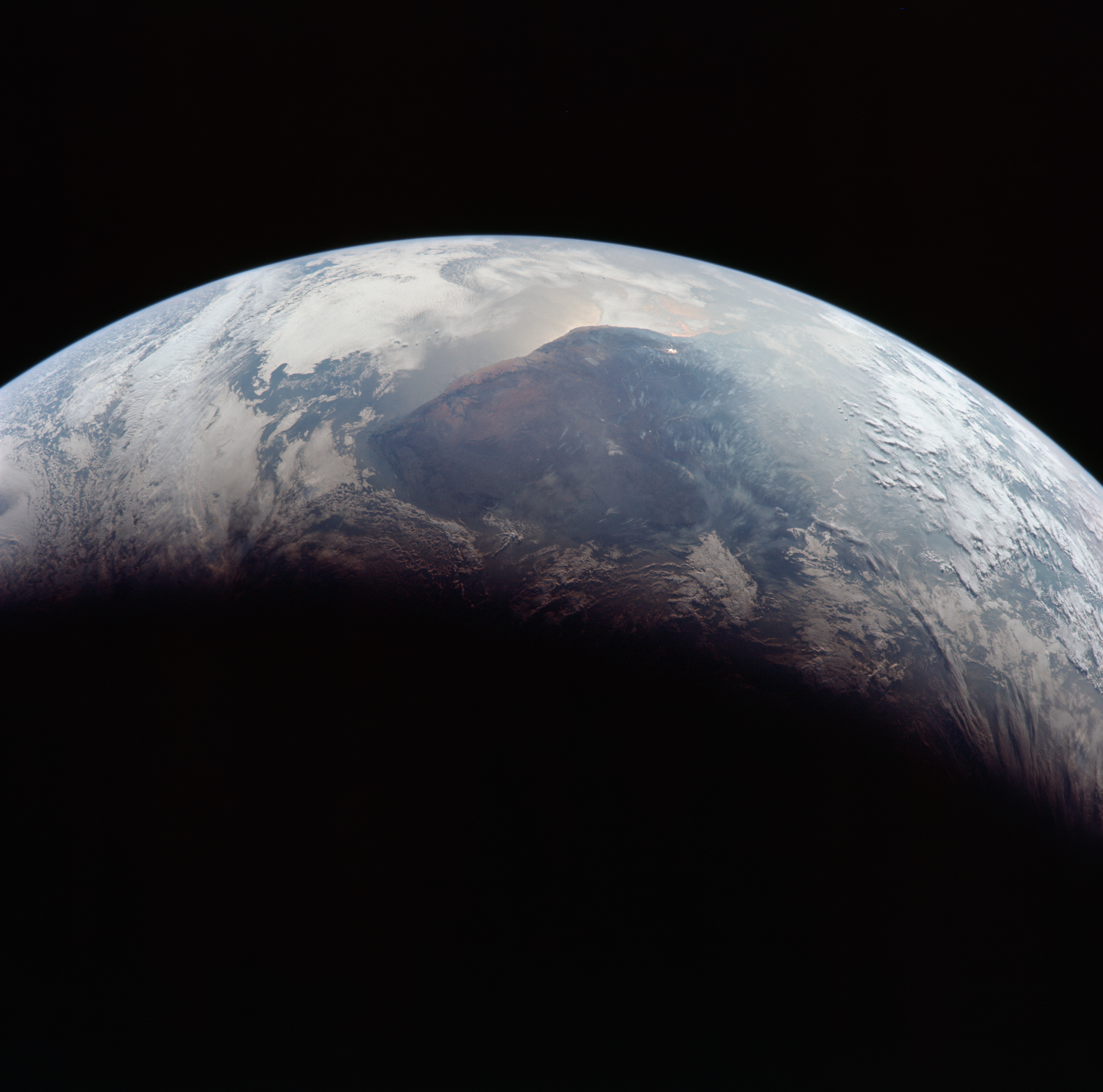 AS11-44-6691 - Earth during approach. North is to the right and the Namibian and Angolan coastline with the Atlantic Ocean is clearly visible. 80-mm lens. Image credit: Image Science and Analysis Laboratory, NASA-Johnson Space Center.