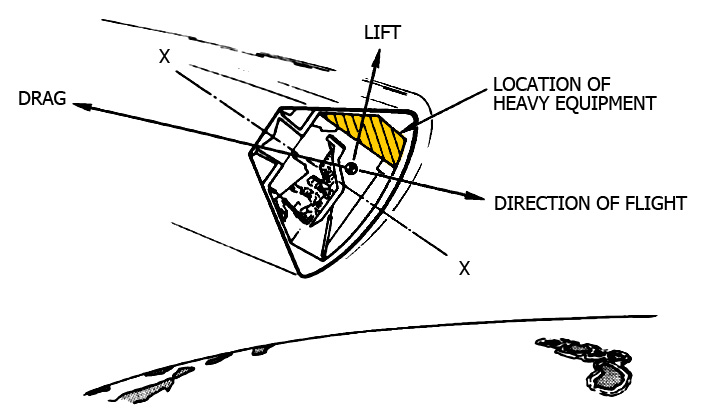 Like most capsule-type spacecraft that have flown since the space age began, the Apollo Command Module is designed to actually fly, albeit very poorly, as it comes through the atmosphere. As it passes through the air, the blunt heatshield across its base is directed into the airflow, an attitude in which it is aerodynamically stable. However, its centre of mass is deliberately offset from its geometrical centre, being placed towards the Lower Equipment Bay (LEB) and opposite the hatch and the crew's heads. This forces the craft to tilt with respect to the flight path. The angle that the heatshield presents is enough to create a lift force or vector at right angles to the direction of travel. In aerodynamic parlance, the CM has a lift/drag ratio of 0.37, a very low value but one that is effective at the hypersonic speeds of a re-entering spacecraft.